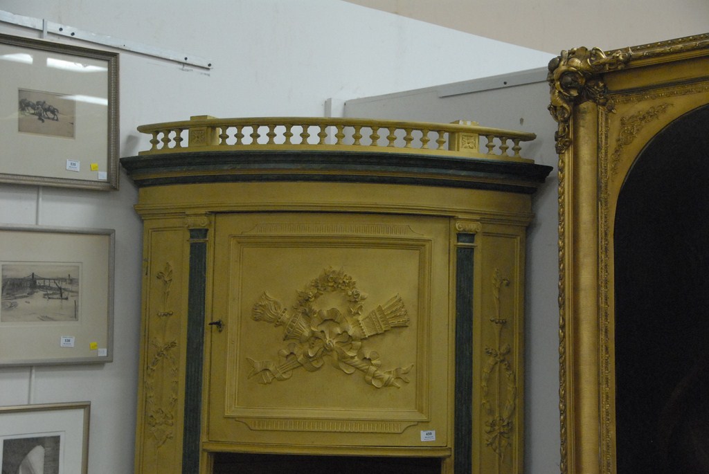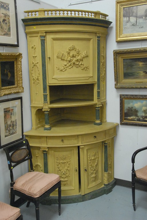 Lot 459: Pair of Continental corner cabinets in two parts, upper section with gallery top over single bowed door on base with two drawers and…