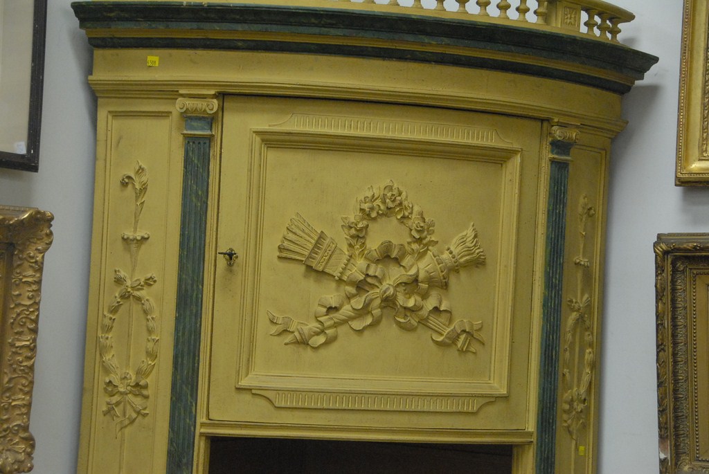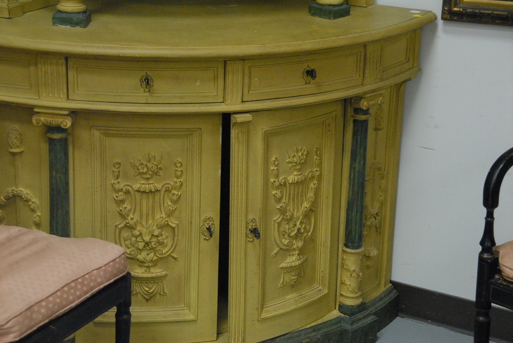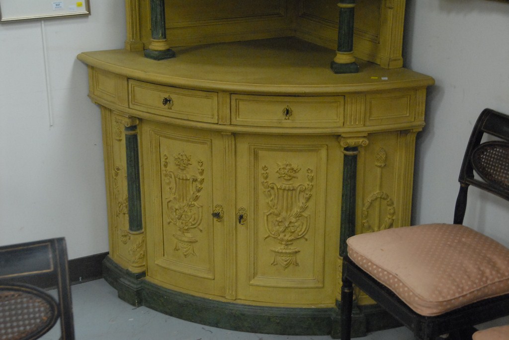 Pair of Continental corner cabinets in two parts, upper section with gallery top over single bowed door on base with two drawers and two doors, overall mustard yellow with faux green marble posts and columns, 19th century. Provenance: property from a home in Rockville Center, New York which was decorated by Iris Apfel. ht. 85in. wd. 35in. dp. 32in.