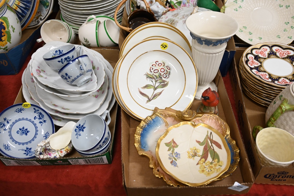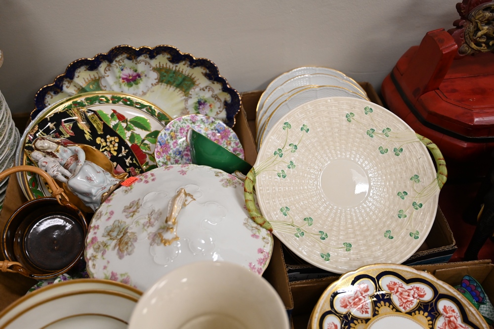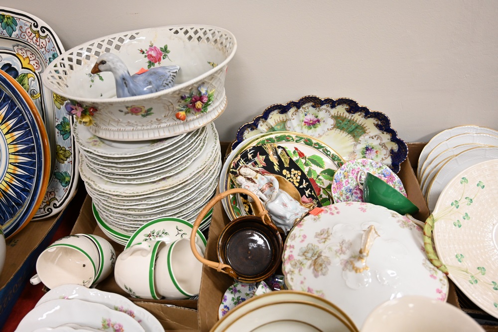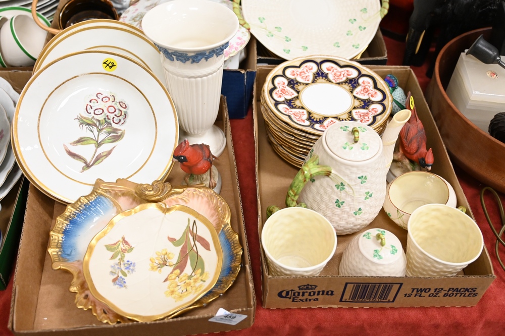 Lot 459: Six Box Lots, to include eleven Foley salad plates, eight Hutschenreuther Audubon plates, six floral plates, six Nymphenburg with floral and butterfly decoration, partial Belleek Shamrock tea set, Copeland Spode Christmas China, R.S. Prussia bowl, a set of five nesting serving plates, several various plates and bowls, along with Limoge Coronet plates.