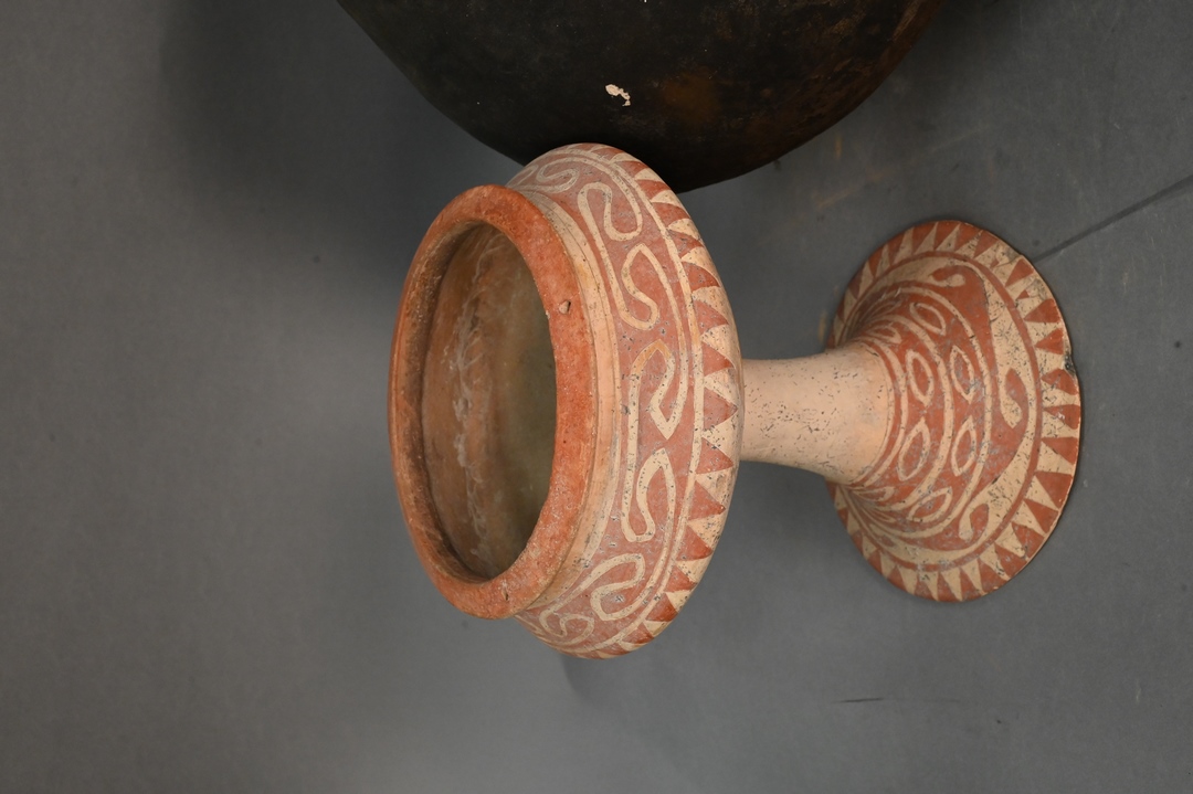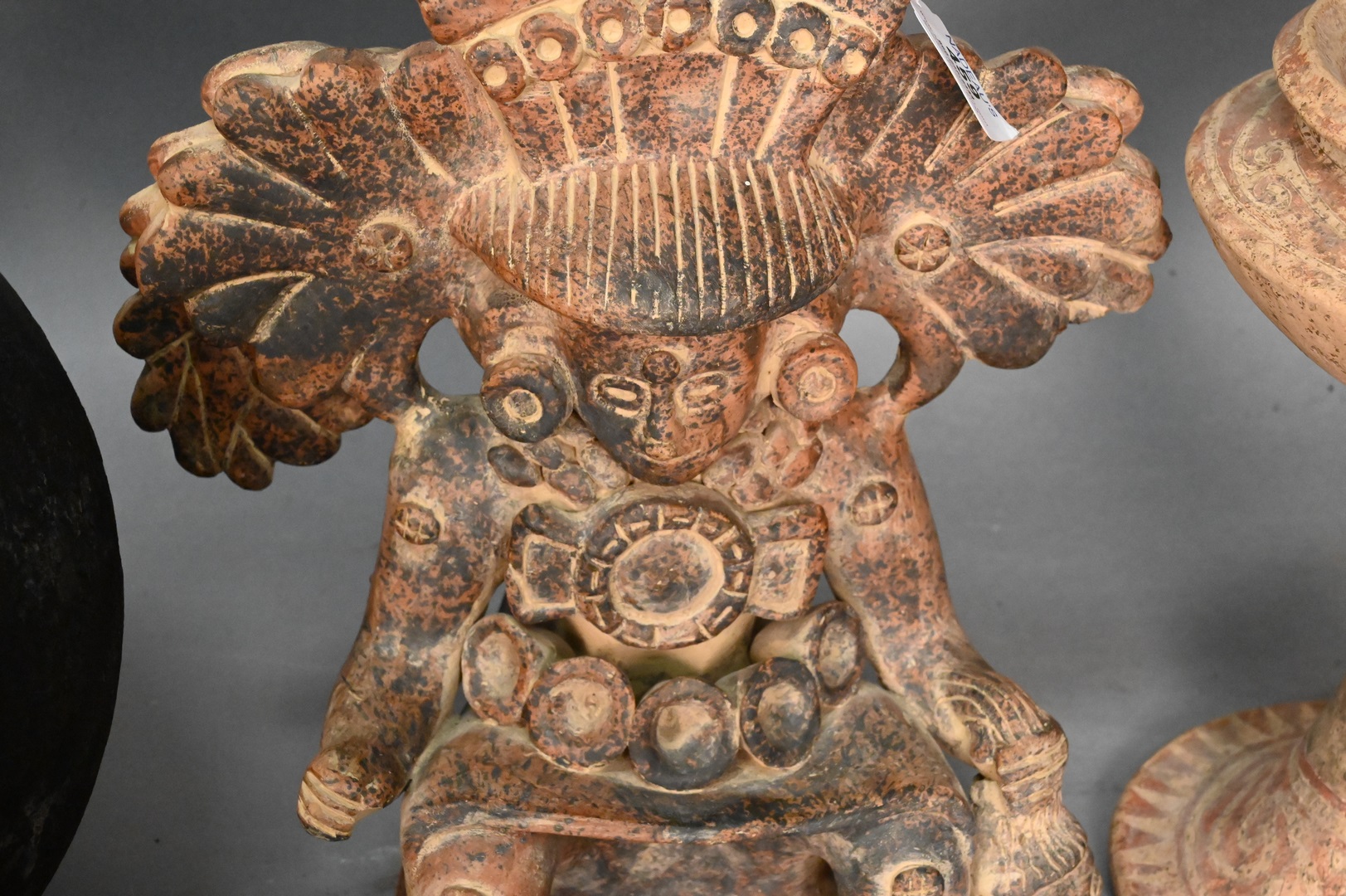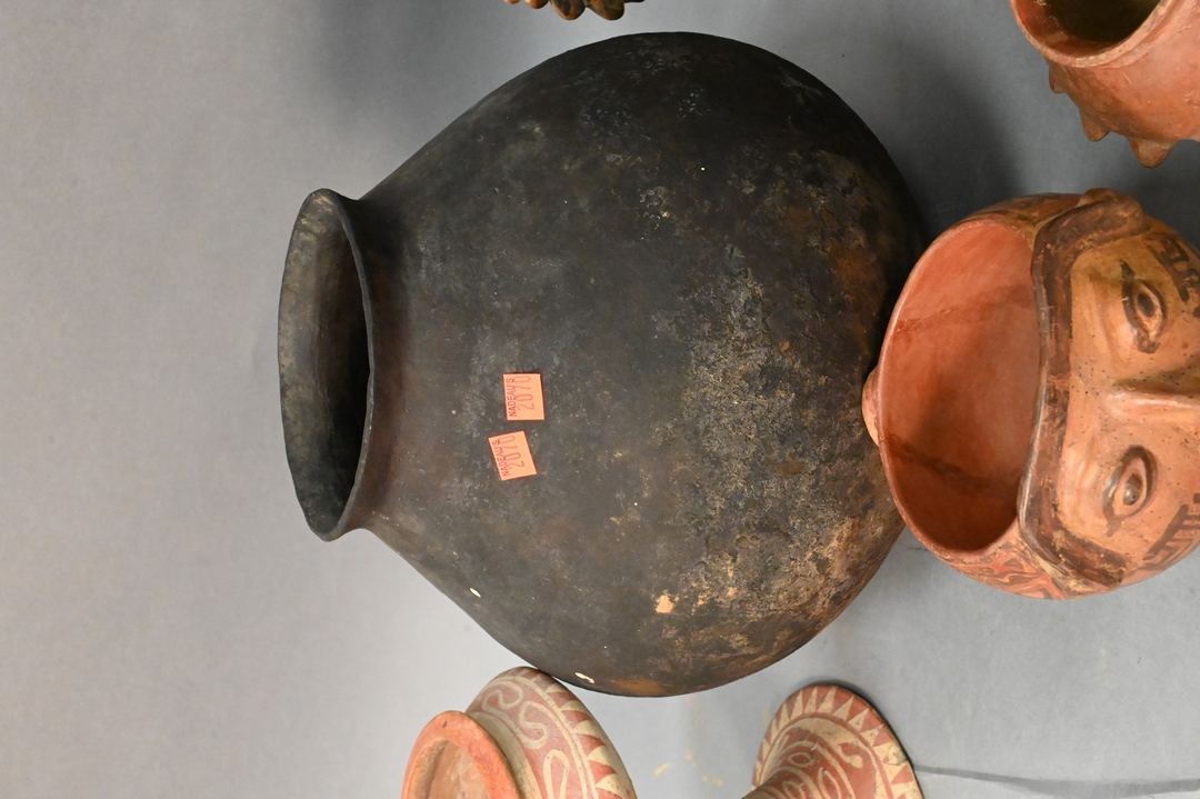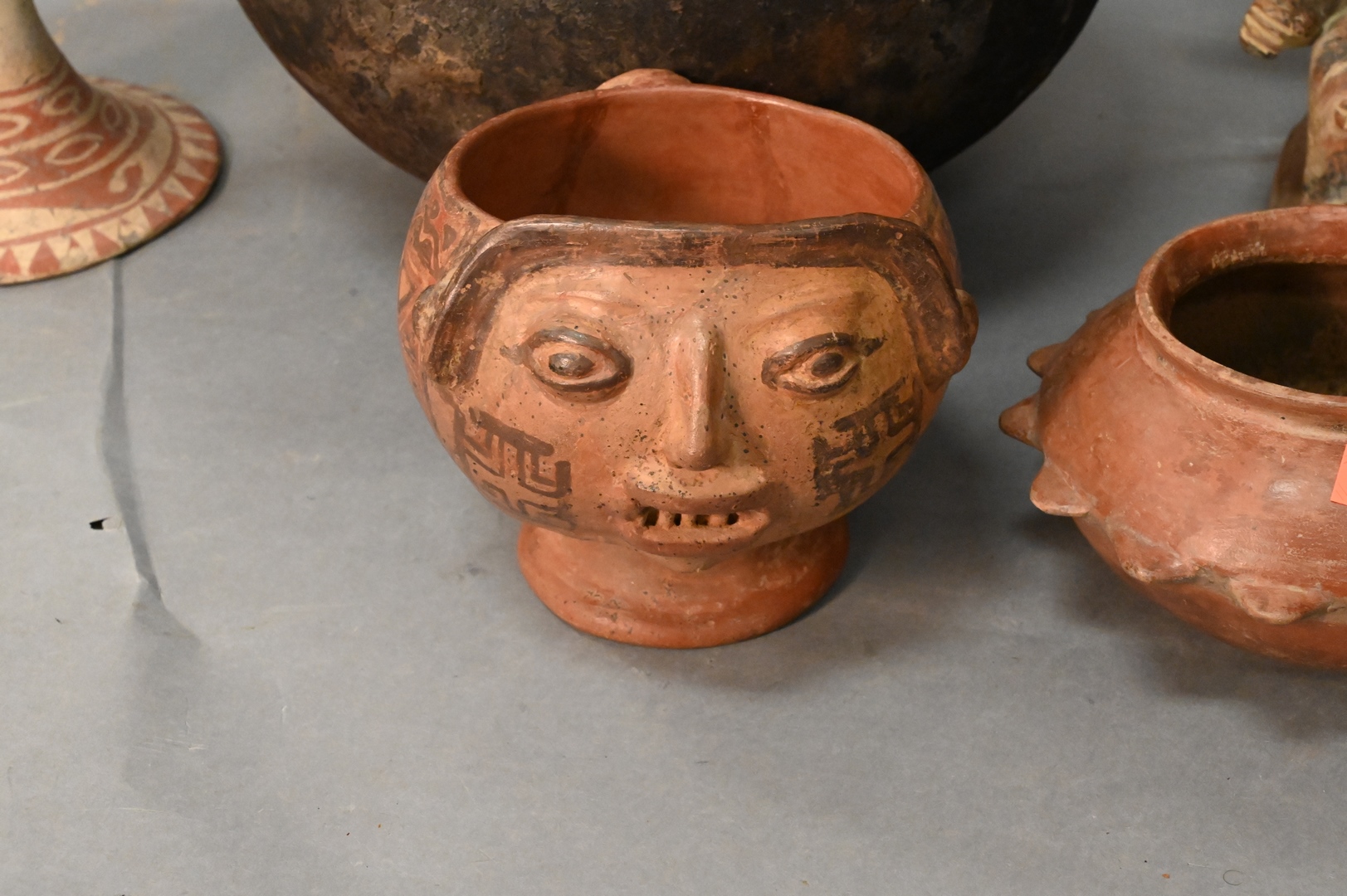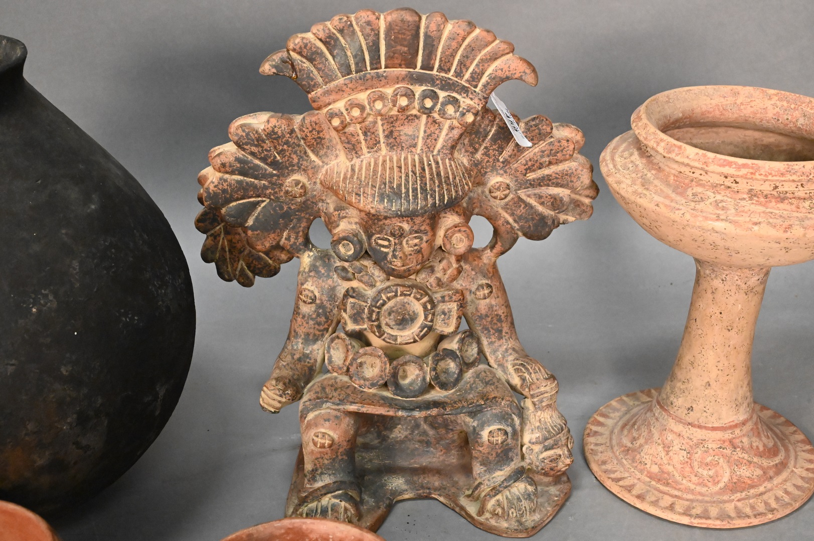 Six Piece Lot of Pre-Columbian Pottery, to include a footed portrait vessel, a rigid vessel, along with a large urn, tallest 13 inches; along with three pieces of Columbian pottery, to include a near pair of vases with free flowing design, along with a seated figure statue, tallest 13 1/4 inches.