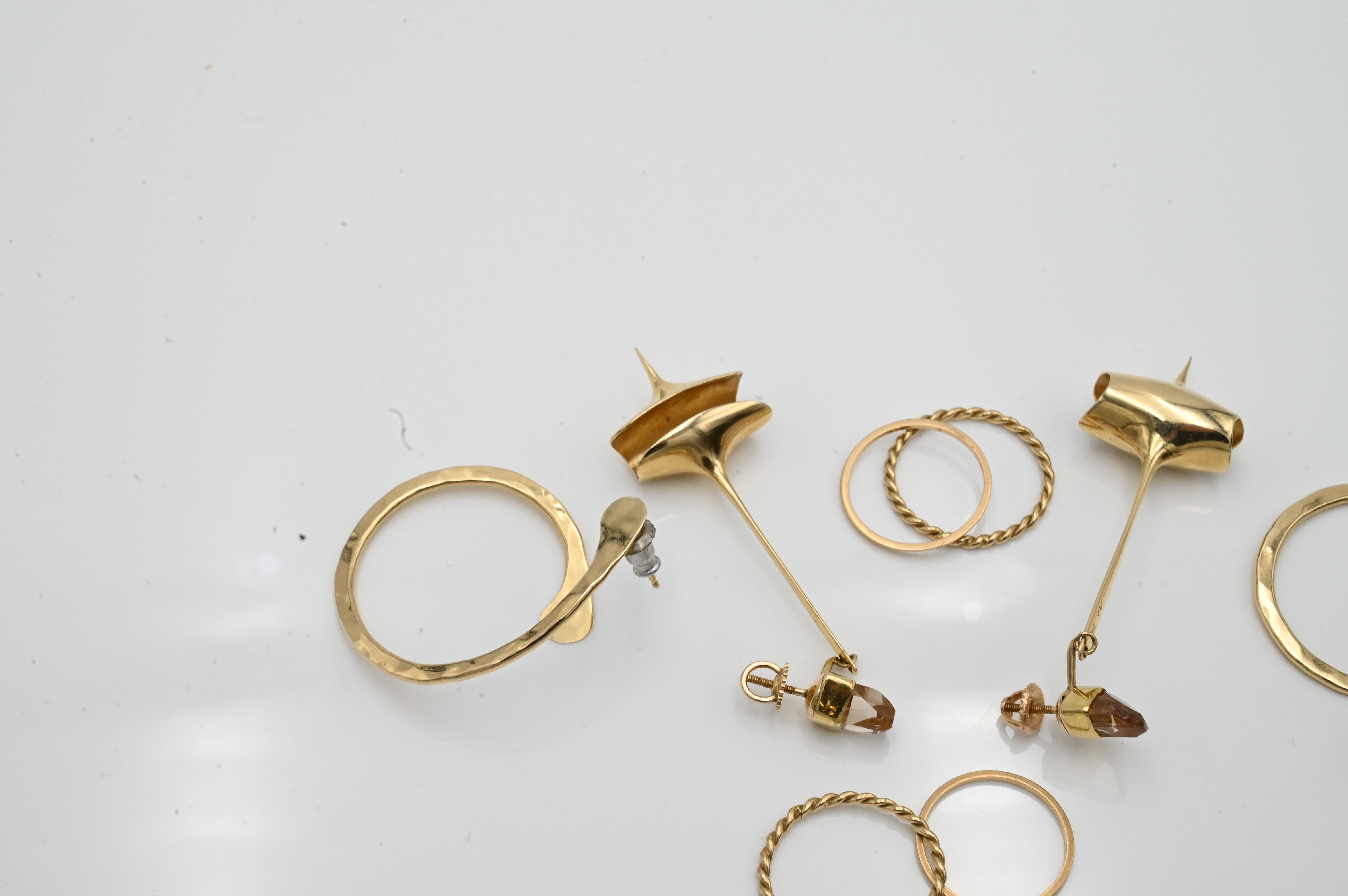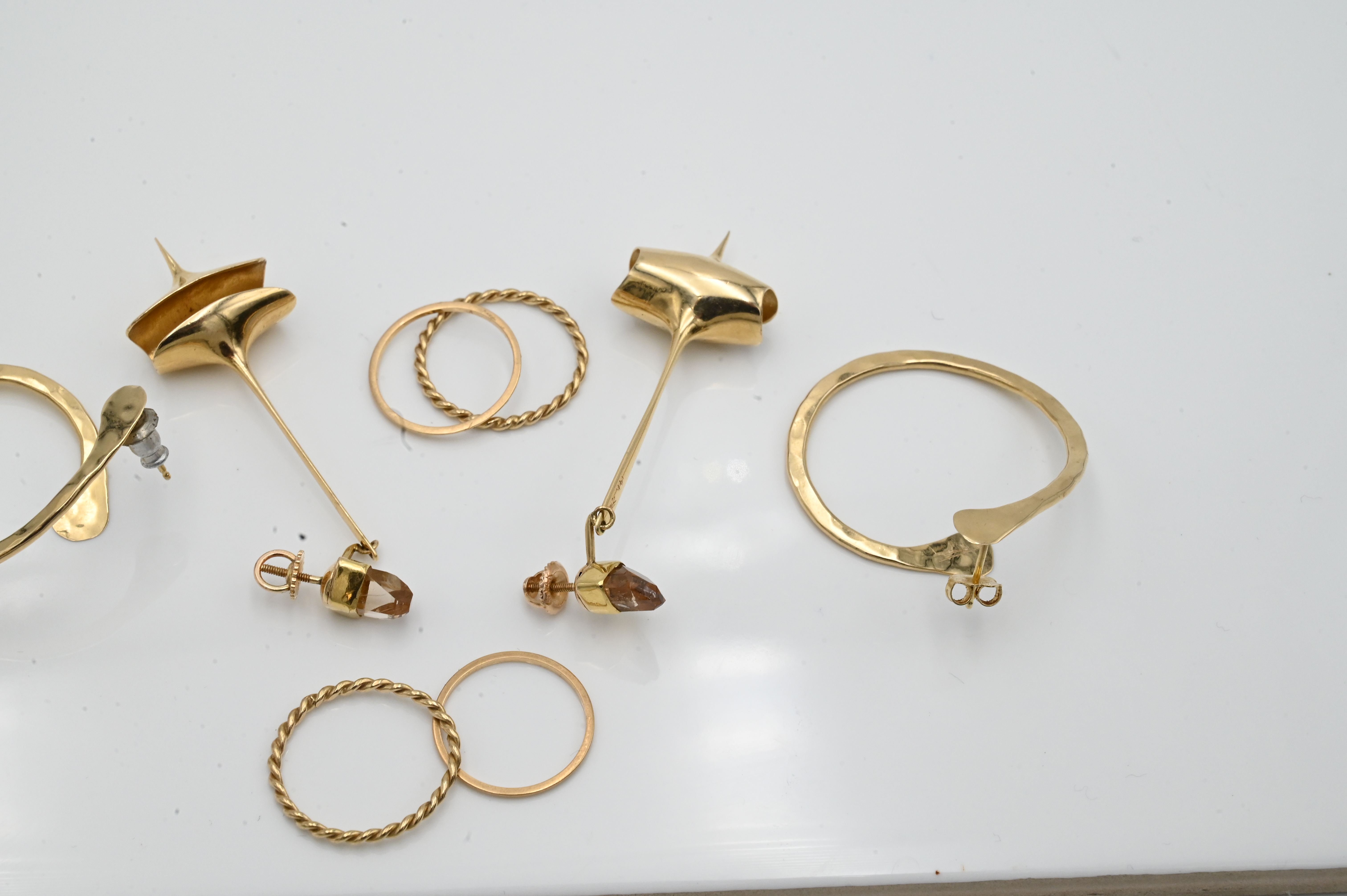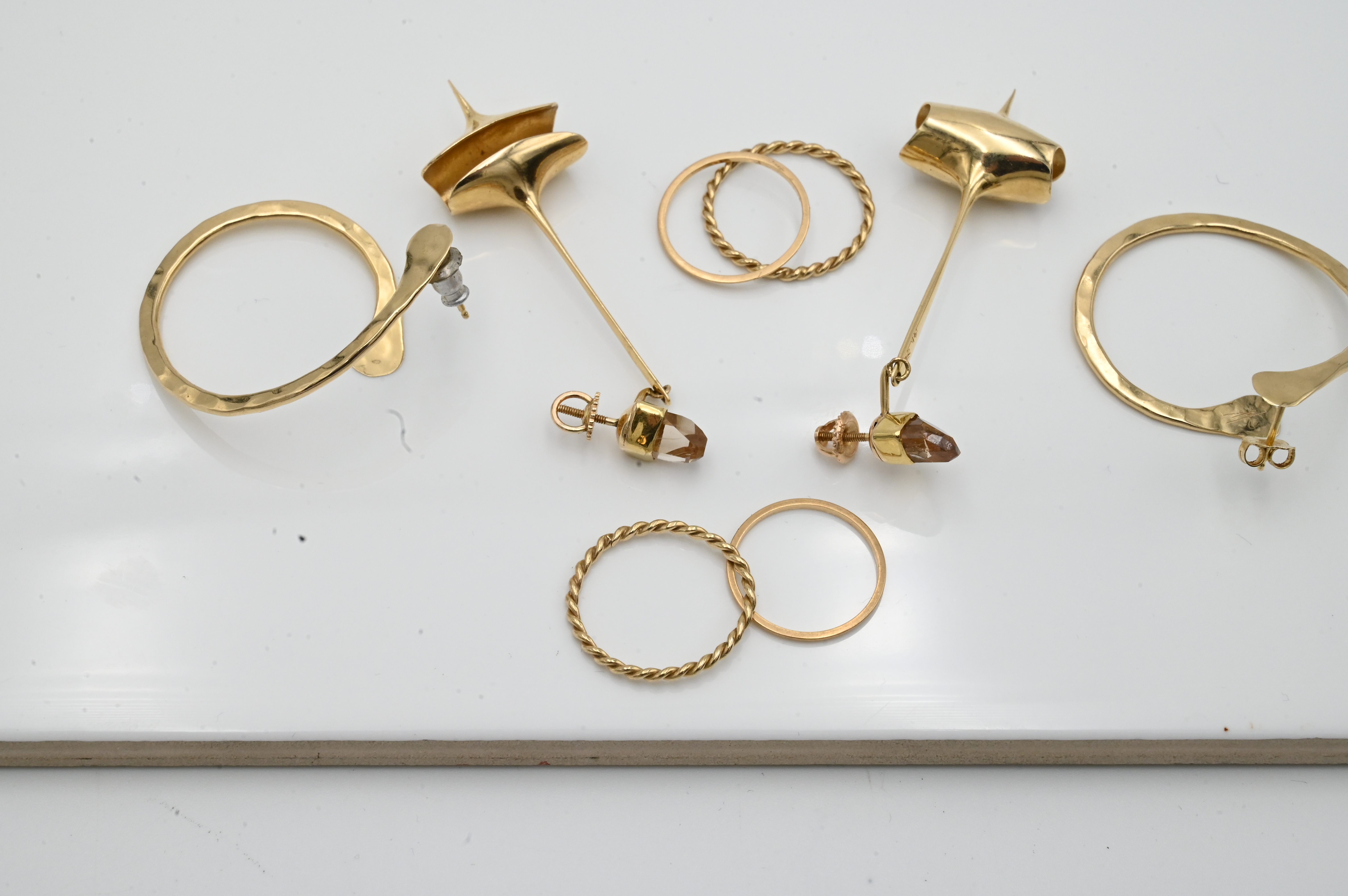 14 Karat Yellow Gold Lot, to include four small rings, along with two pairs of pierced earrings, 22.8 grams.