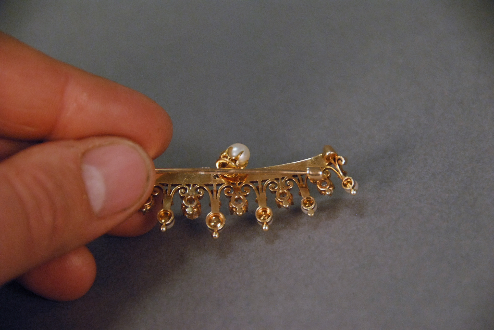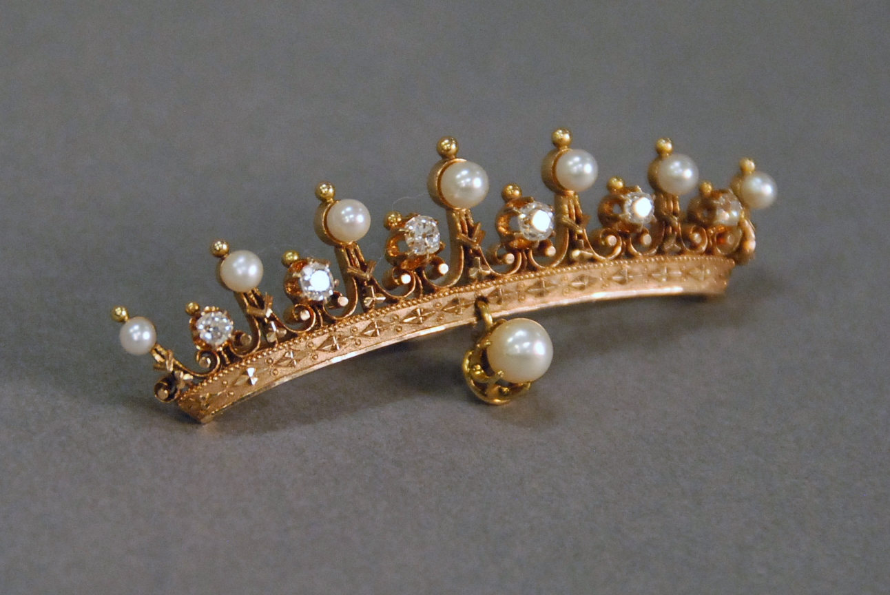 14K rose gold tiara pin set with eight pearls and six diamonds, late 19th – early 20th century.