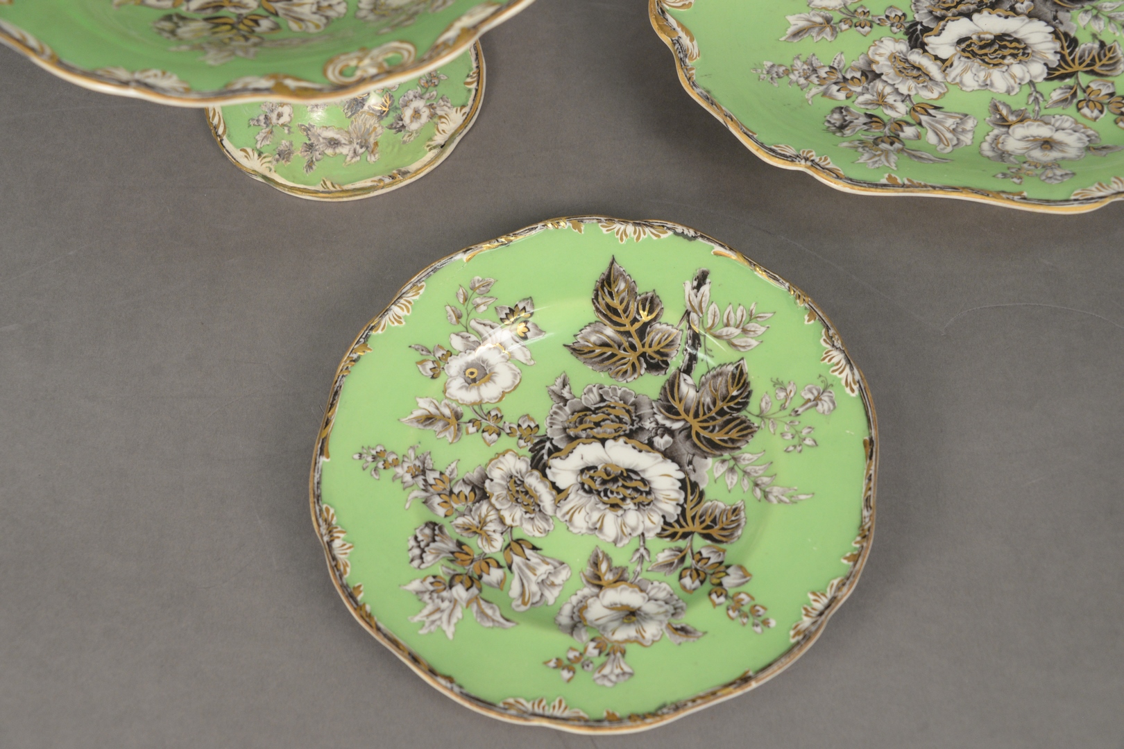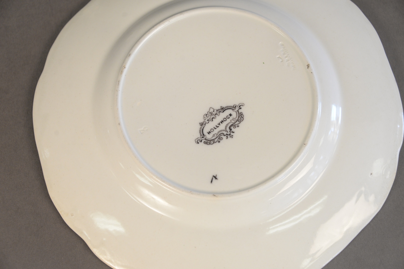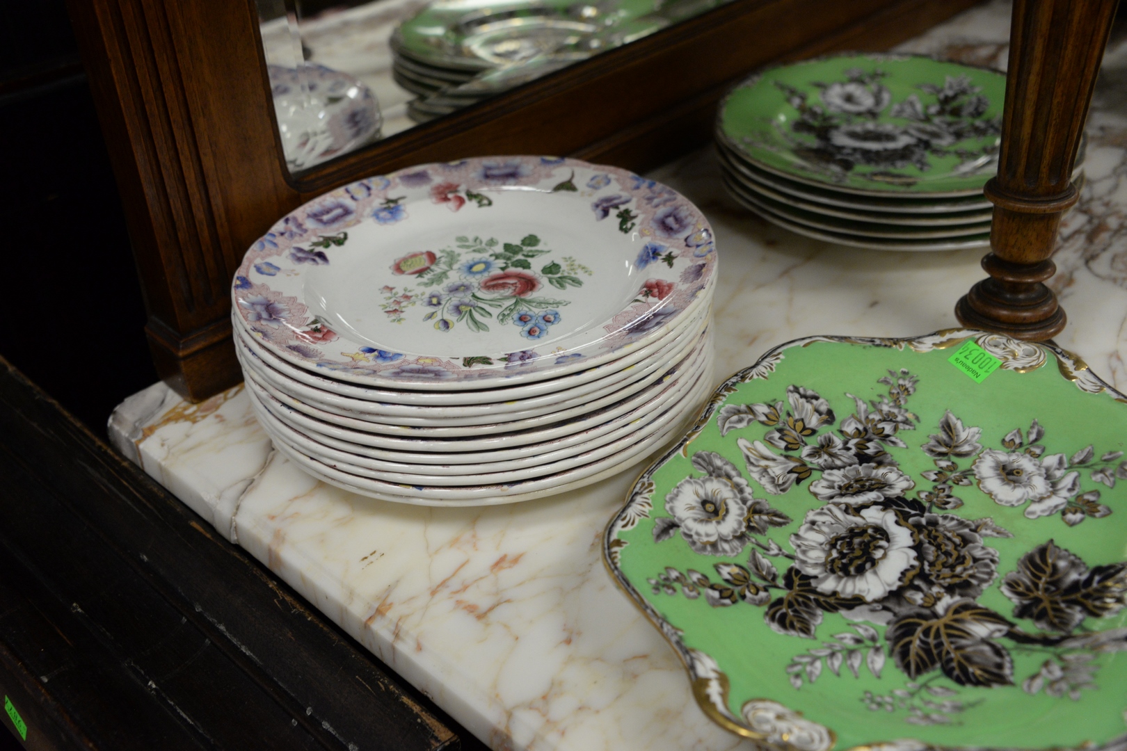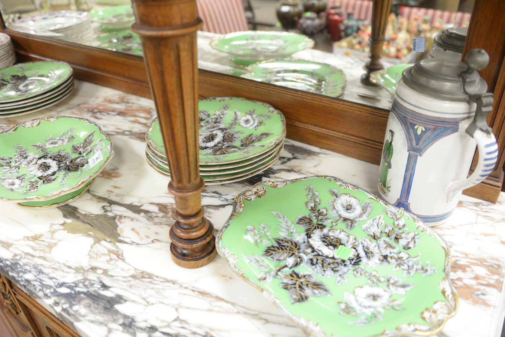 Lot 46: 26 Piece Lot, to include 14 piece set of Wedgwood Hollyhock (in rare color) plates, platters, and compote, 11 Spode New Fayence plates, along with Continental stein with pewter top, Wedgwood plate diameter 9 1/4 inches.