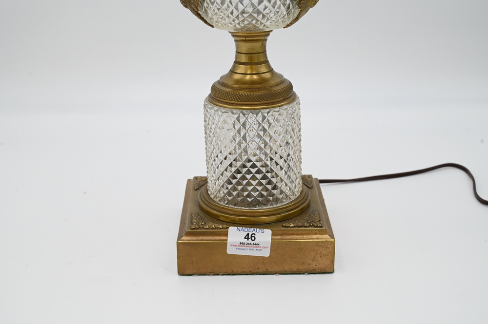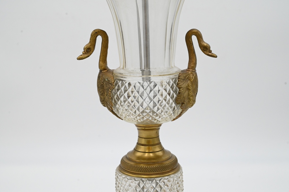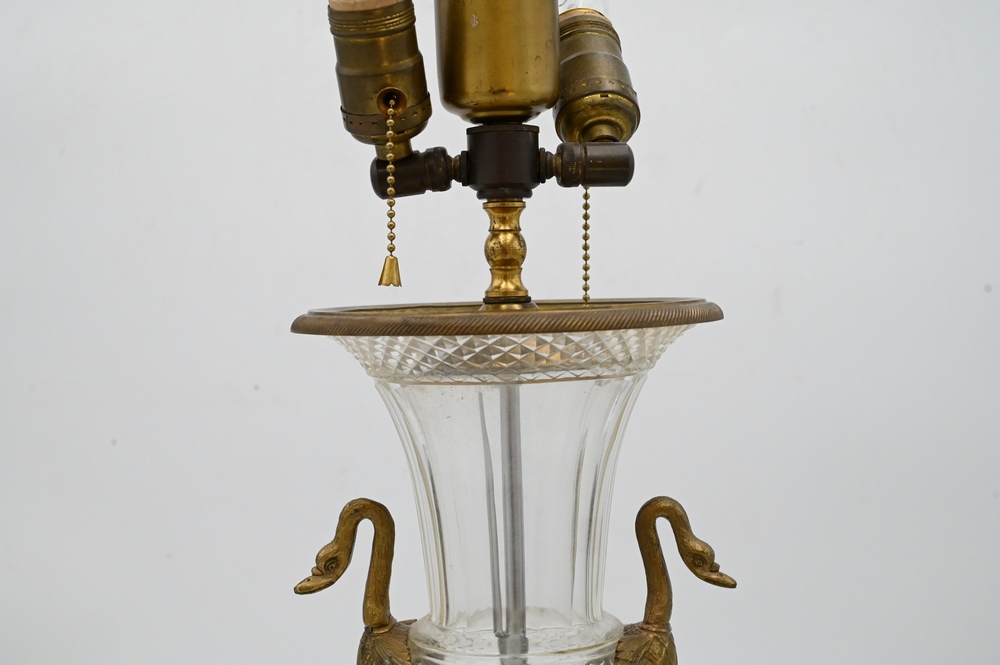 Lot 46: Baccarat Crystal Urn Form Table Lamp, having urn mounted with swan handles on cylindrical base and square foot, height 26.5 inches.