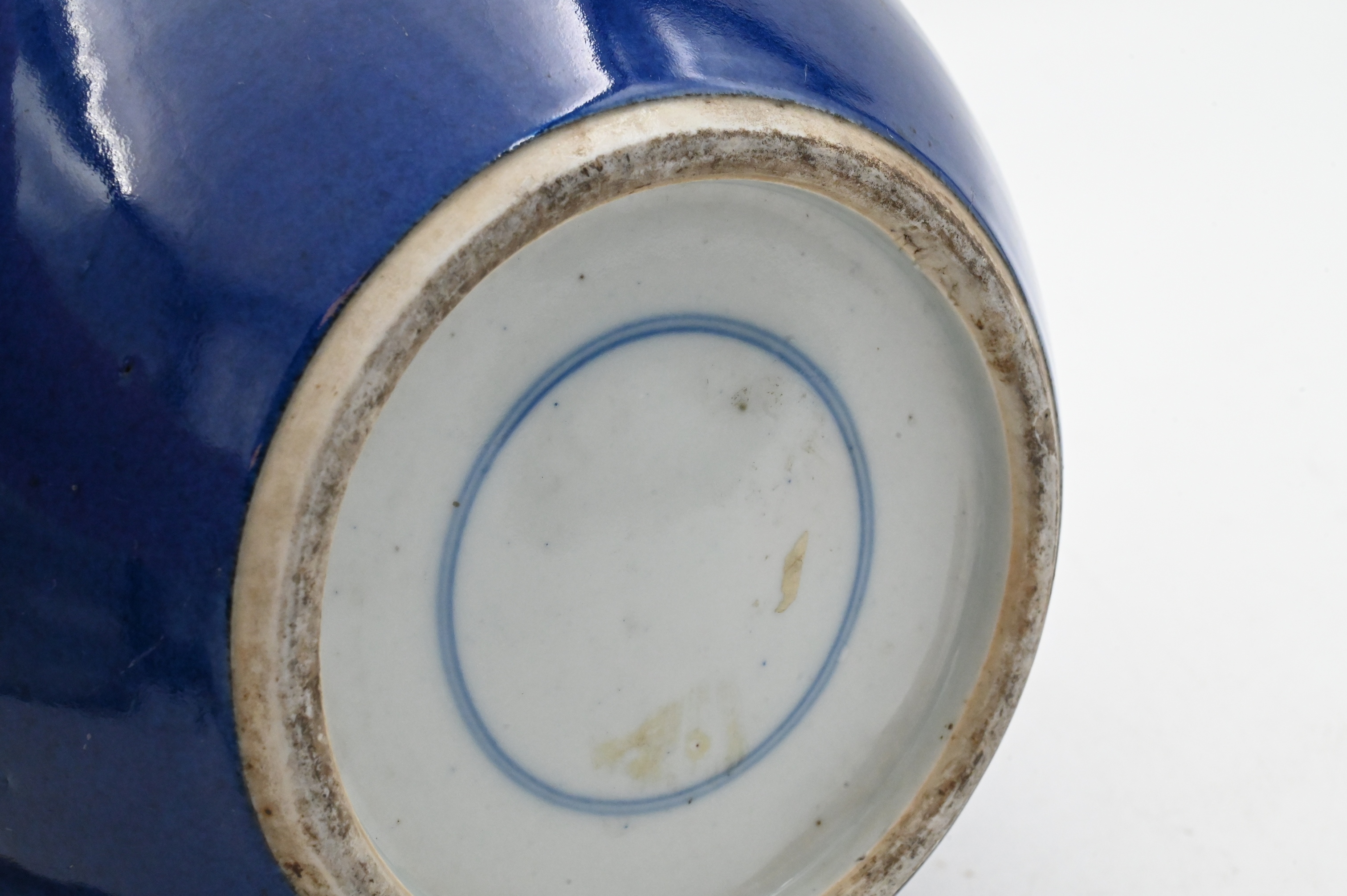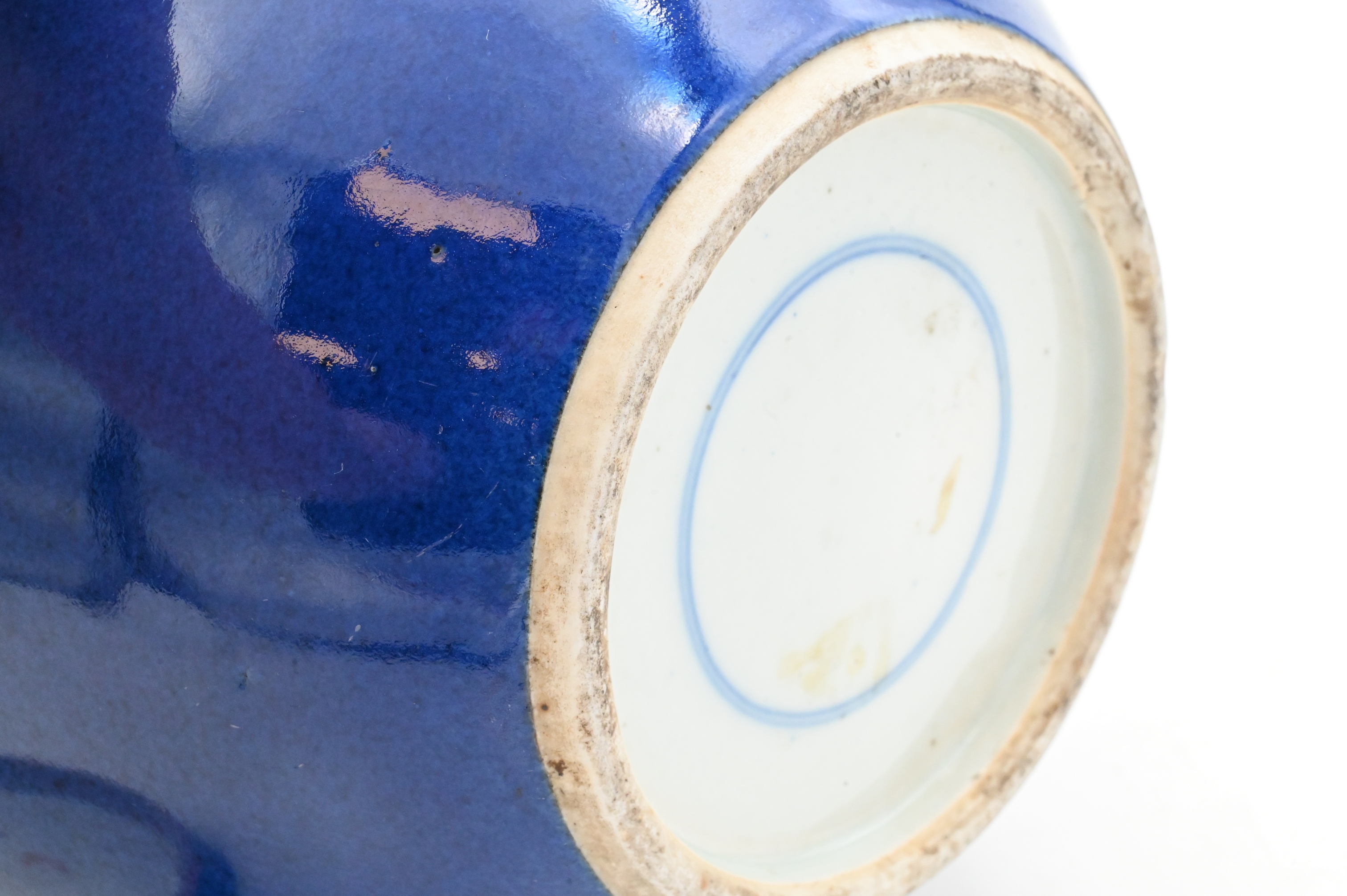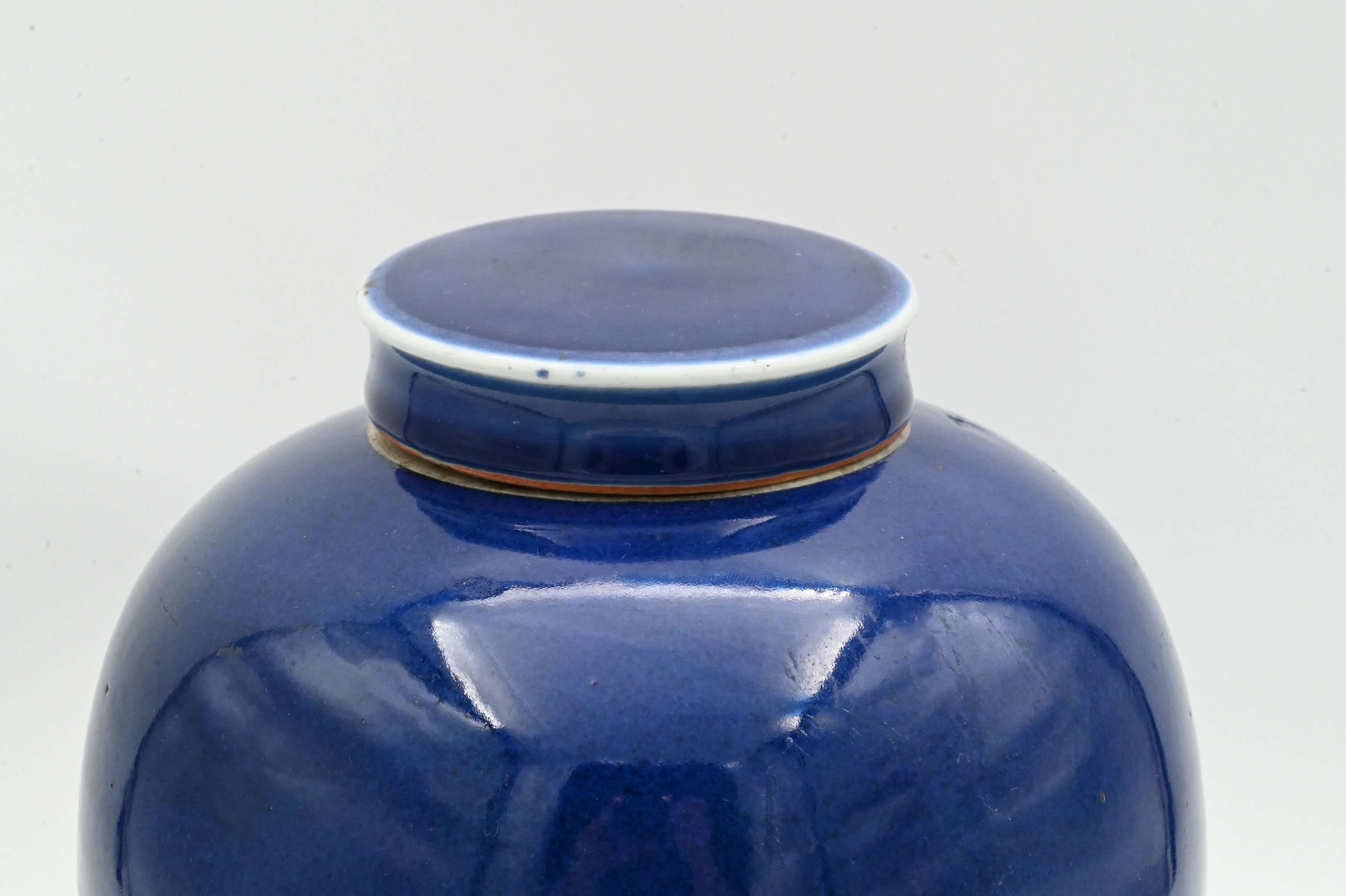 A porcelain jar of ovoid form, covered overall in a deep cobalt blue glaze with a glossy finish, the glaze stopping at the foot to reveal the biscuit, blue circle marks to underside, likely 18th/19th century