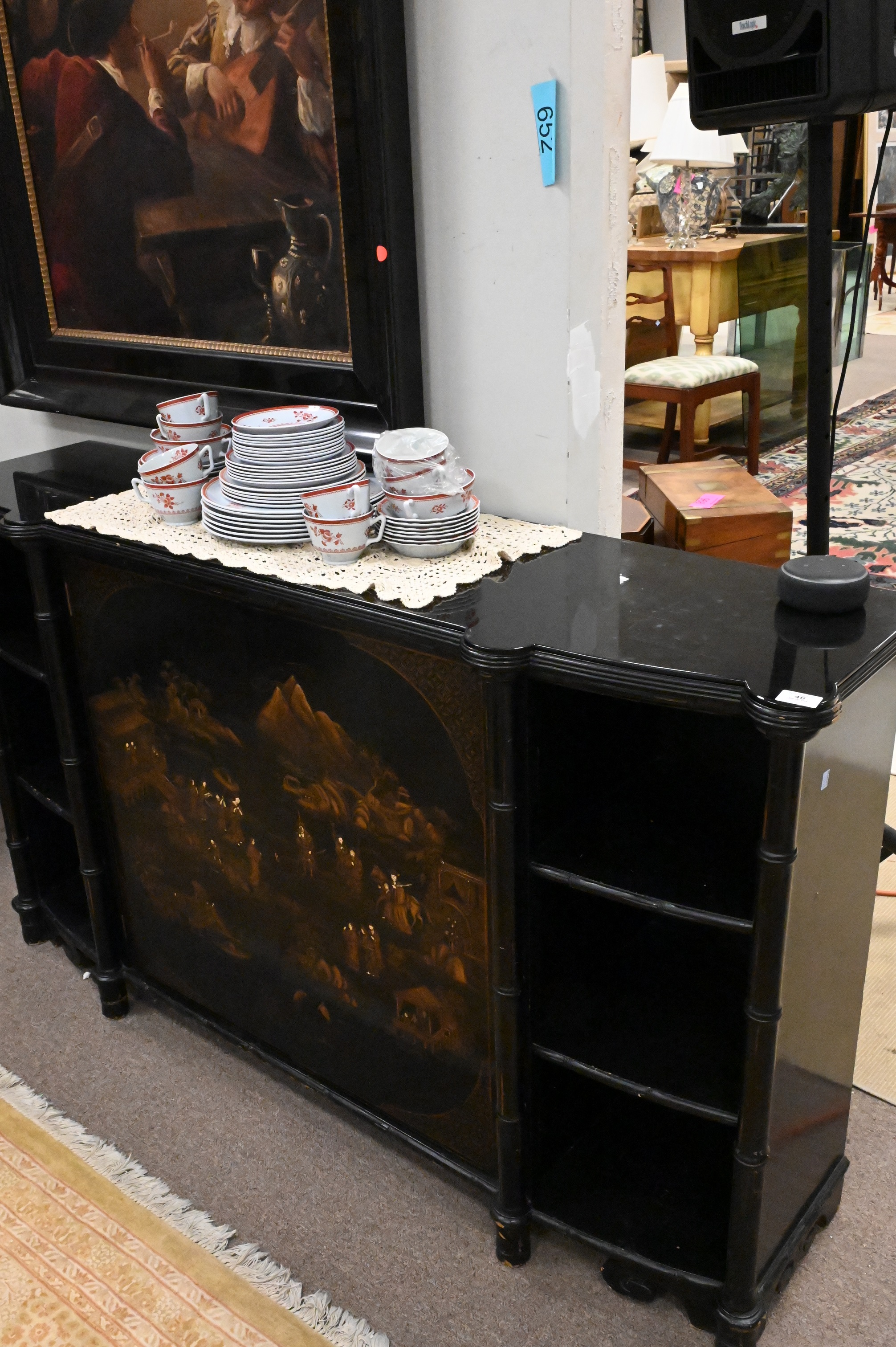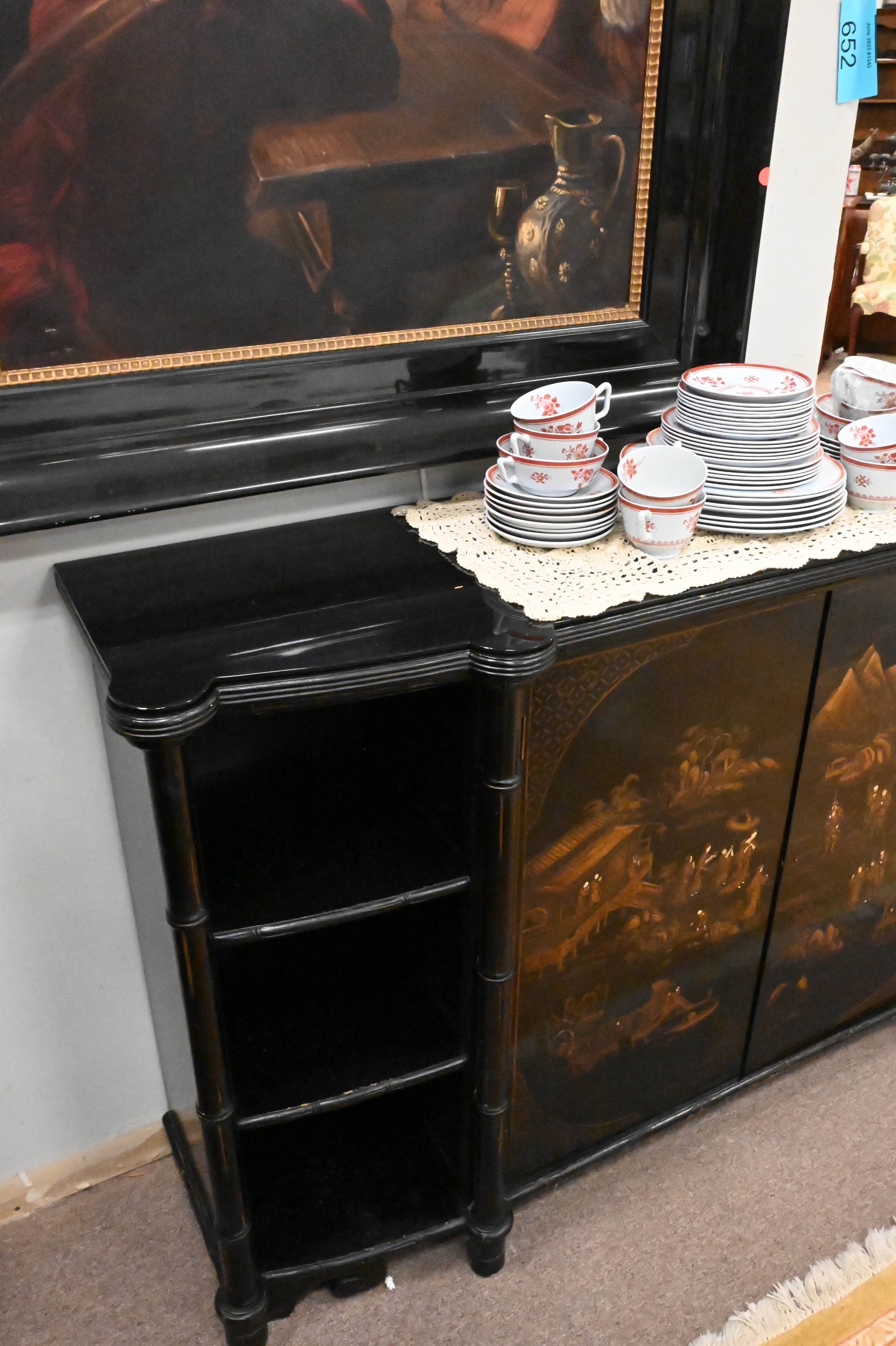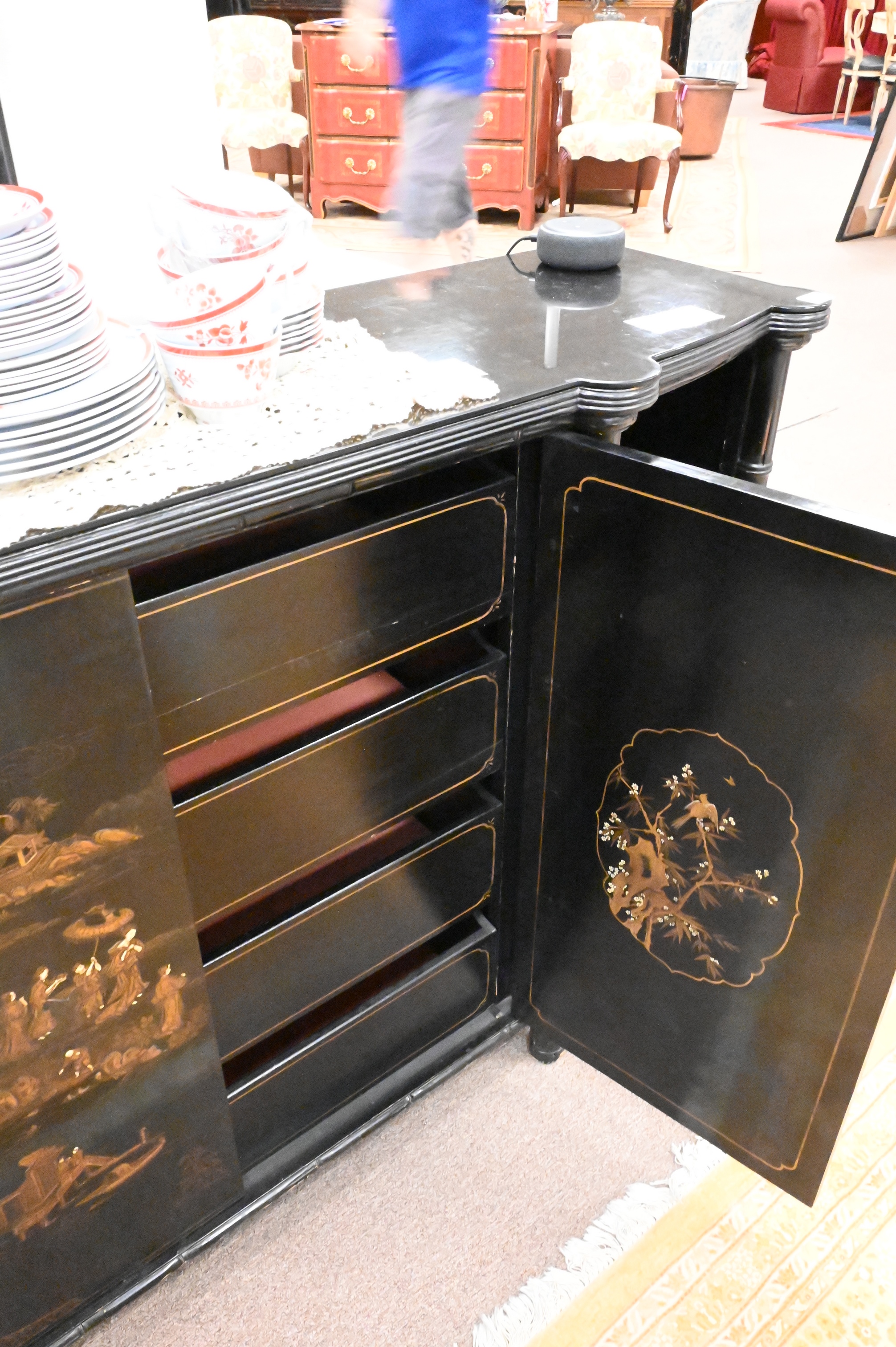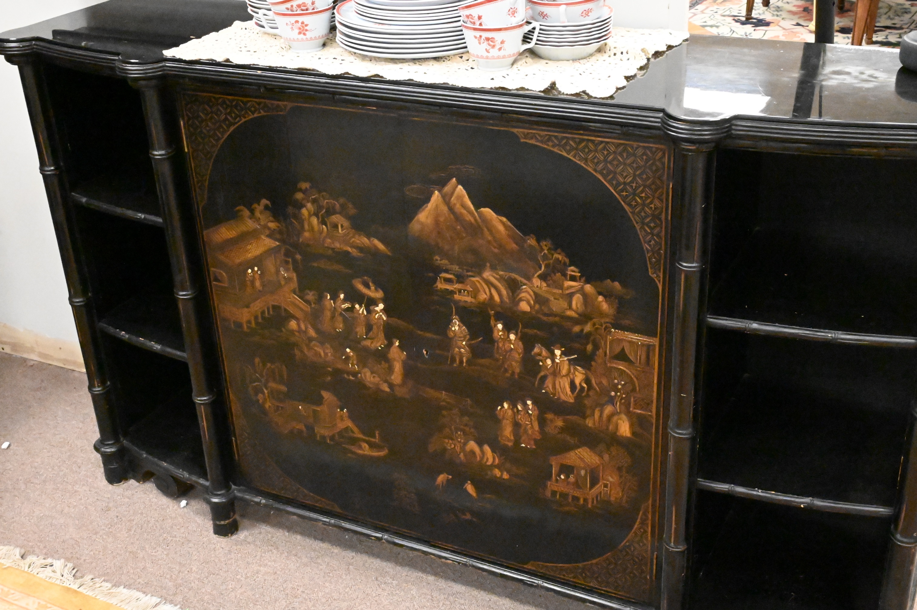 Chinoiserie Decorative Credenza, height 36 1/2 inches, top 14″ x 61 1/2″
