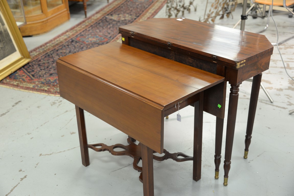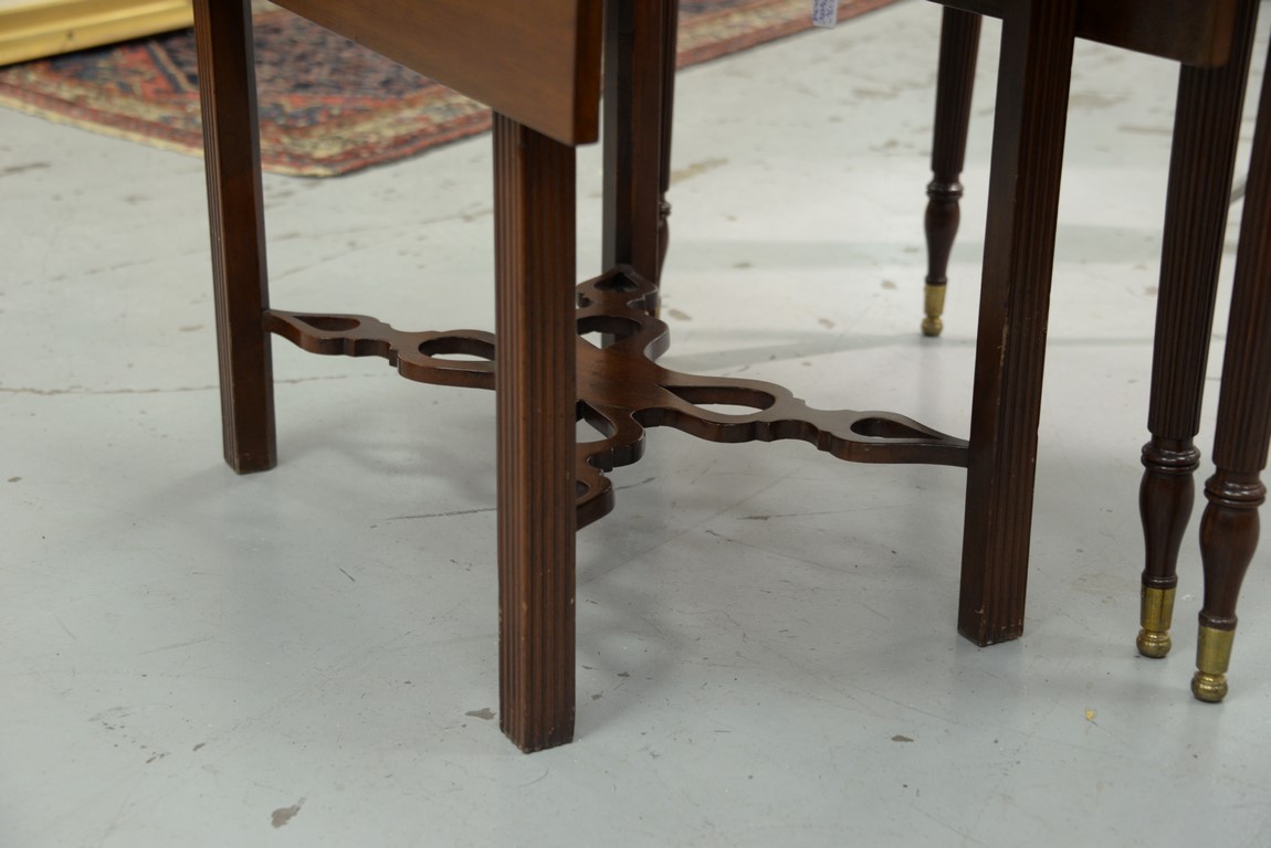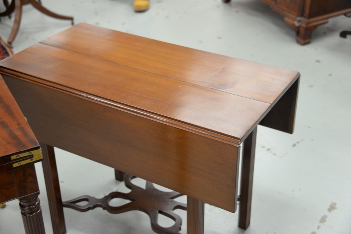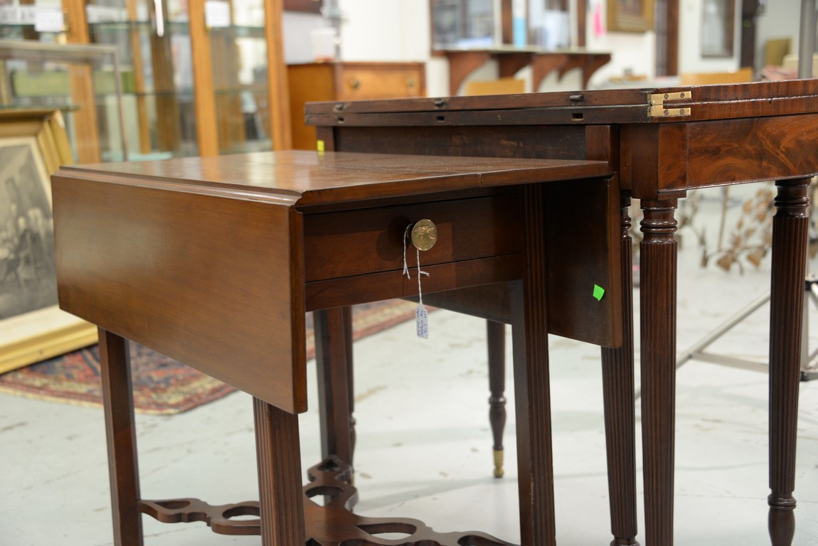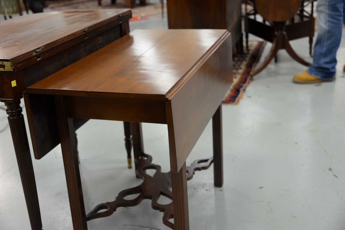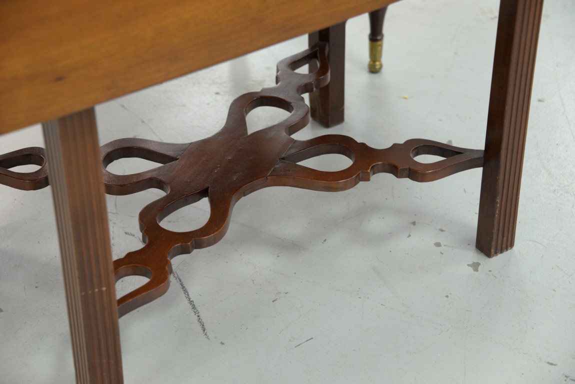 Lot 46: Chippendale cherry Pembroke table having drop leaves over frieze with drawer on reeded squared legs joined by flat X stretcher with pierced carved teardrops, brass pull with portrait of Benj. Franklin, Probably New London, Connecticut. ht. 27 1/4 in.
