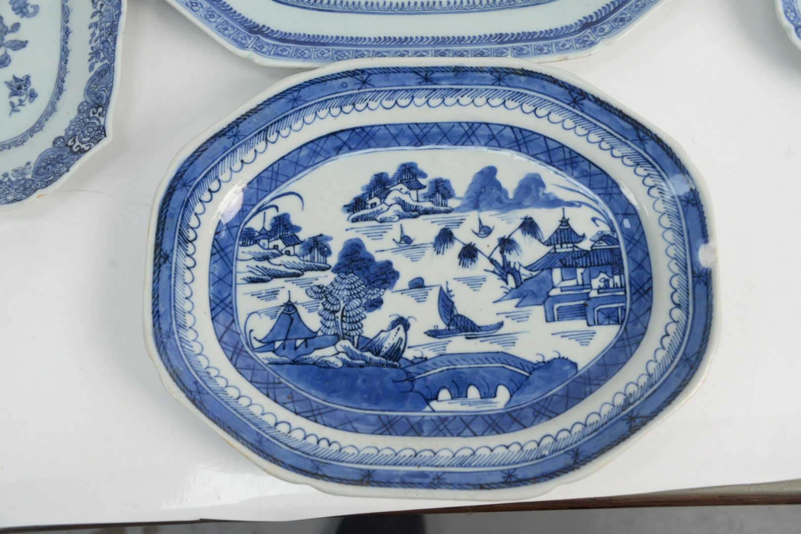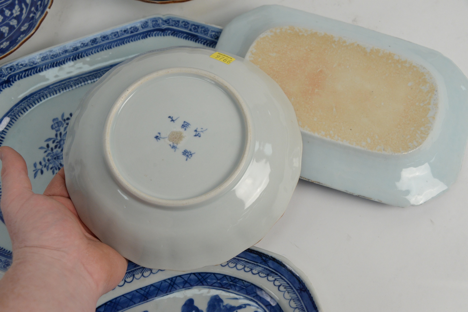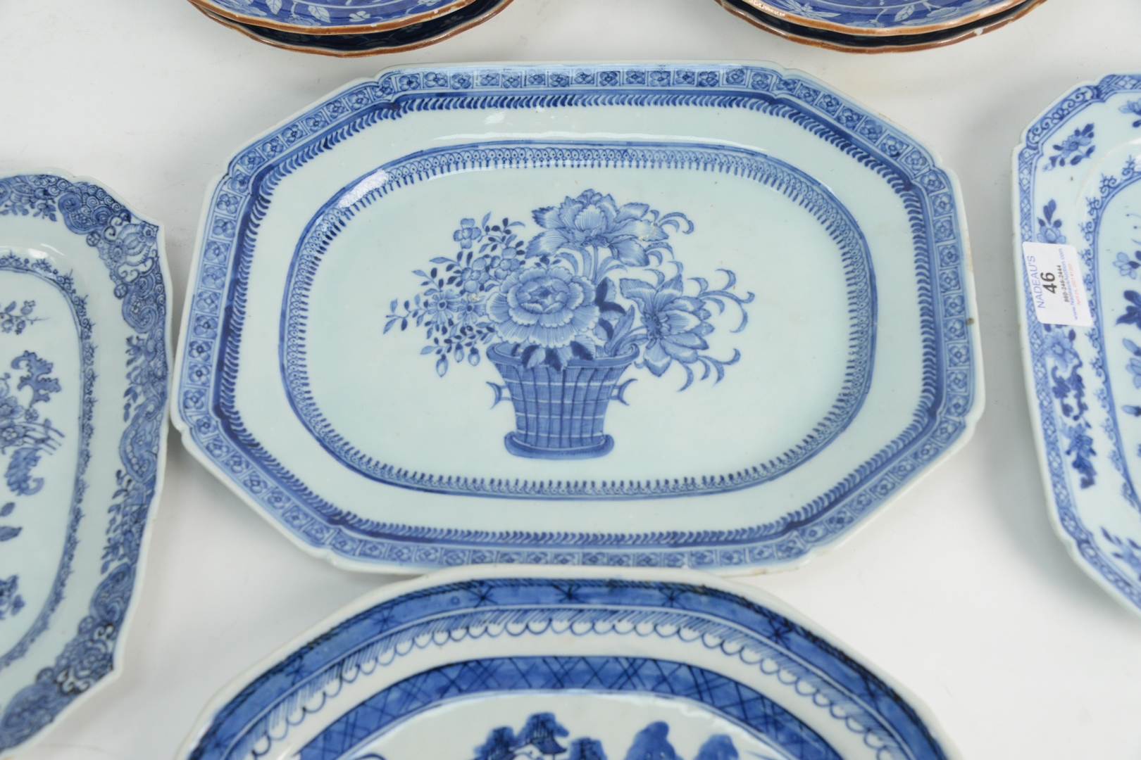 Lot 46: Eight Piece Group to include four Chinese blue and white platters, one canton and three floral decoration, along with four Chinese blue and white deep plates, having spurious six character Ming mark, diameters 8 1/2 – 13 1/2 inches.