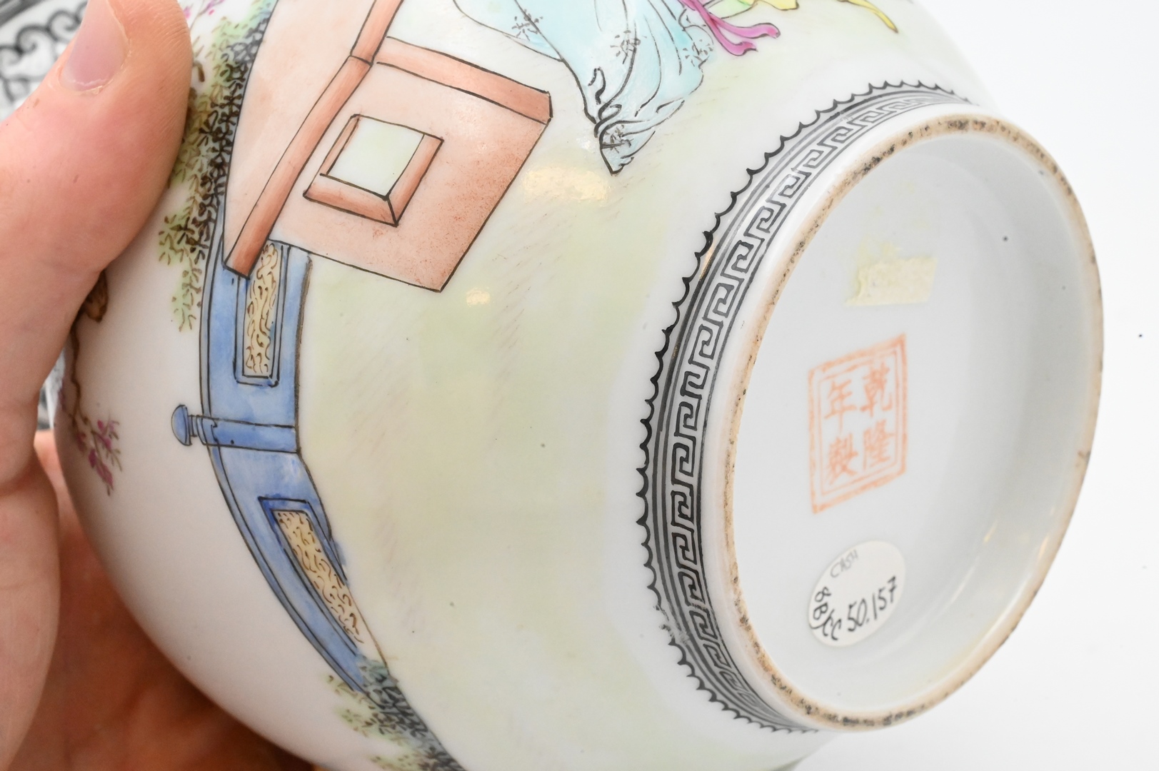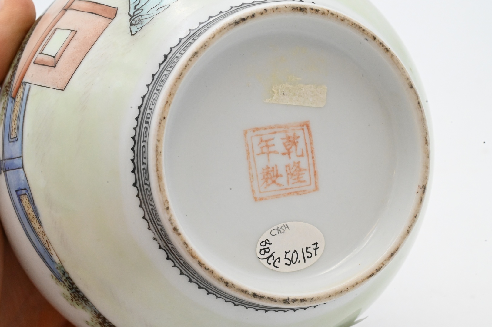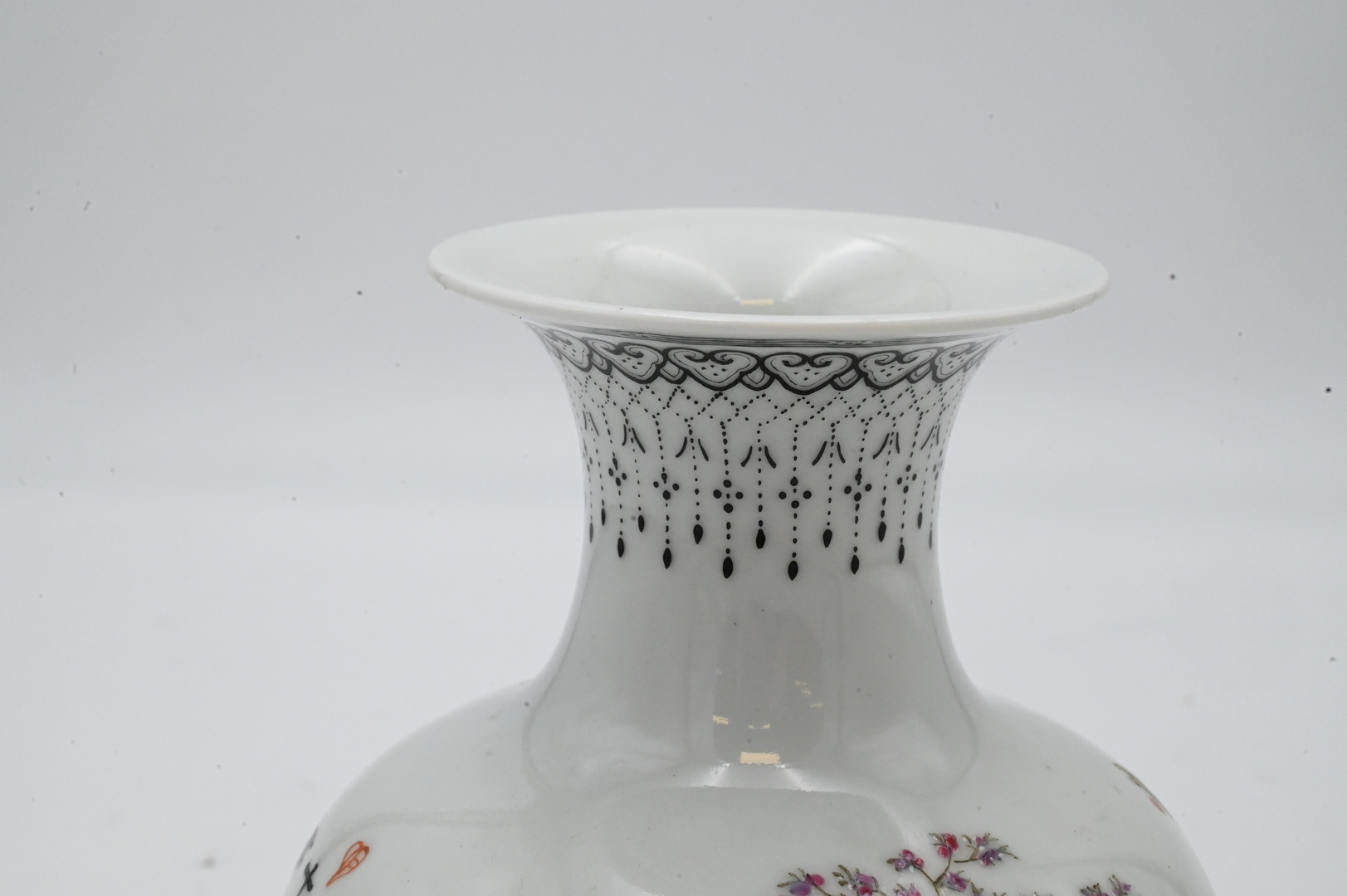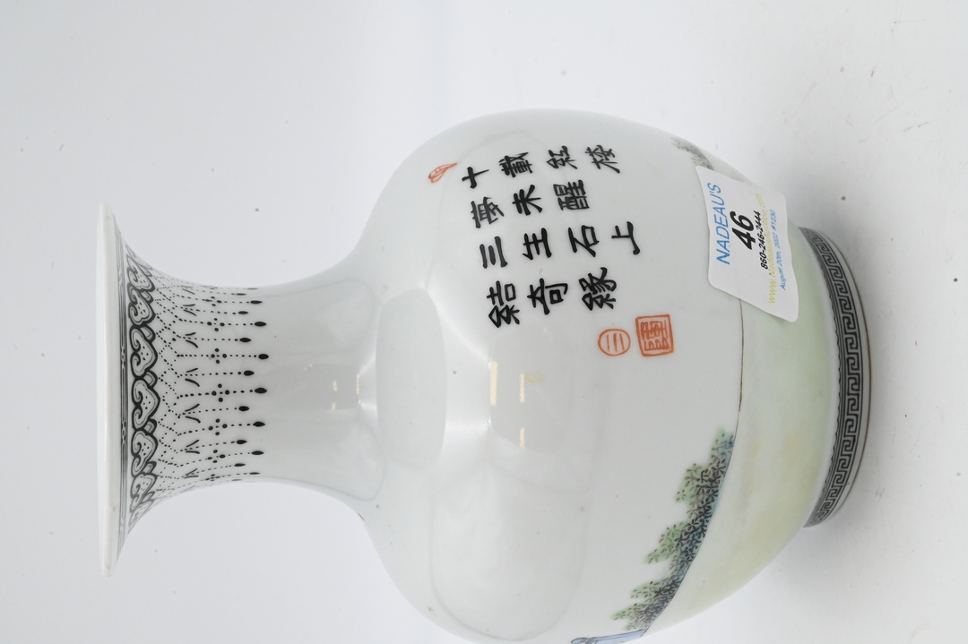 Famille Rose Porcelain Vase, depicting ladies in garden, calligraphy, Republic period, height 7 inches.