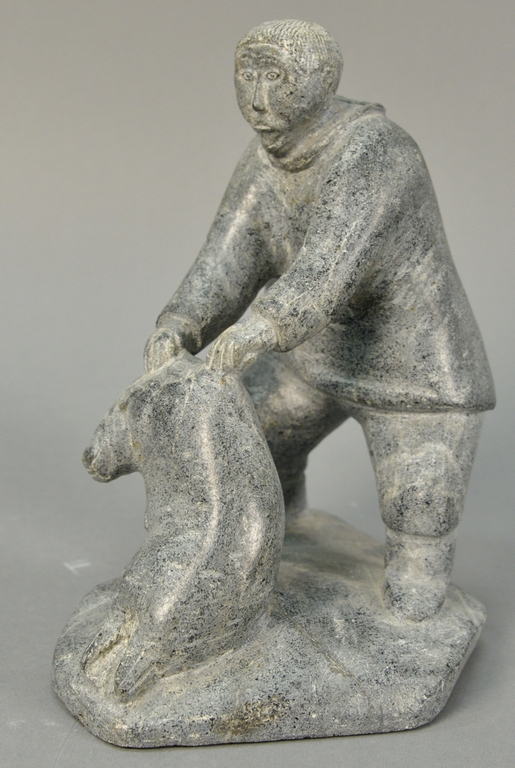 Inuit Eskimo carving Pingu Alaku 1930-1975 Kangiksujuaq Wakeman Bay grey soapstone Hunter and Seal, ht. 81/2in. pedestal ht. 30in.