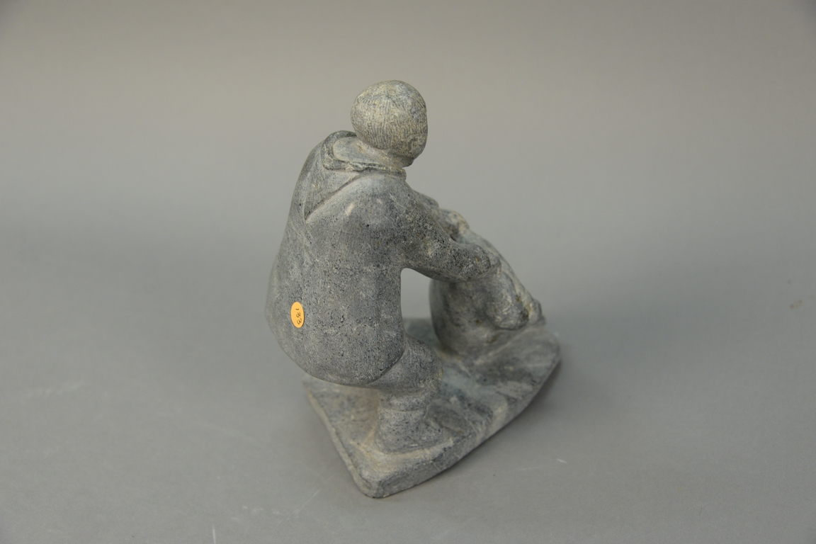 Lot 46: Inuit Eskimo carving Pingu Alaku 1930-1975 Kangiksujuaq Wakeman Bay grey soapstone Hunter and Seal, ht. 81/2in. pedestal ht. 30in.
