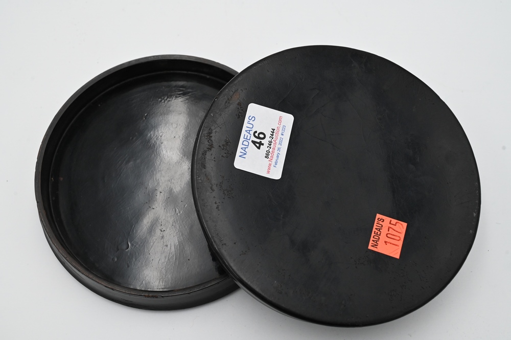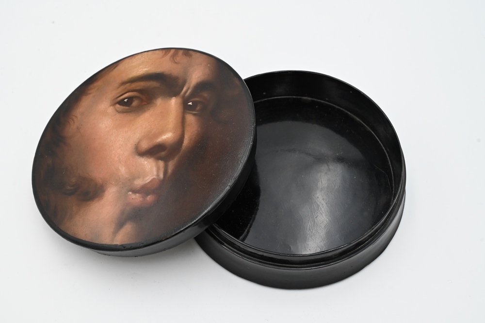 Large French Papier Mache Circular Box, having painted cover, diameter 6 1/4 inches.