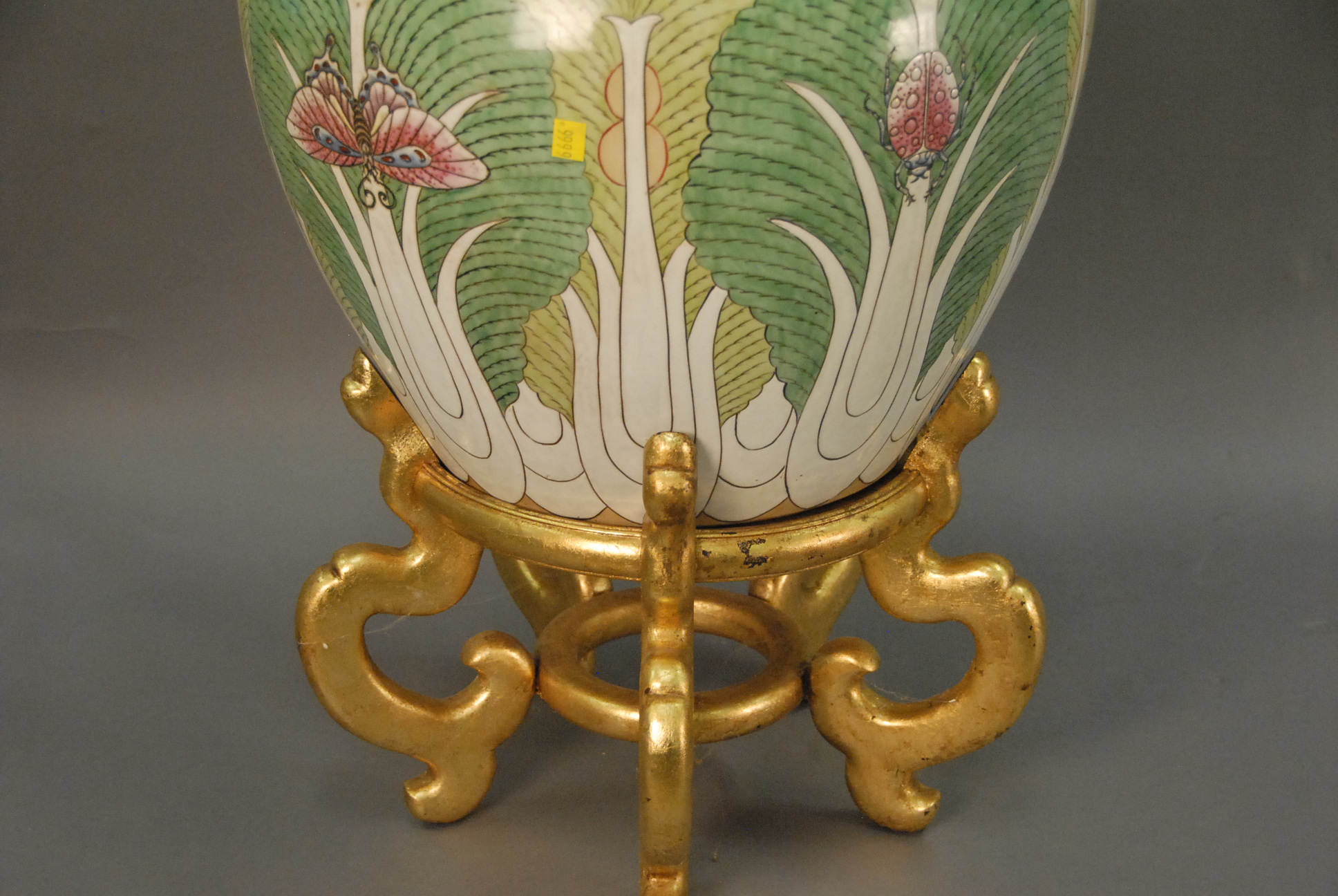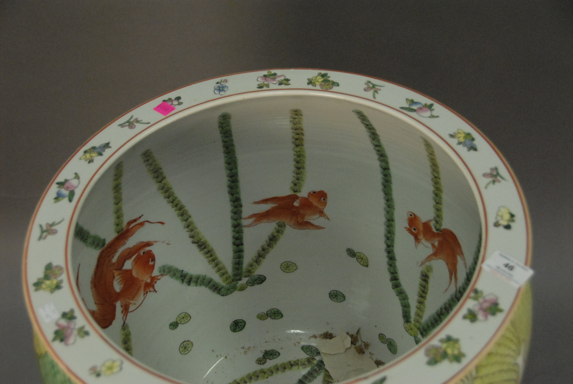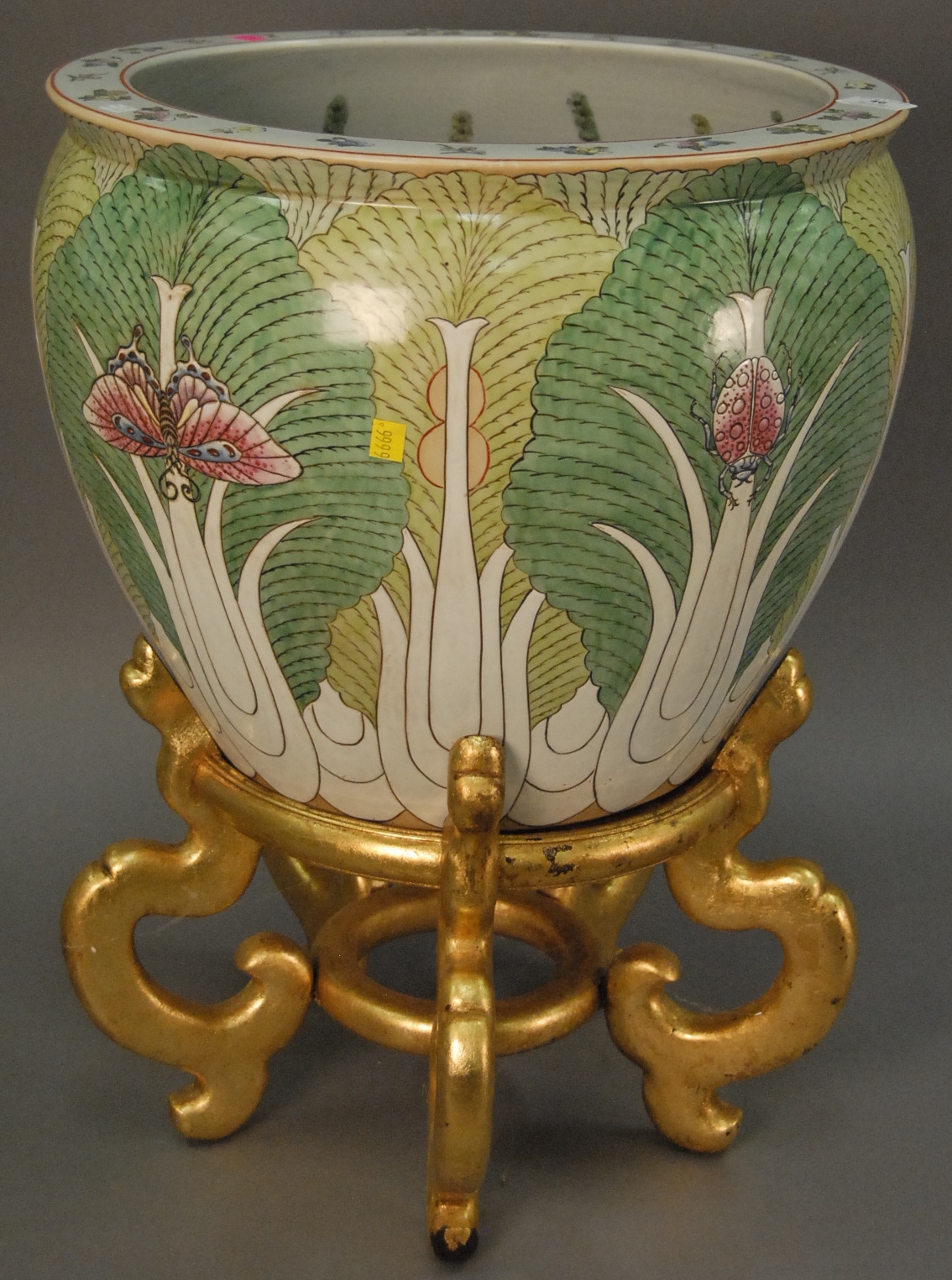 Large porcelain Oriental fish bowl on stand, ht. 26 in. dia. 18 in.