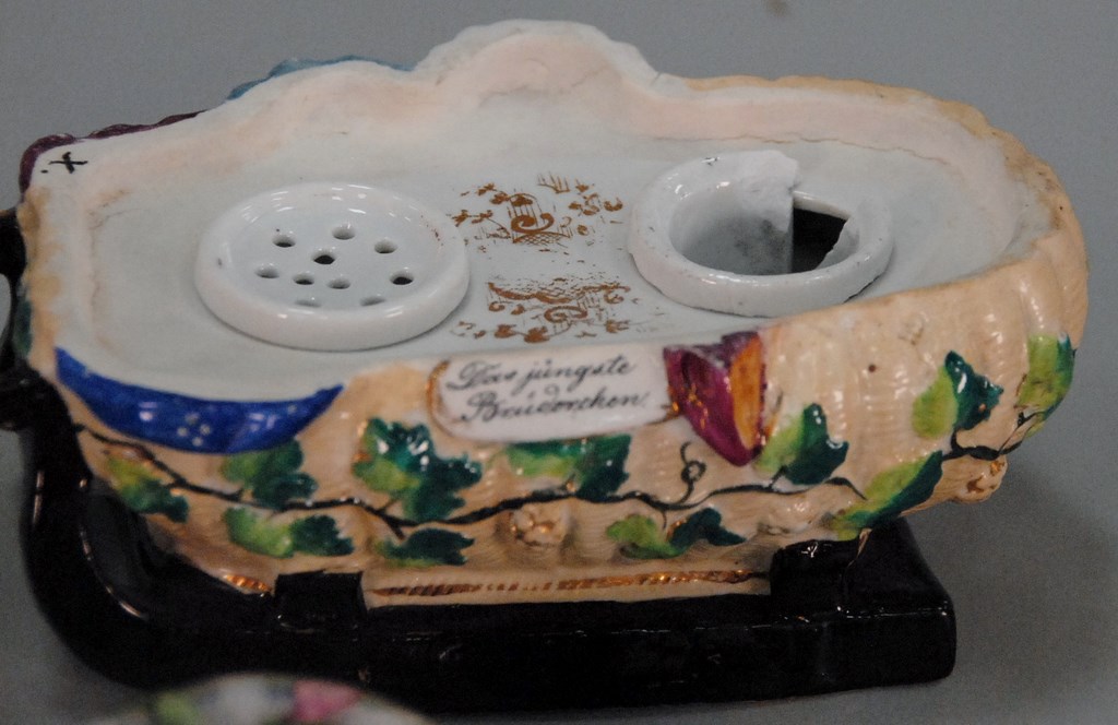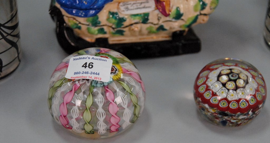 Lot 46: Lot to include German porcelain inkwell, two paperweights, two overlay decanters, and jade carved pendent.