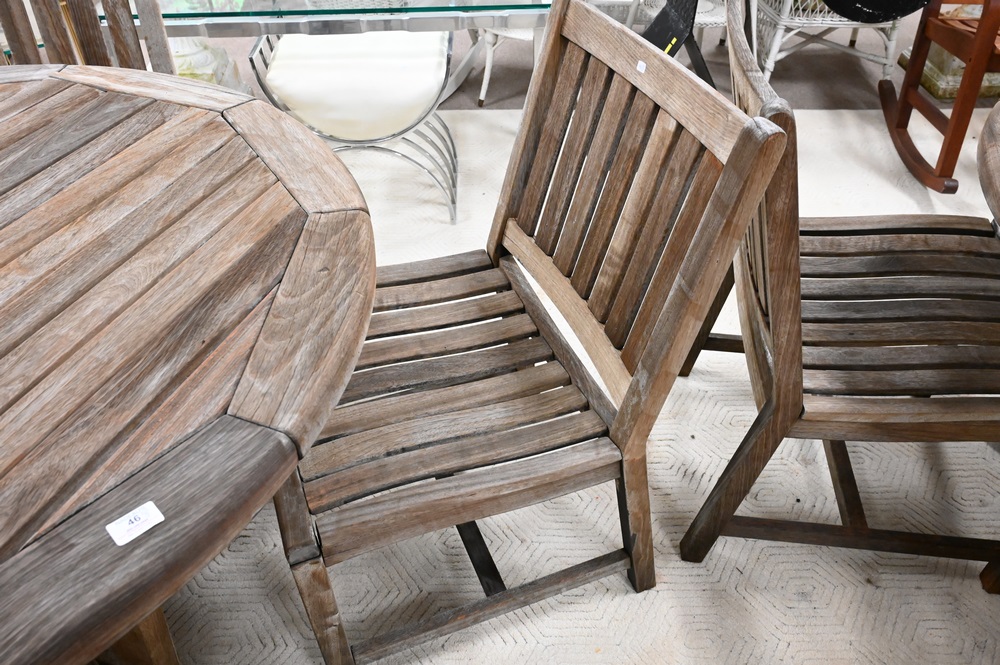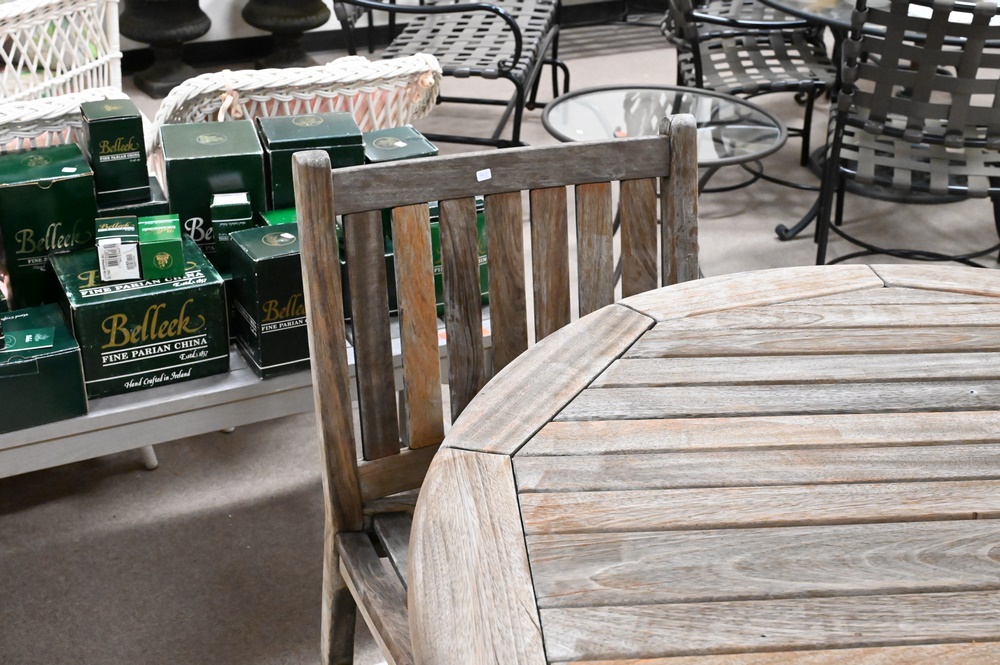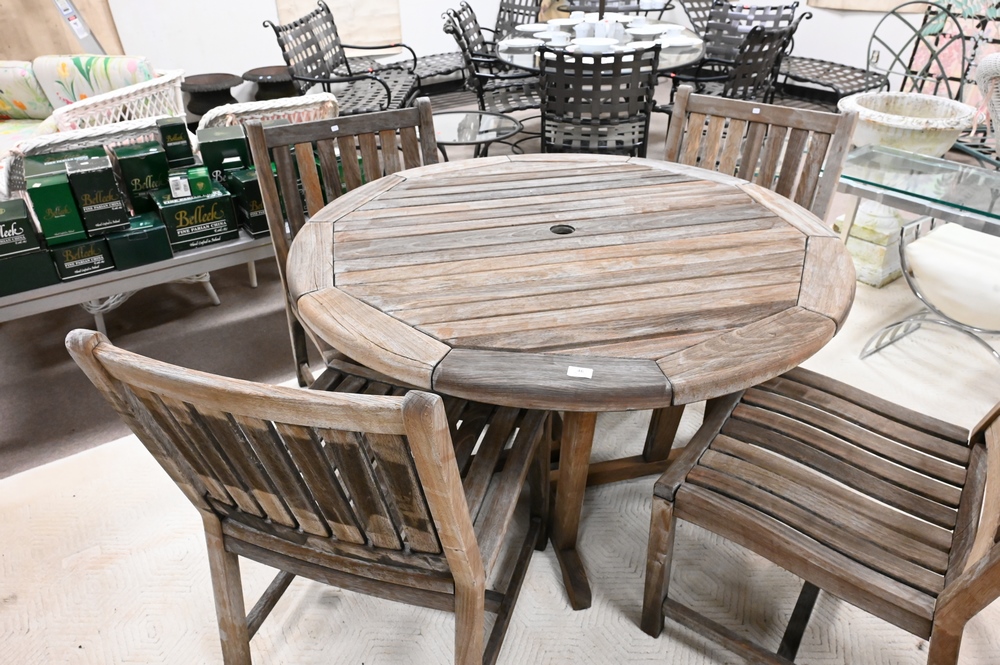 Lot 46: New River Brazilian Cherry Outdoor Patio Set, having table, four chairs, similar to teak, height 30 inches, diameter 48 inches.
