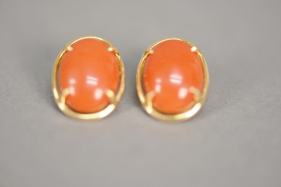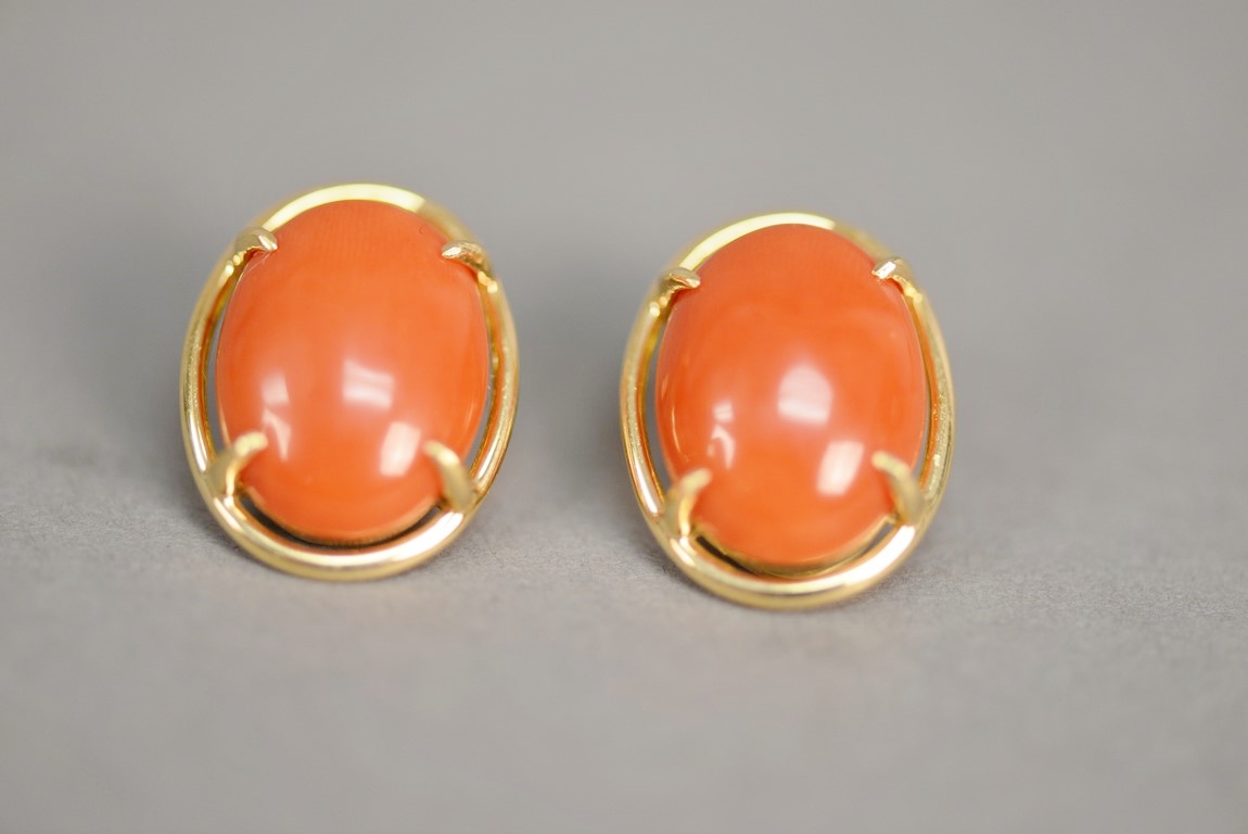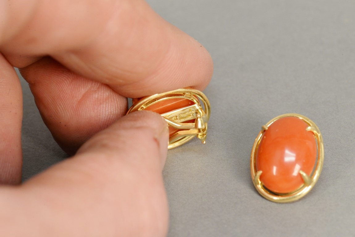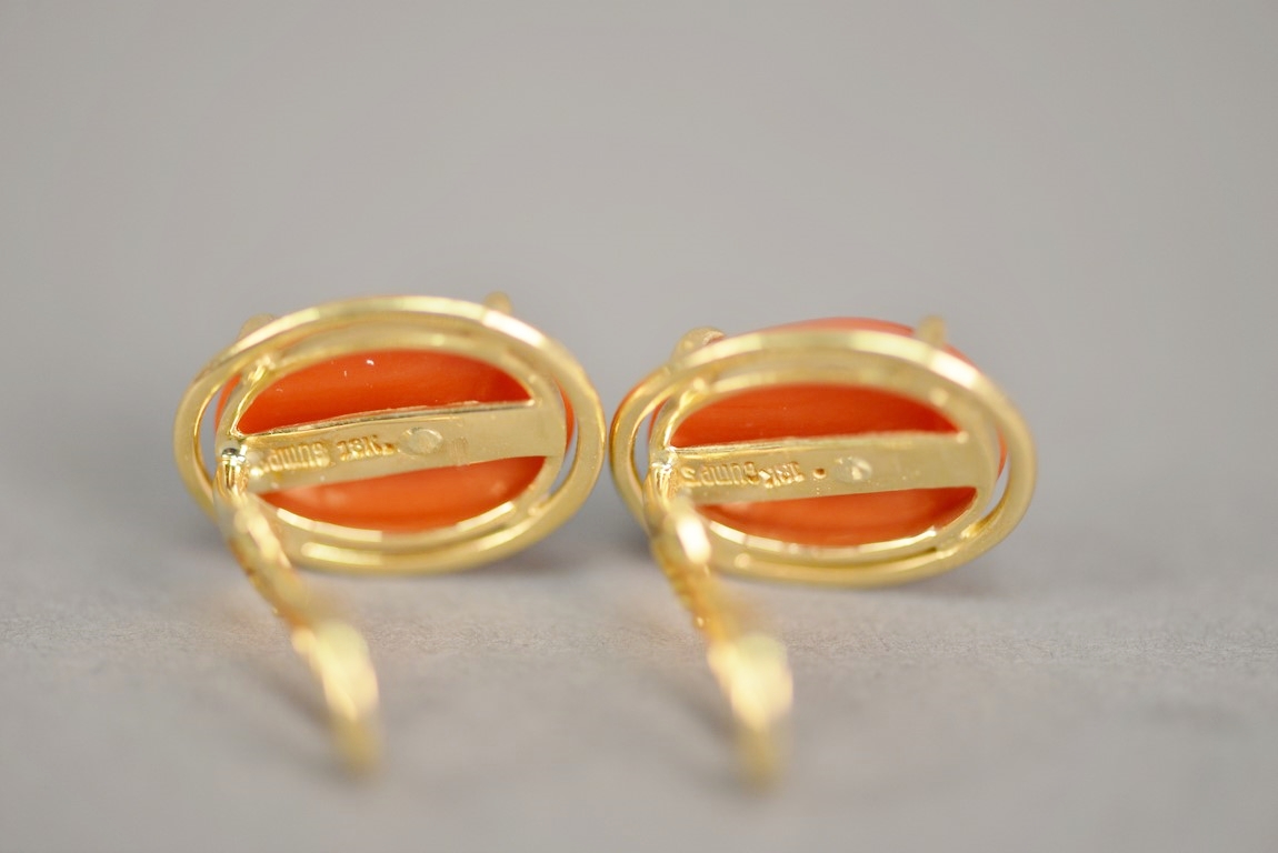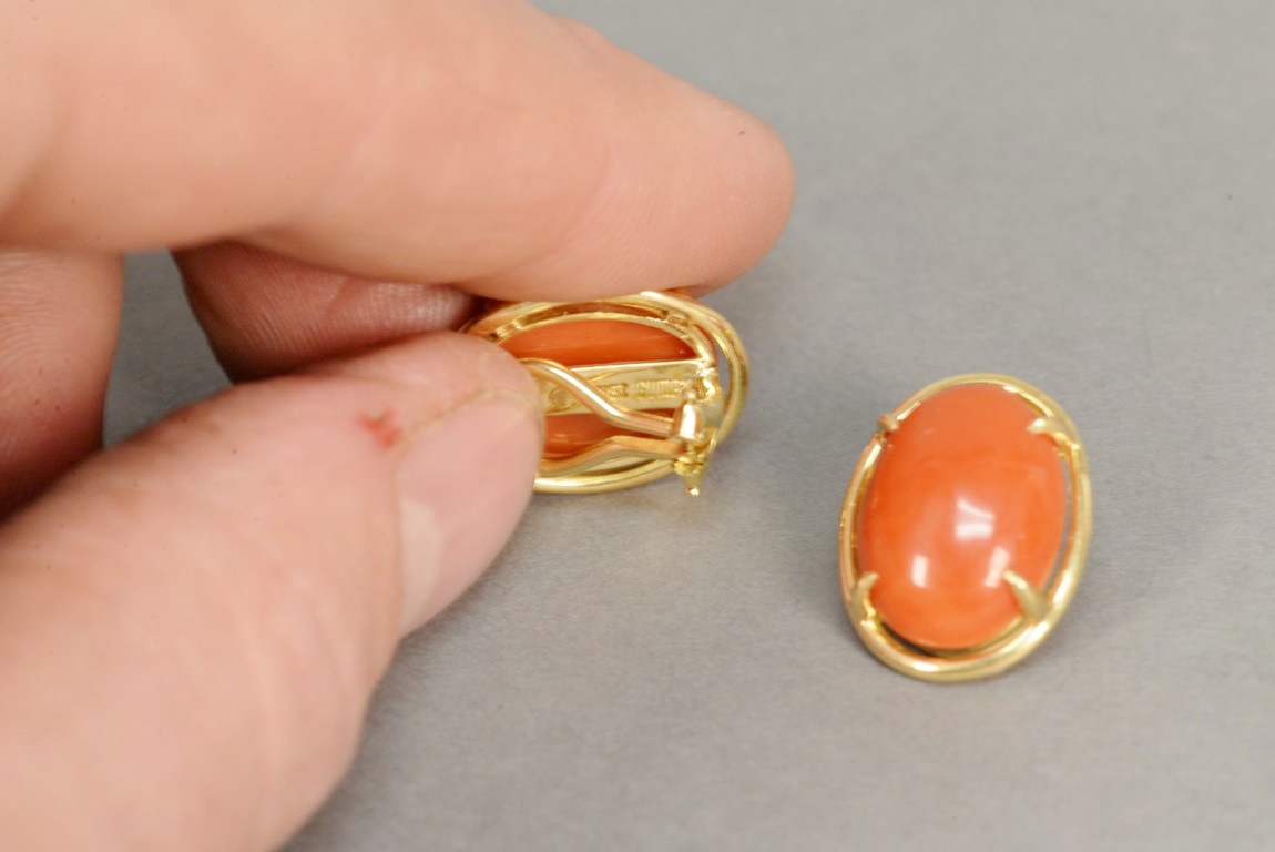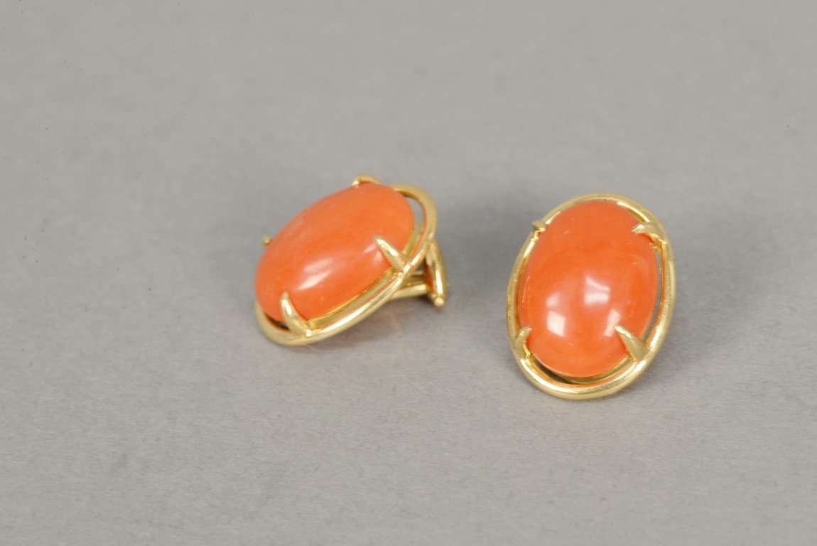 Pair of 18K gold earrings, each set with oval cabochon cut red coral 16x22mm, marked Gumps.