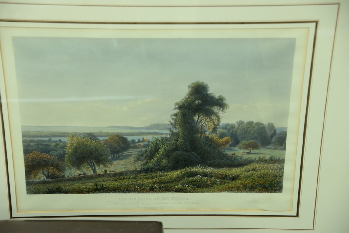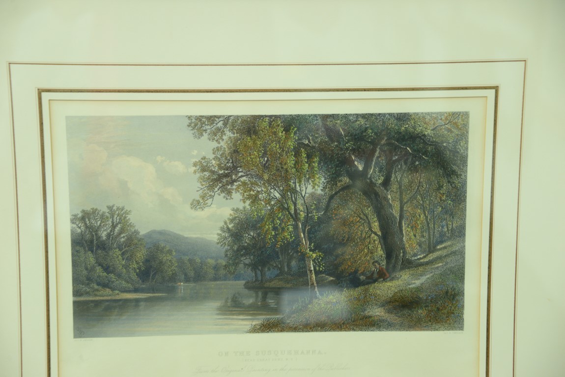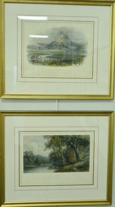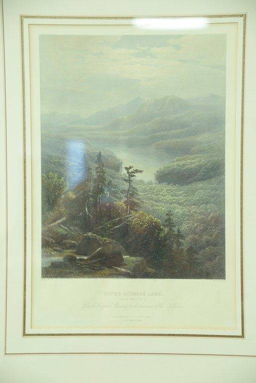 Set of five colored lithographs including St. Mary, St. Joseph and Maumee Rivers after Wm Momberger by V. Balch, Sugar Loaf Mountain, Winona, Min. after Wm. Momberger by V. balch, Upper Ausable Lake by Jas. D. Smillie, On the Susquehanna by Jas. D. Smillie, and Croton Point, on the Hudson after Wm. Hart, by R. Dudensing. sight sizes 11 x 14 3/4 and 10 x 15 Property from Credit Suisse’s Americana Collection