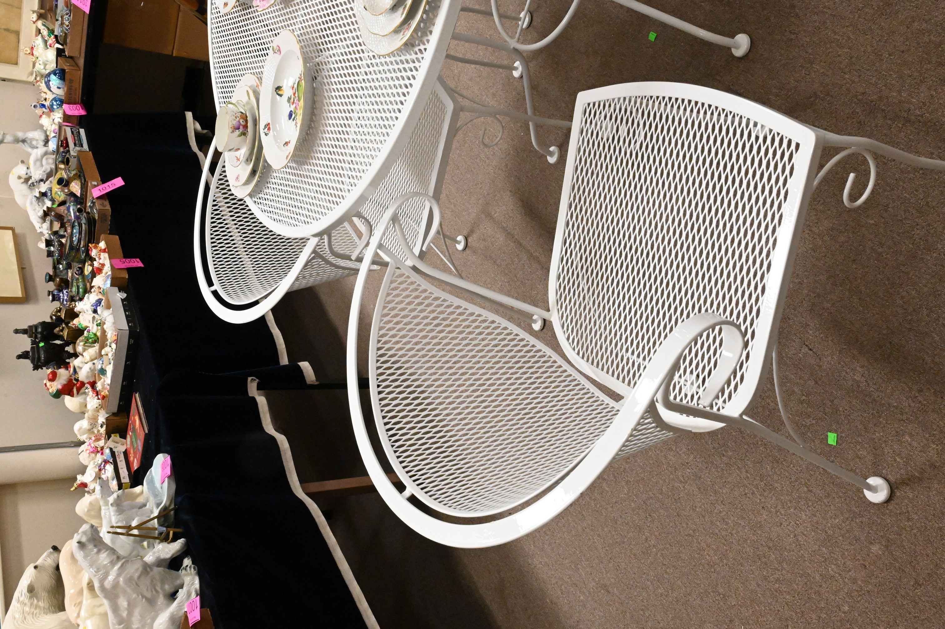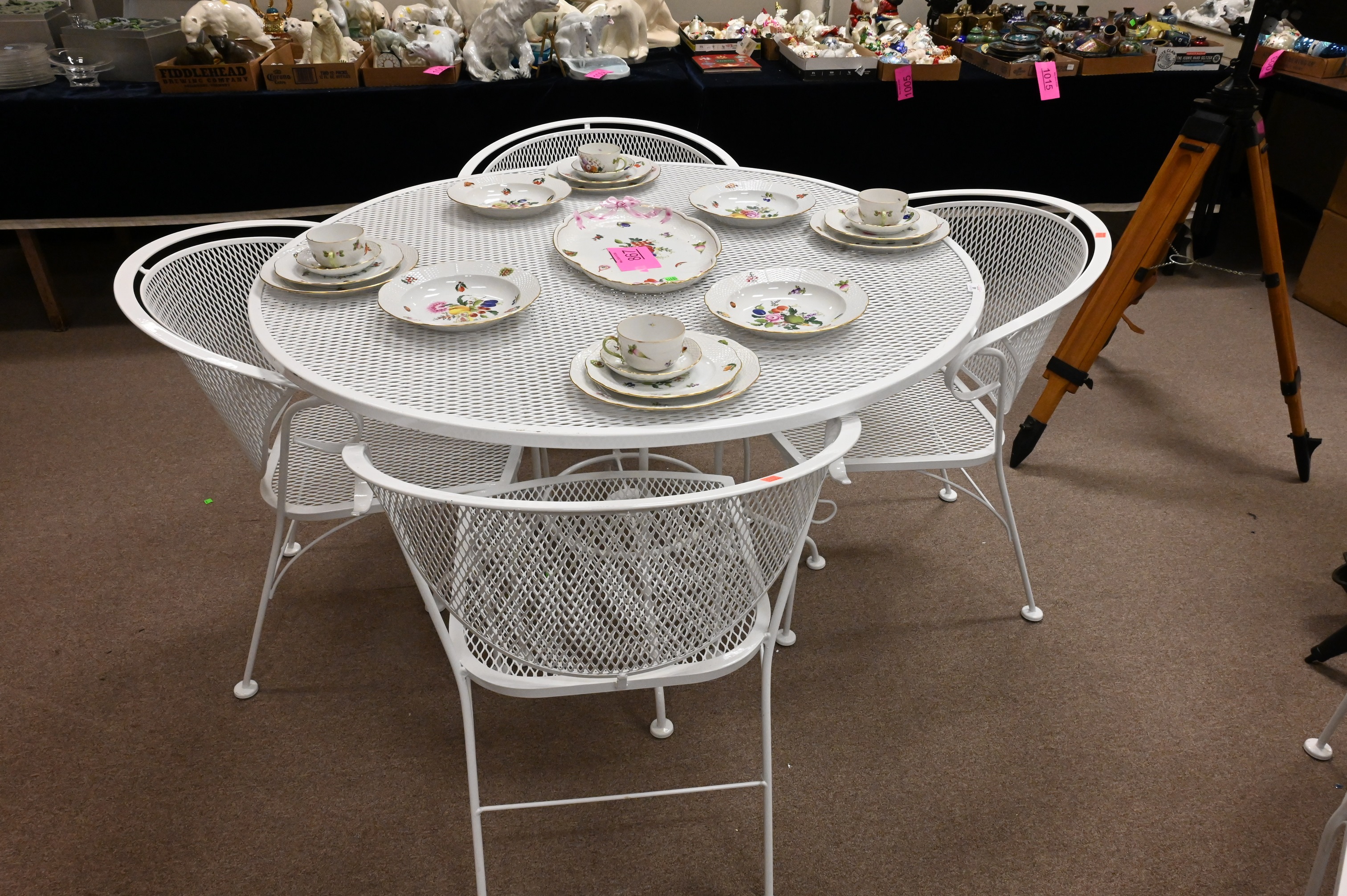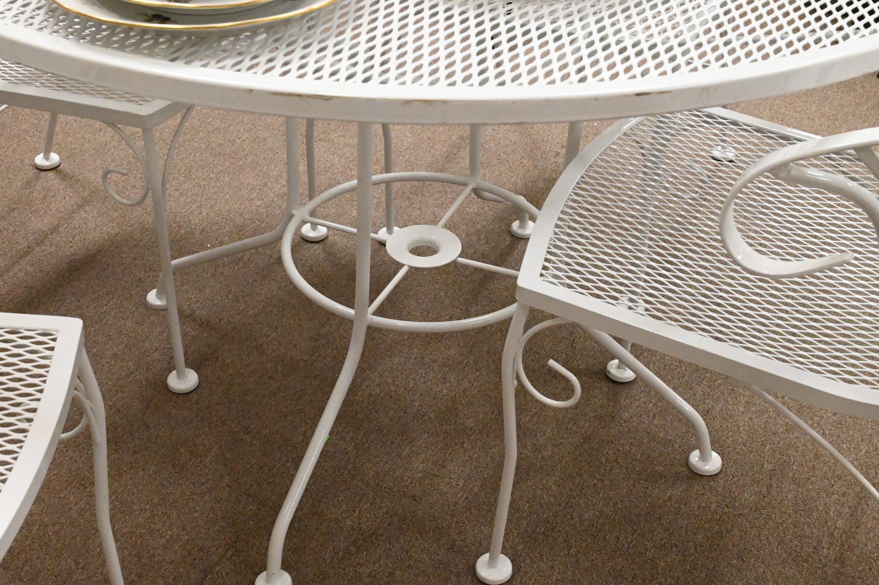 Lot 46: Six Piece Metal Mesh Round Table with Umbrella and Four Chairs