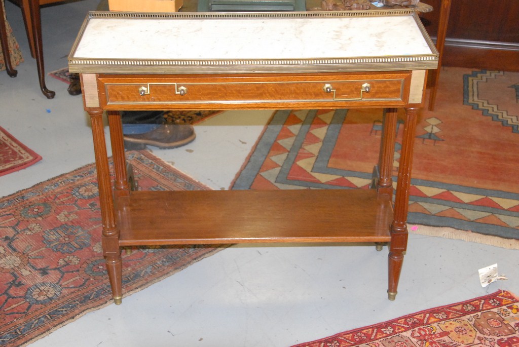 Lot 46: Small marble top French style stand with brass inlay and brass gallery, lg