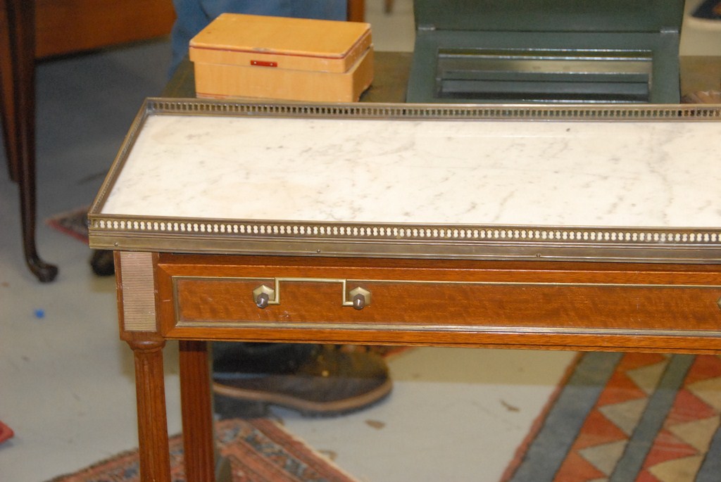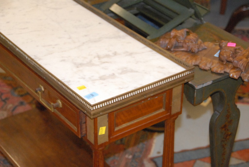 Small marble top French style stand with brass inlay and brass gallery, lg. 33in. dp. 12in. Provenance: property from a home in Rockville Center, New York which was decorated by Iris Apfel.