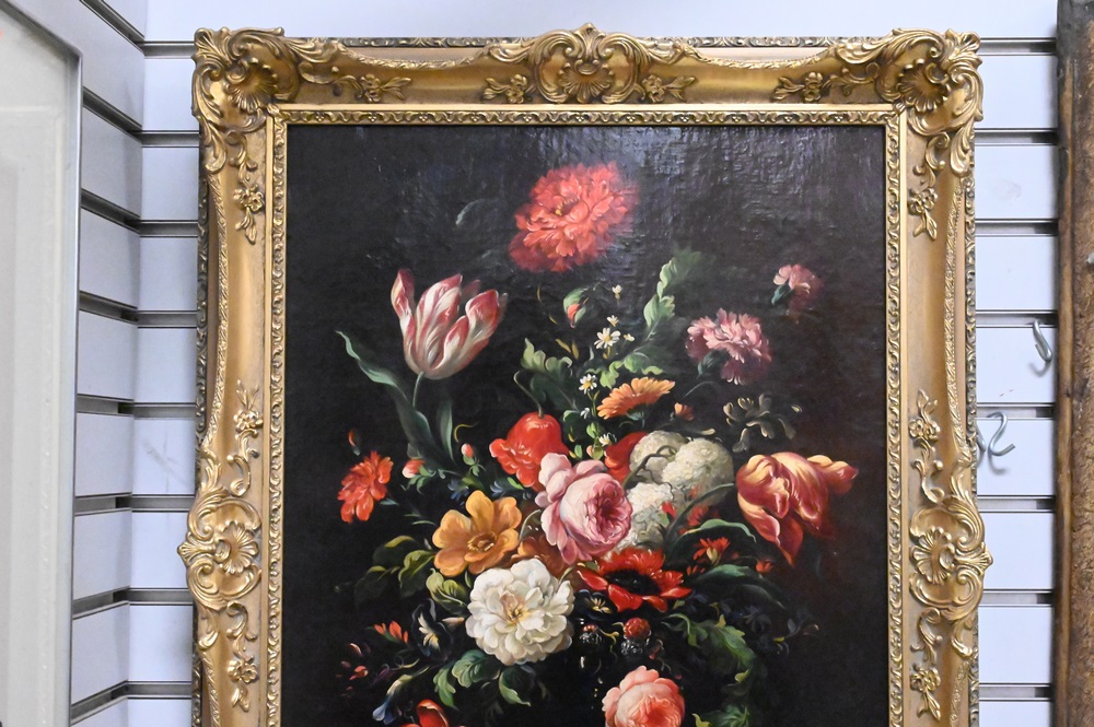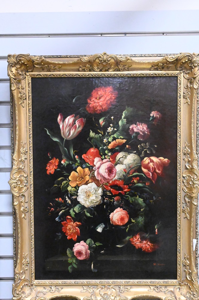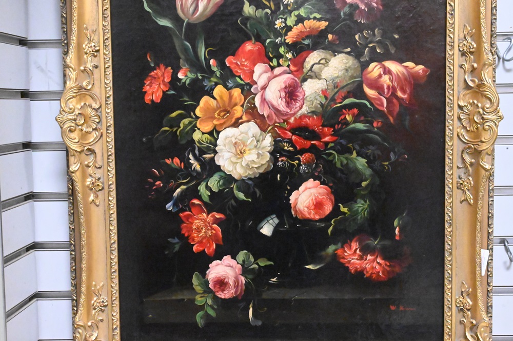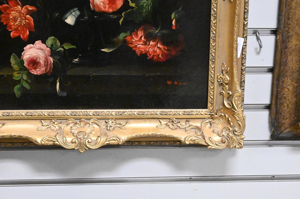Still Life of Flowers, oil on canvas, in ornate frame, signed lower right “W. Kiw___”, 27 1/2″ x 19 1/2″.