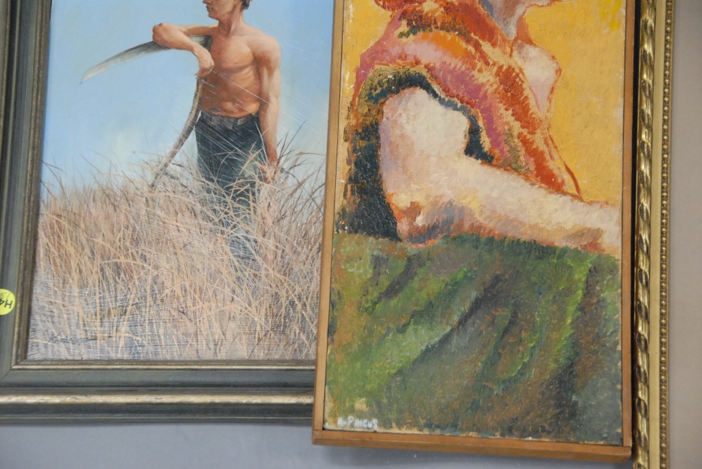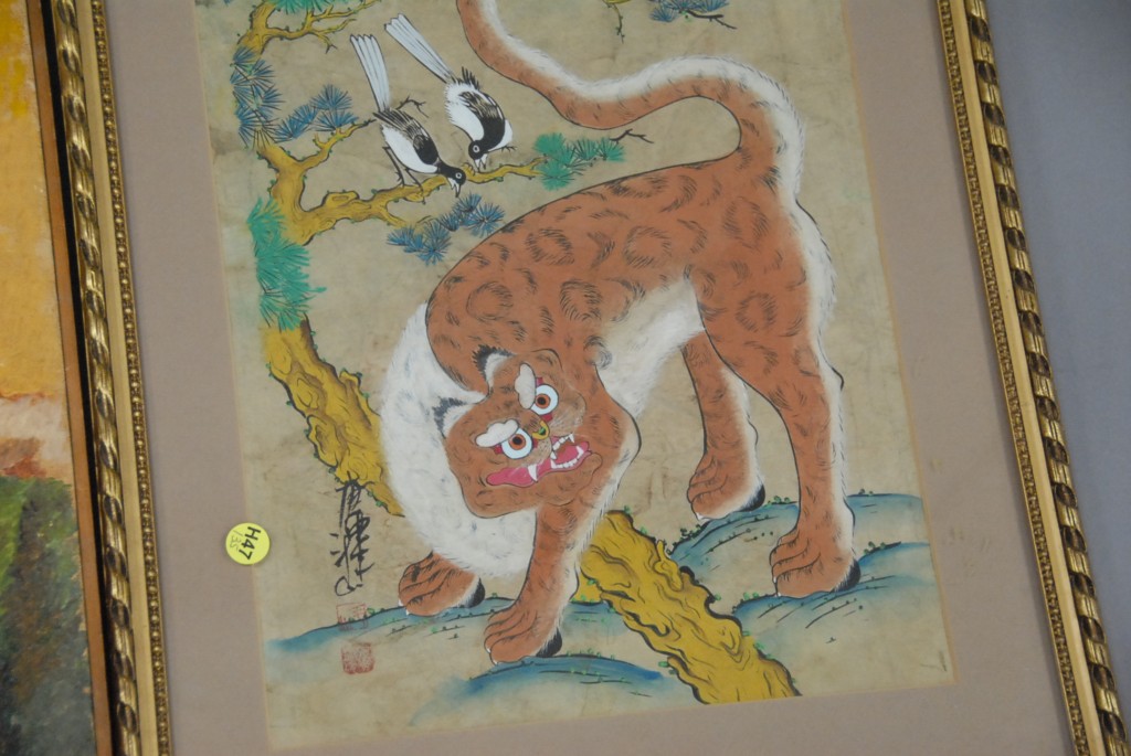 Three paintings oil on board of a woman signed lower left N. Pincus, oil on panel First Cutting signed lower left Kijanka 14 x 9, and oil on canvas Oriental painting of an animal signed marked with seal lower left 16 x 12.