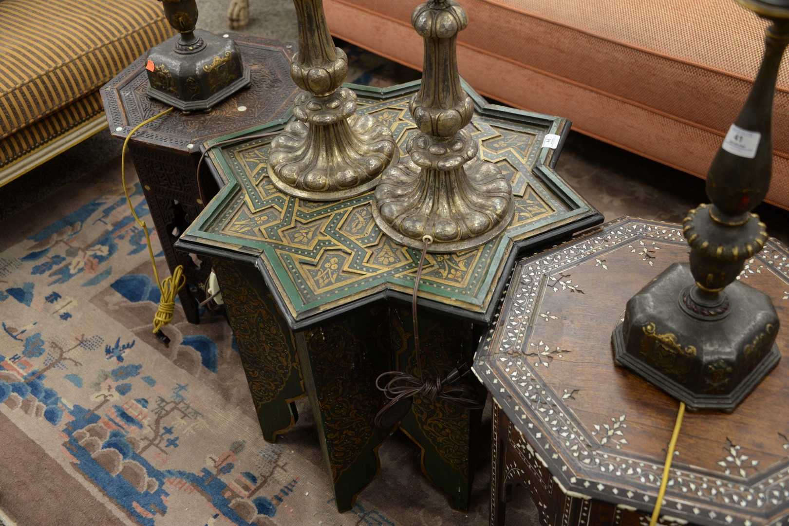 Lot 46: Three Syrian Taborets, one star shaped, largest height 21 inches, largest diameter 28 inches.