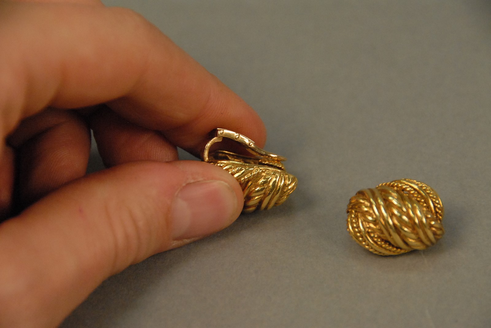 Lot 46: Tiffany & Co. 18K yellow gold clip on earrings with a woven rope design, 25.8 grams Provenance: Property from The Estate of Margaret Reventlow of Litchfield, CT