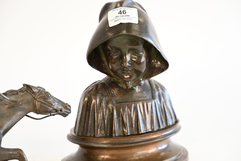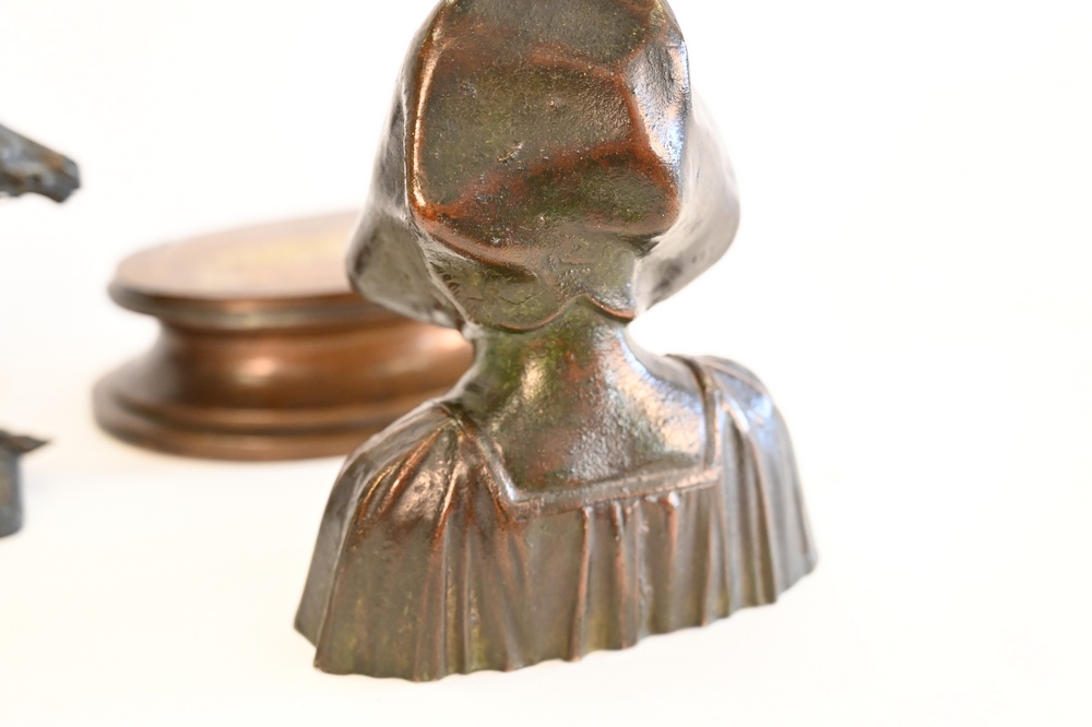 Two Bronze Sculptures, to include a small bronze bust of a hooded child, unsigned, base is unattached, height 9 inches; along with a…