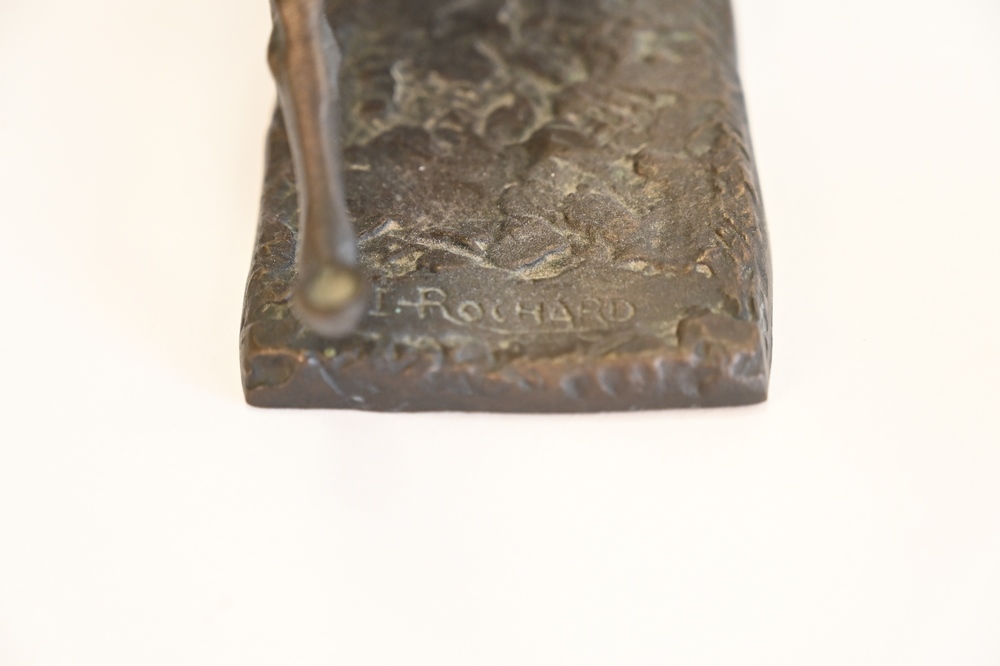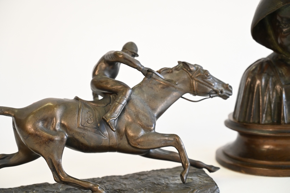 Lot 46: Two Bronze Sculptures, to include a small bronze bust of a hooded child, unsigned, base is unattached, height 9 inches; along with a horse with jockey signed Rochard, height 9 inches, (as is).