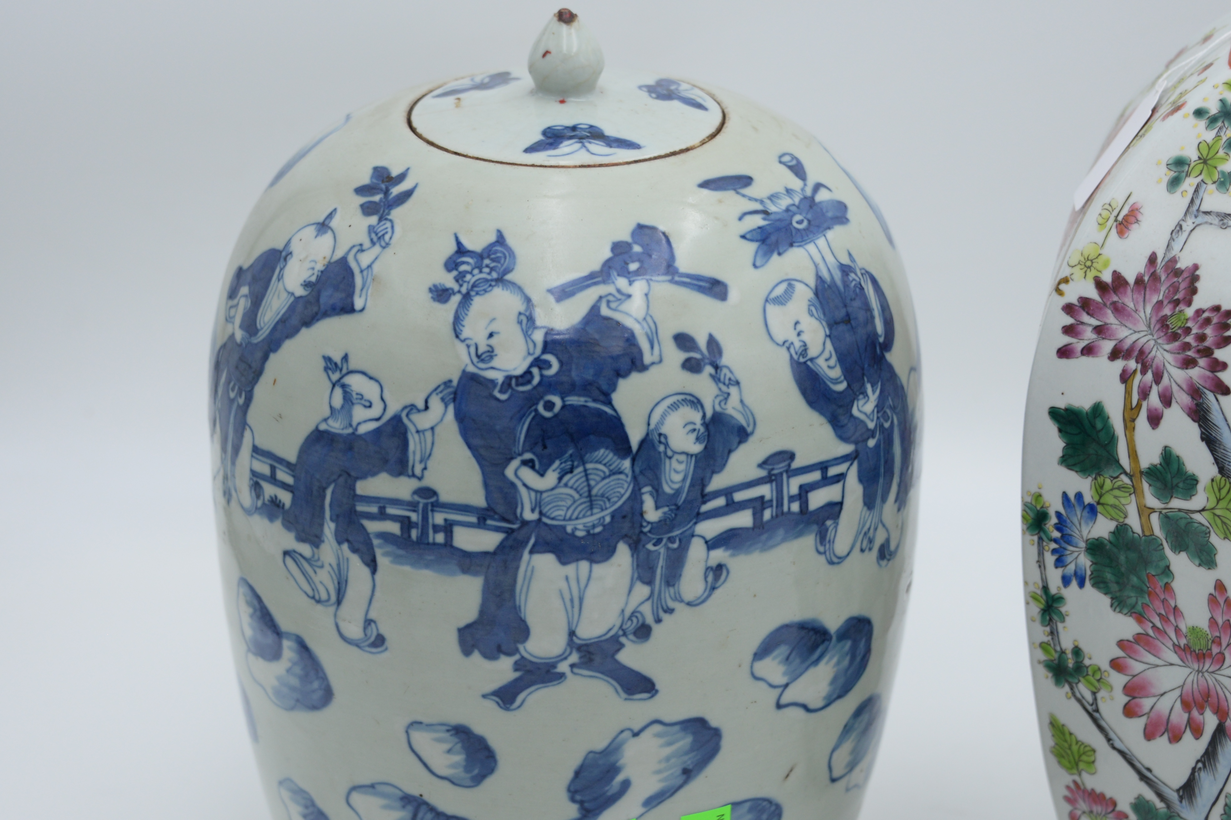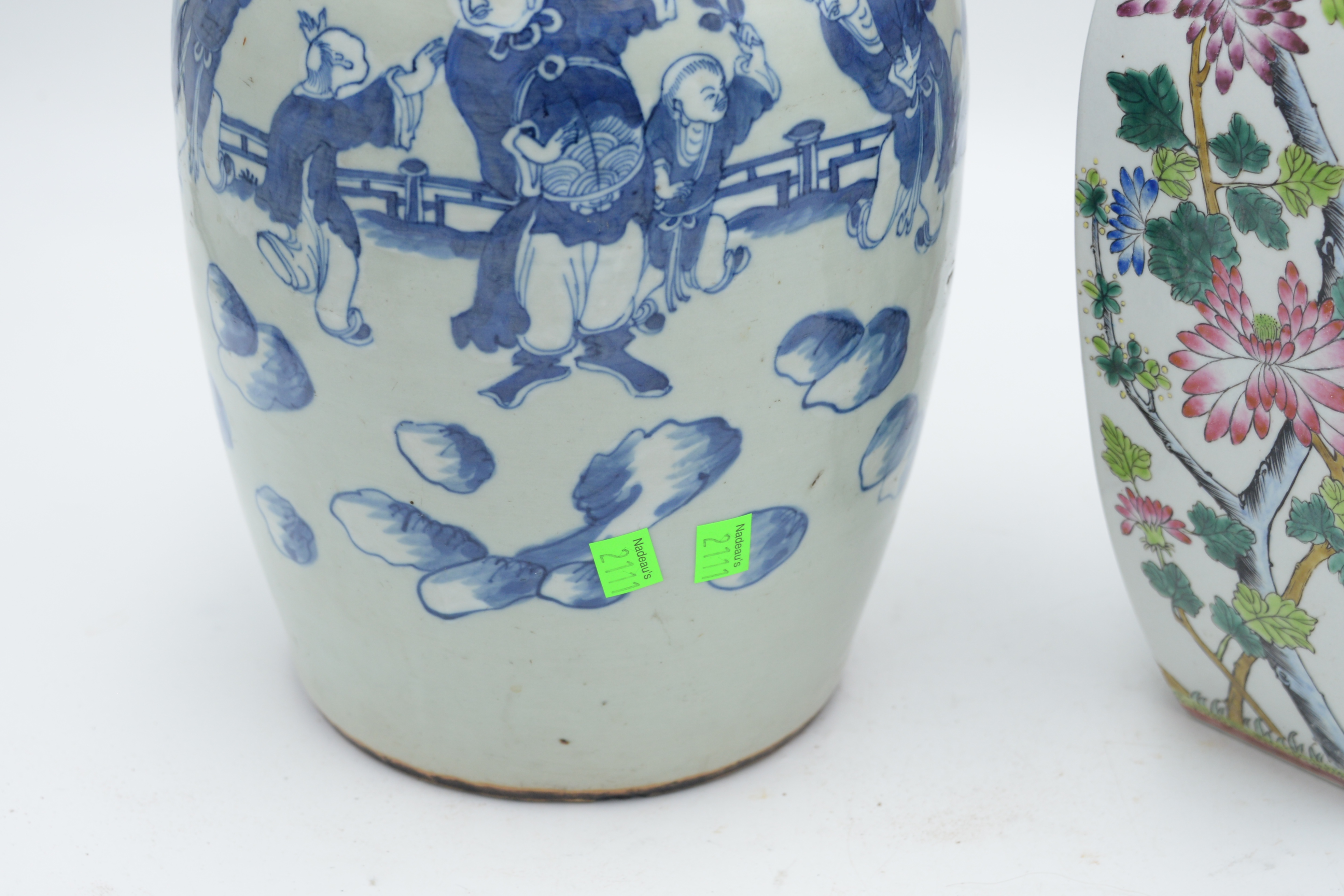 | Two Chinese Blue and White Porcelain Jars, with one having painted peony motif, height 14 inches and 13 inches |