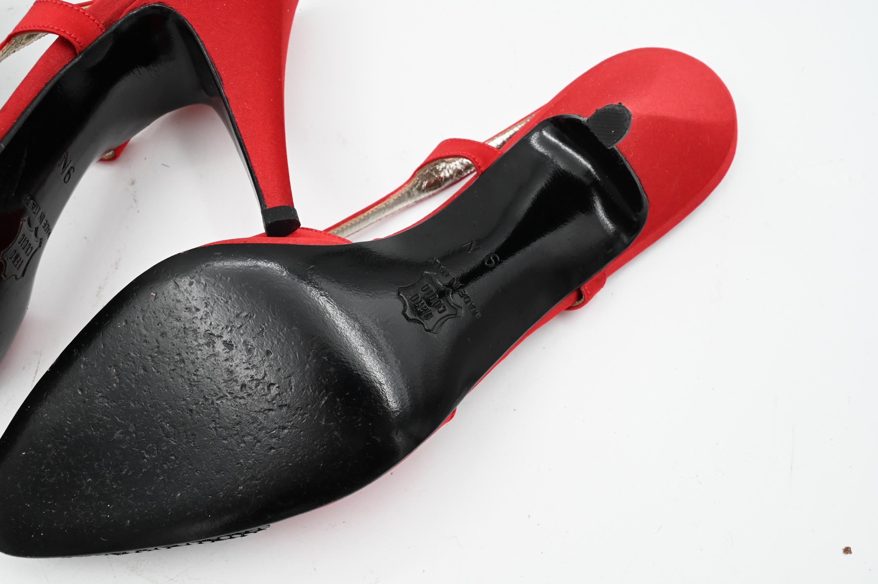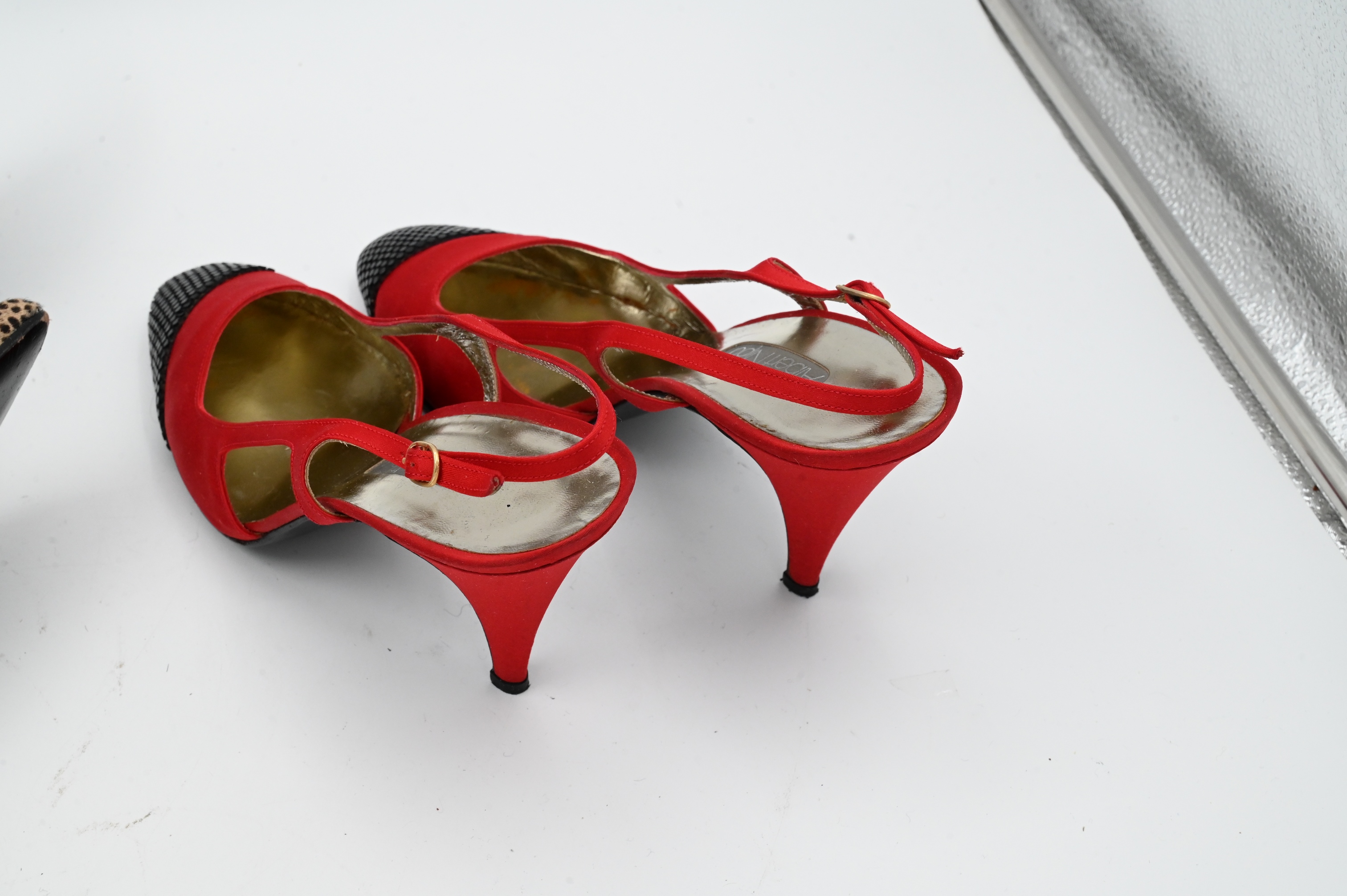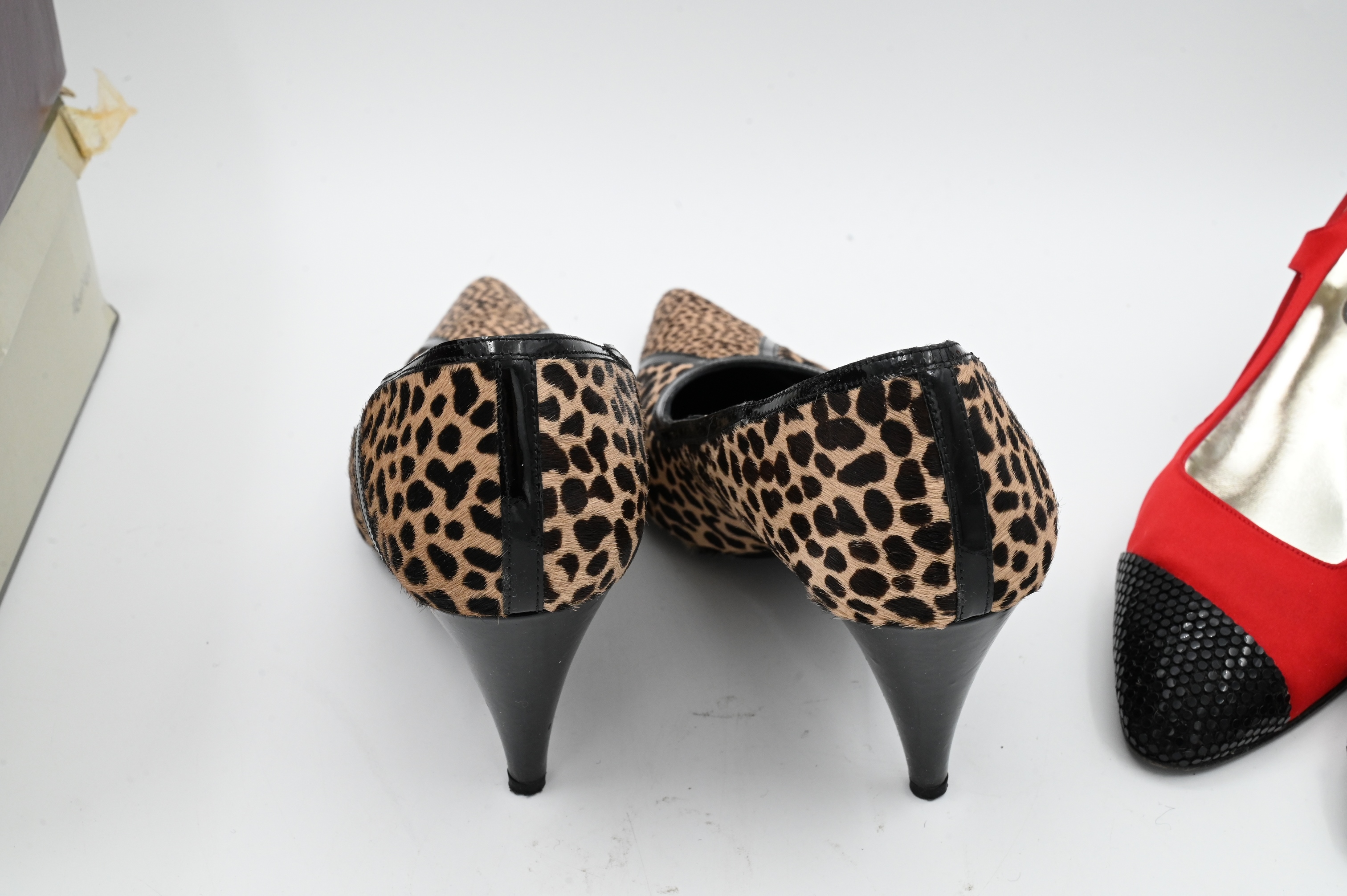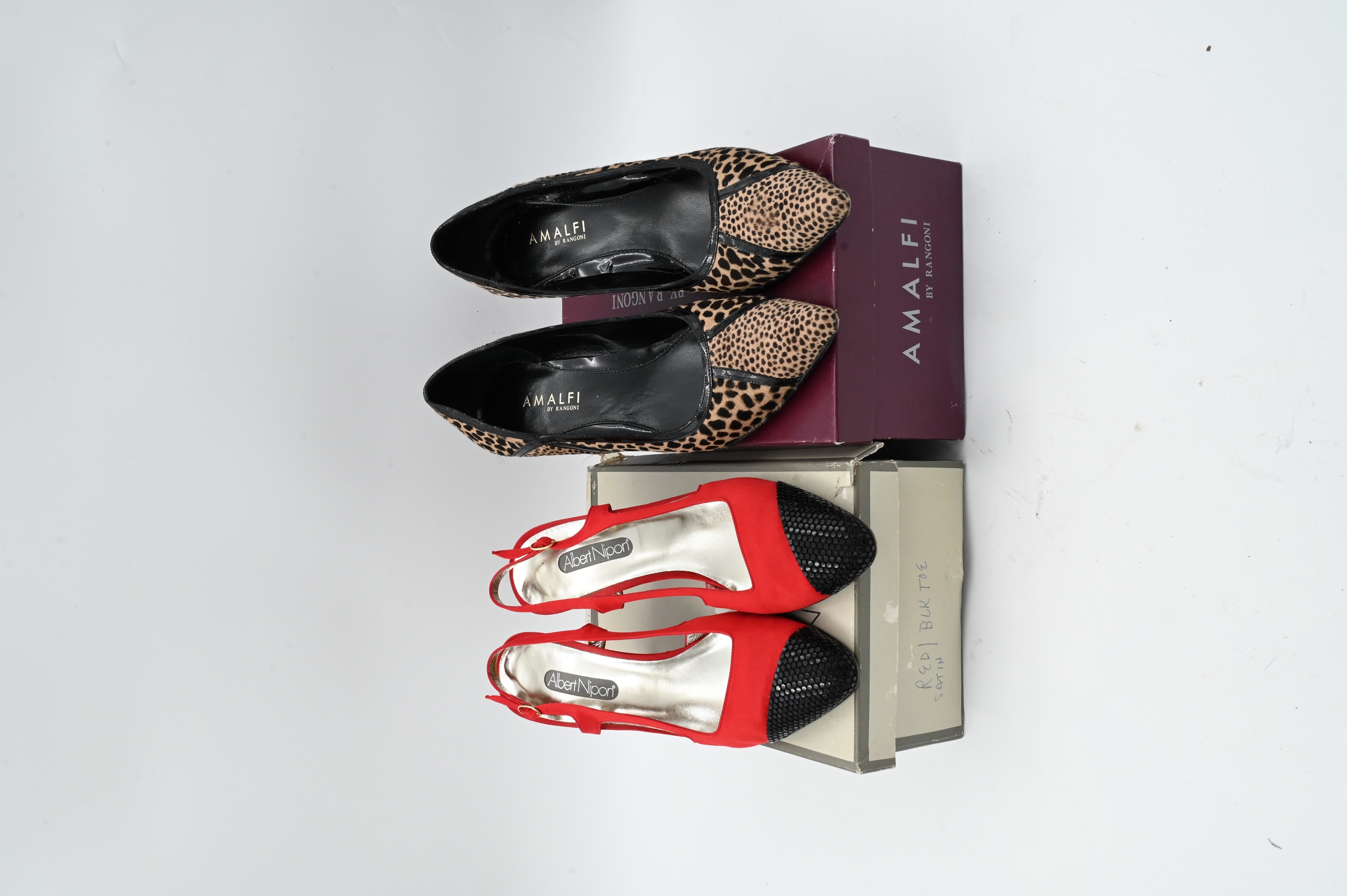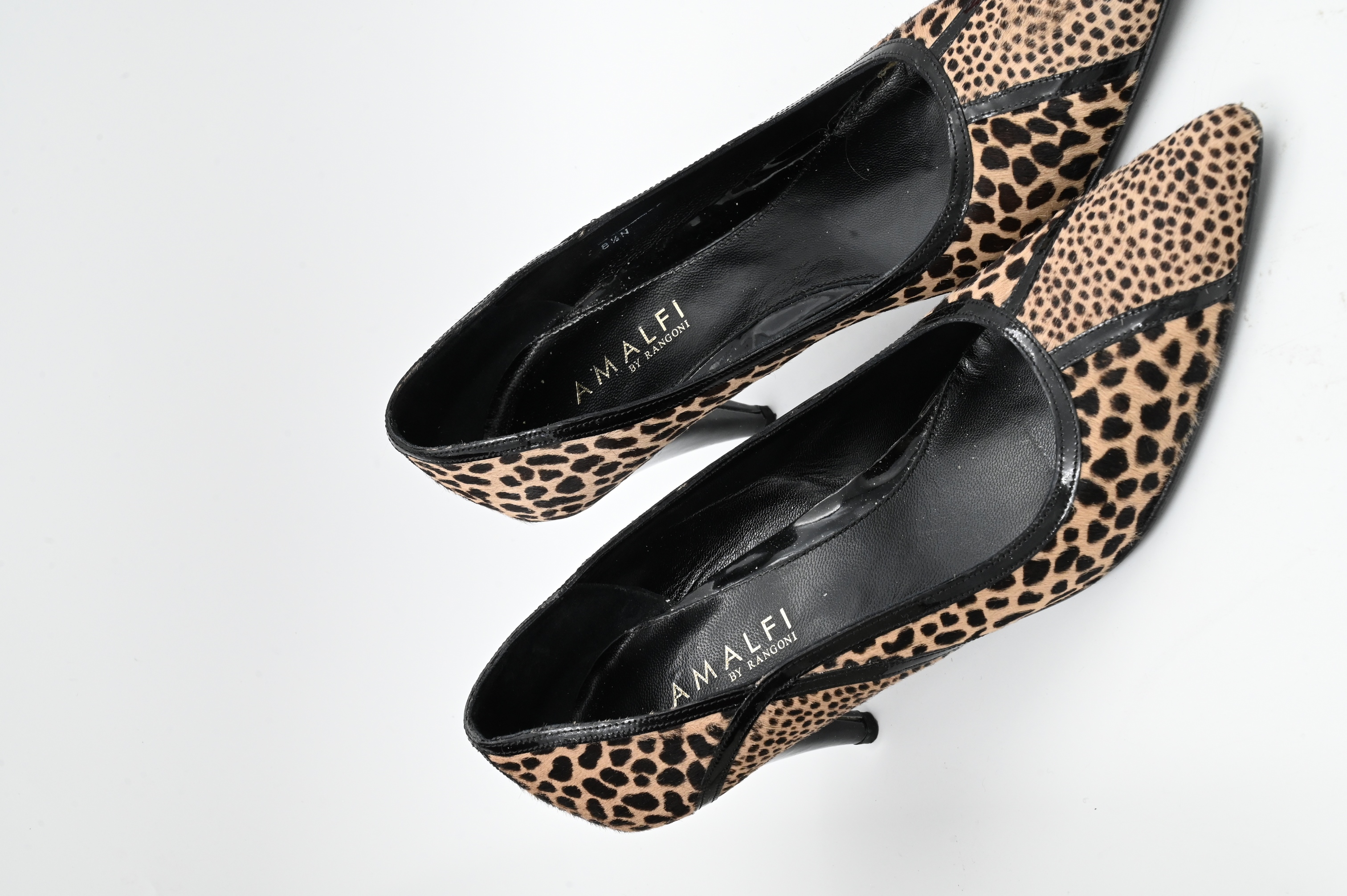 Amalfi “Brita” in leopard print, Albert Nixon “Loretta” satin and black mesh, black sequin toes, retails for $132, sizes 8 1/2, 9