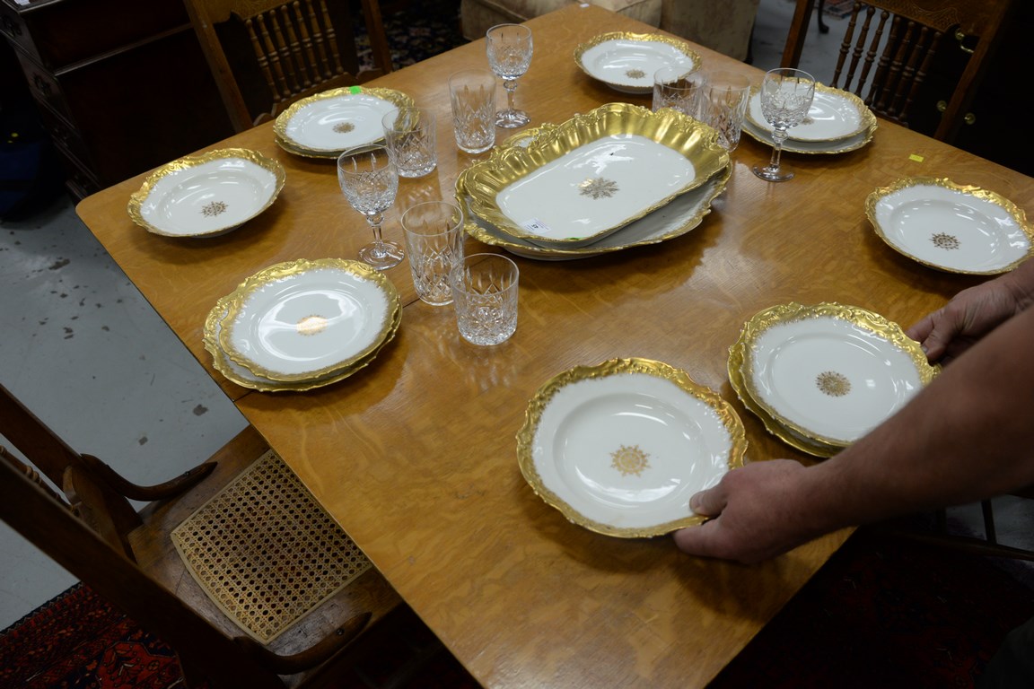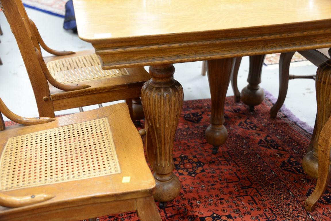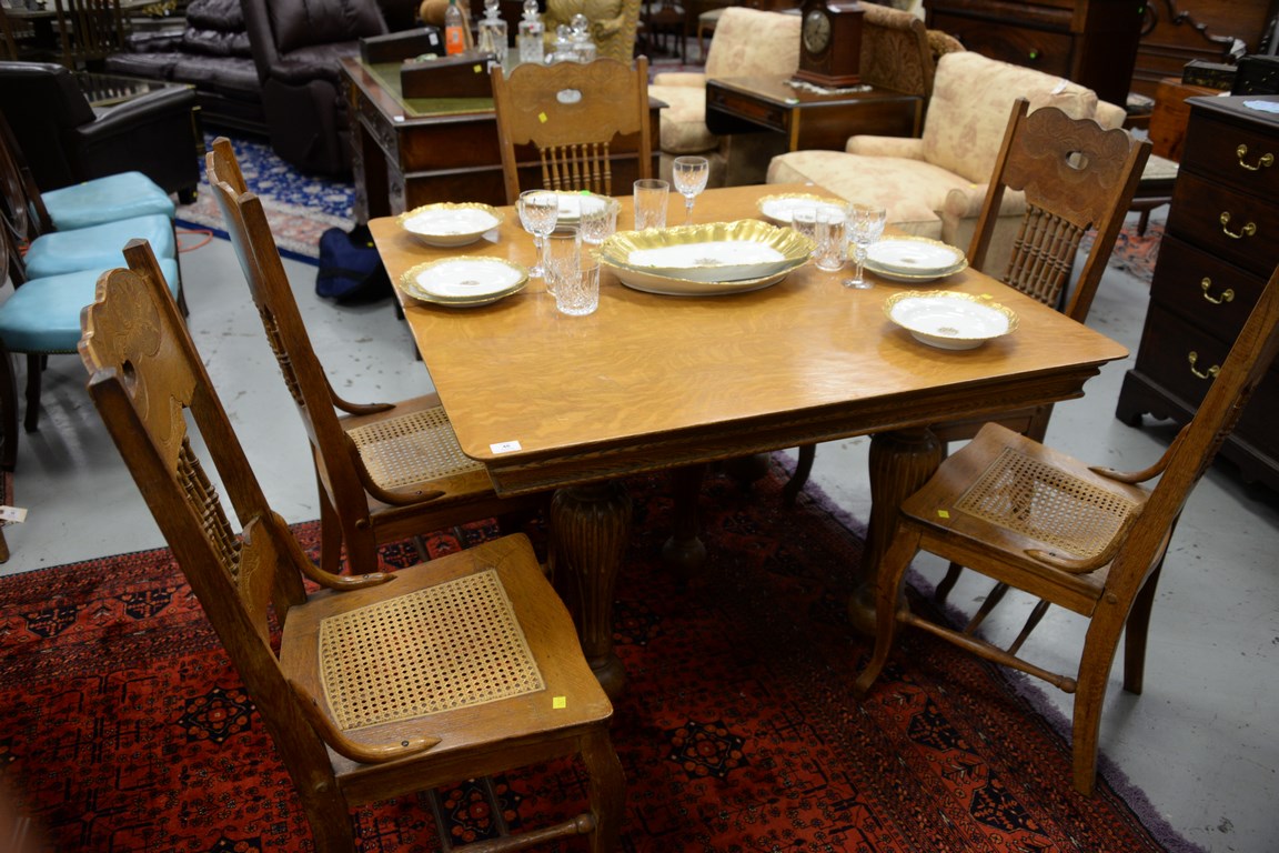 Lot 46: Victorian square oak table with two leaves and five chairs one seat caning need replacement. ht. 29 1/4 in. top: 45 x 45