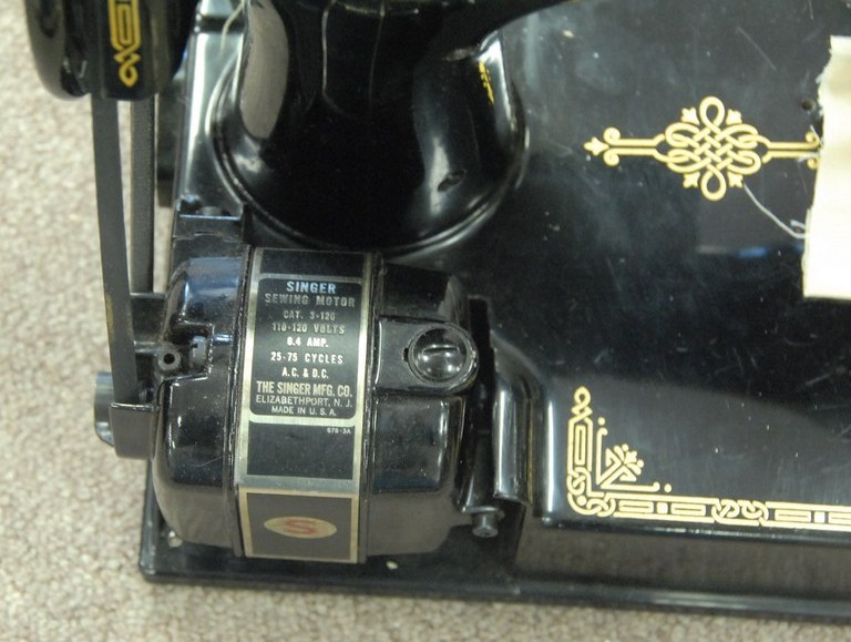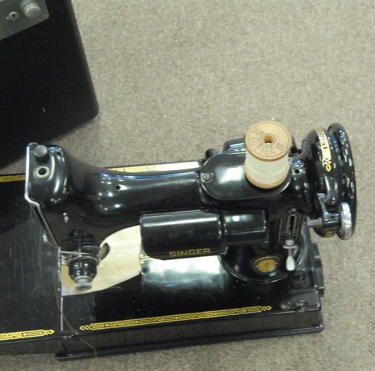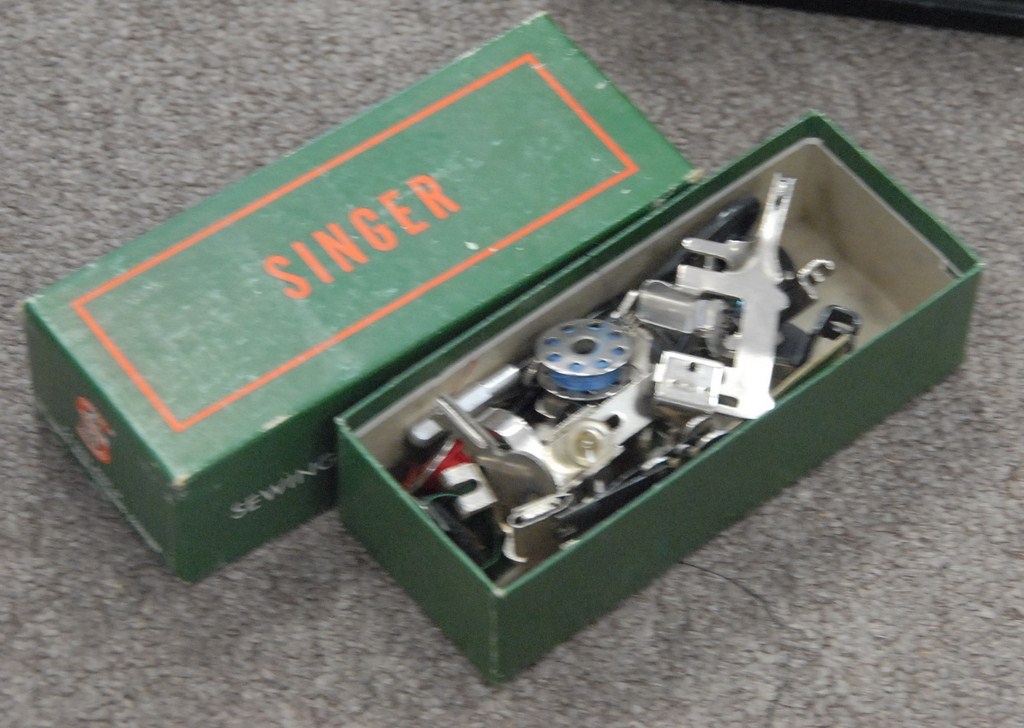 Vintage Singer sewing machine in original black carrying case with attachments inside.