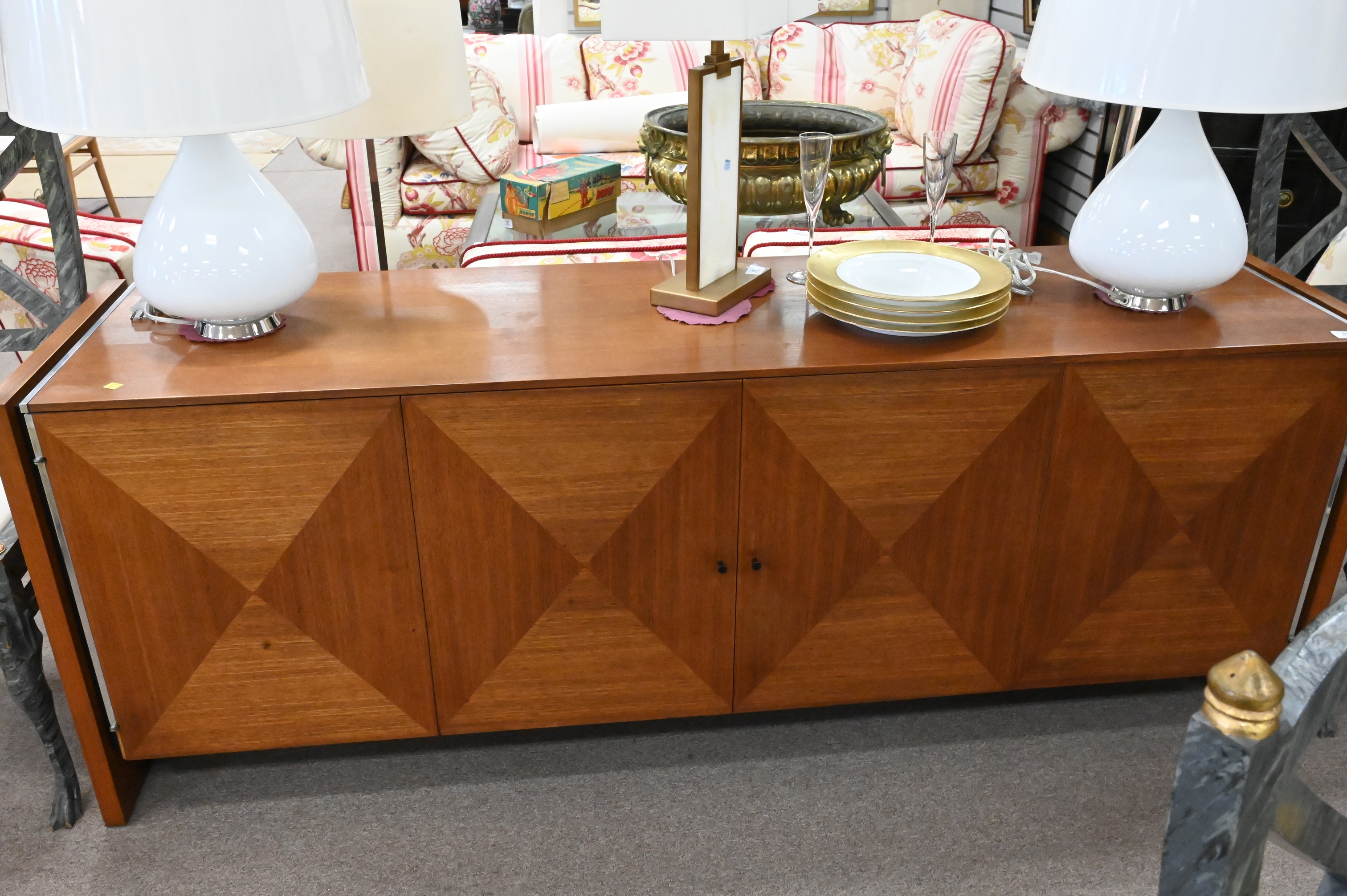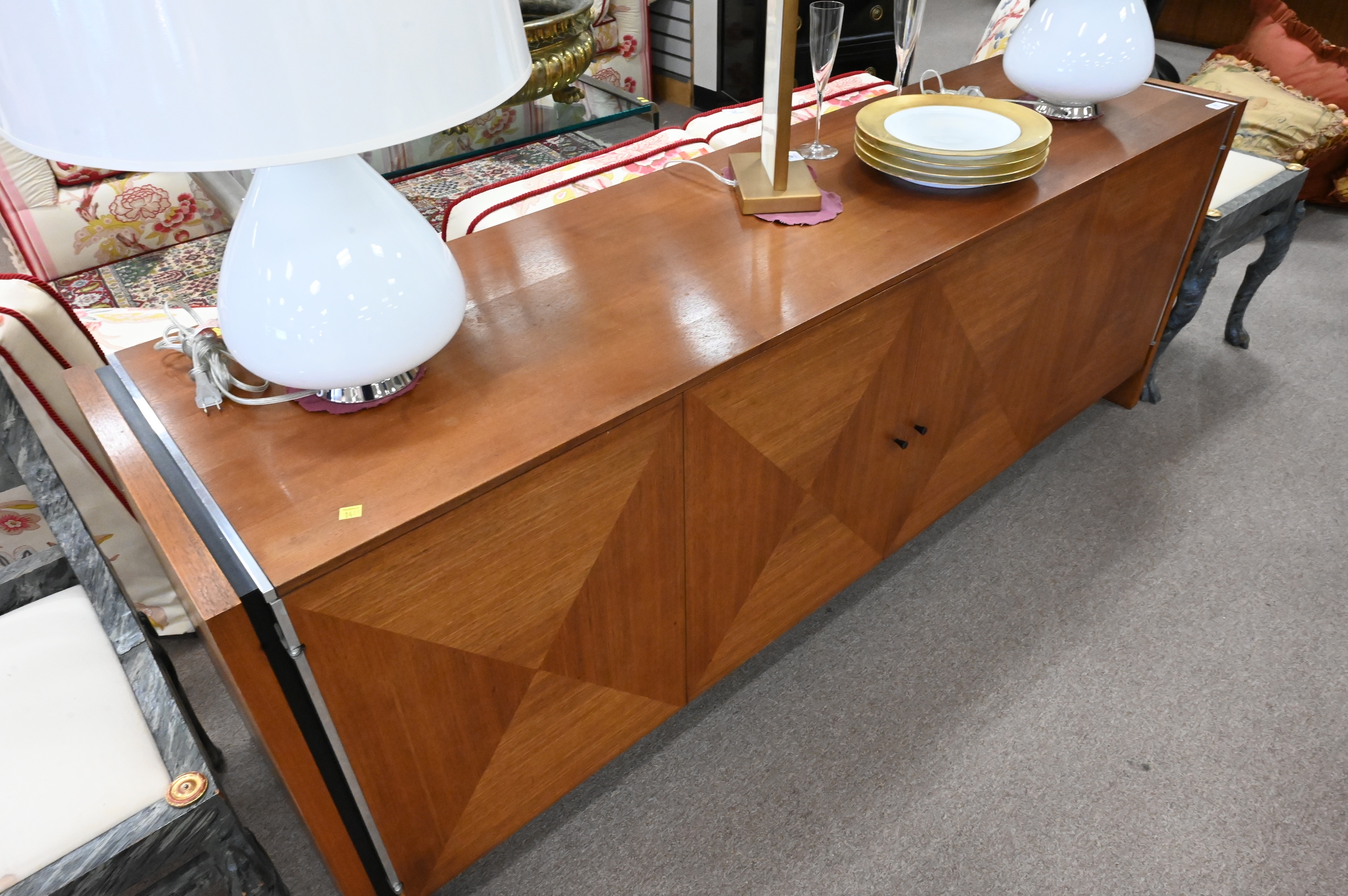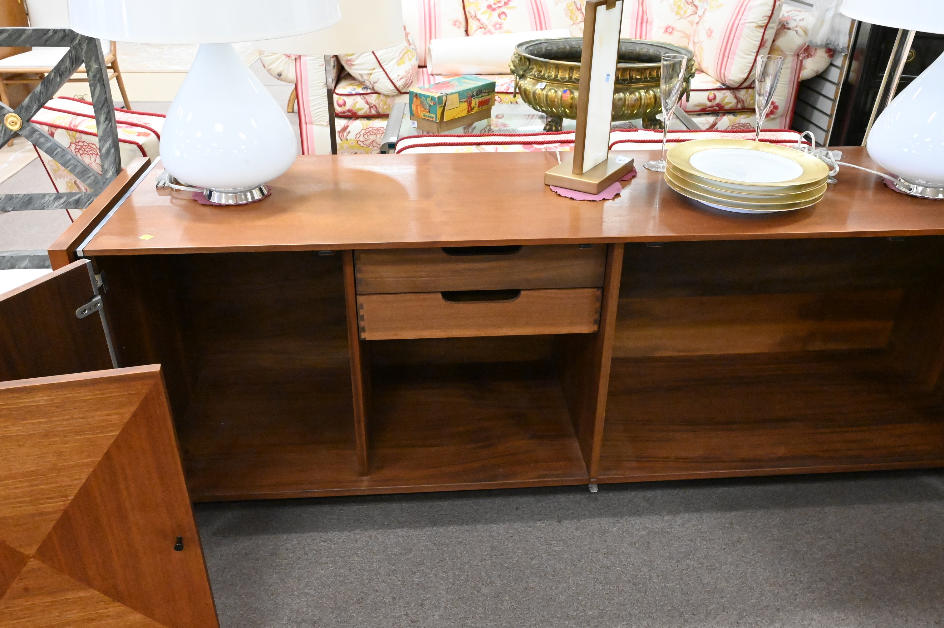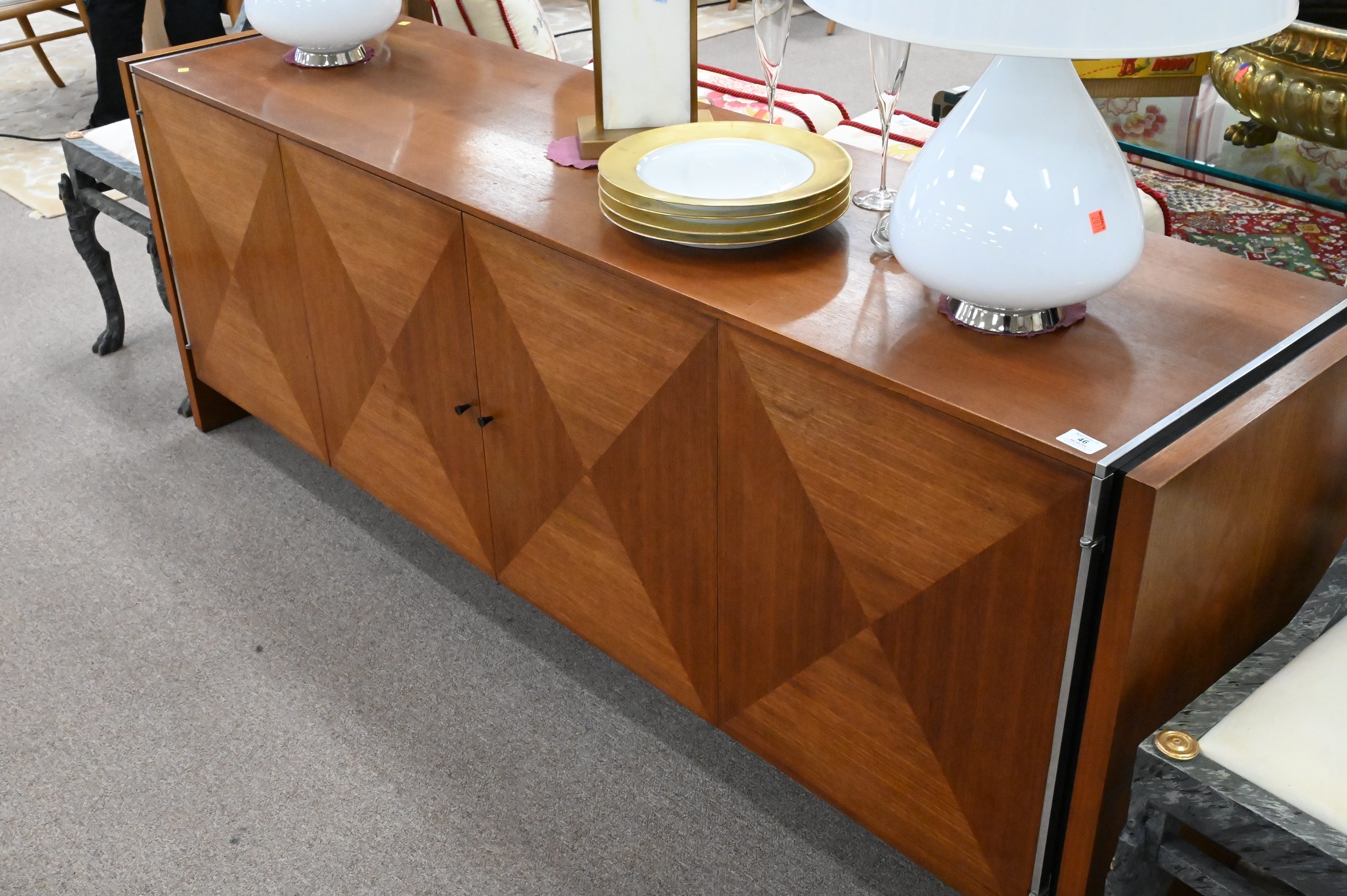 Walnut John Stuart Inlaid Credenza, having four drawers, height 28 1/2 inches, top 20″ x 77 1/2″.