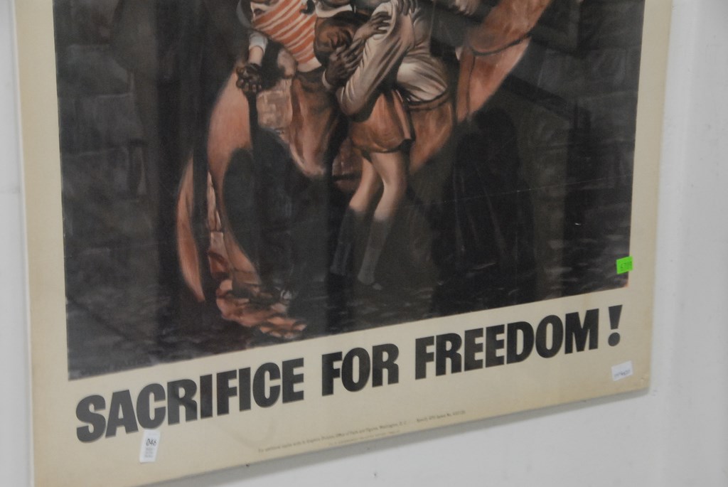 Lot 46: World War II poster This World Cannot Exist Half Slave and Half Free Sacrifice for Freedom, 40 x 28.