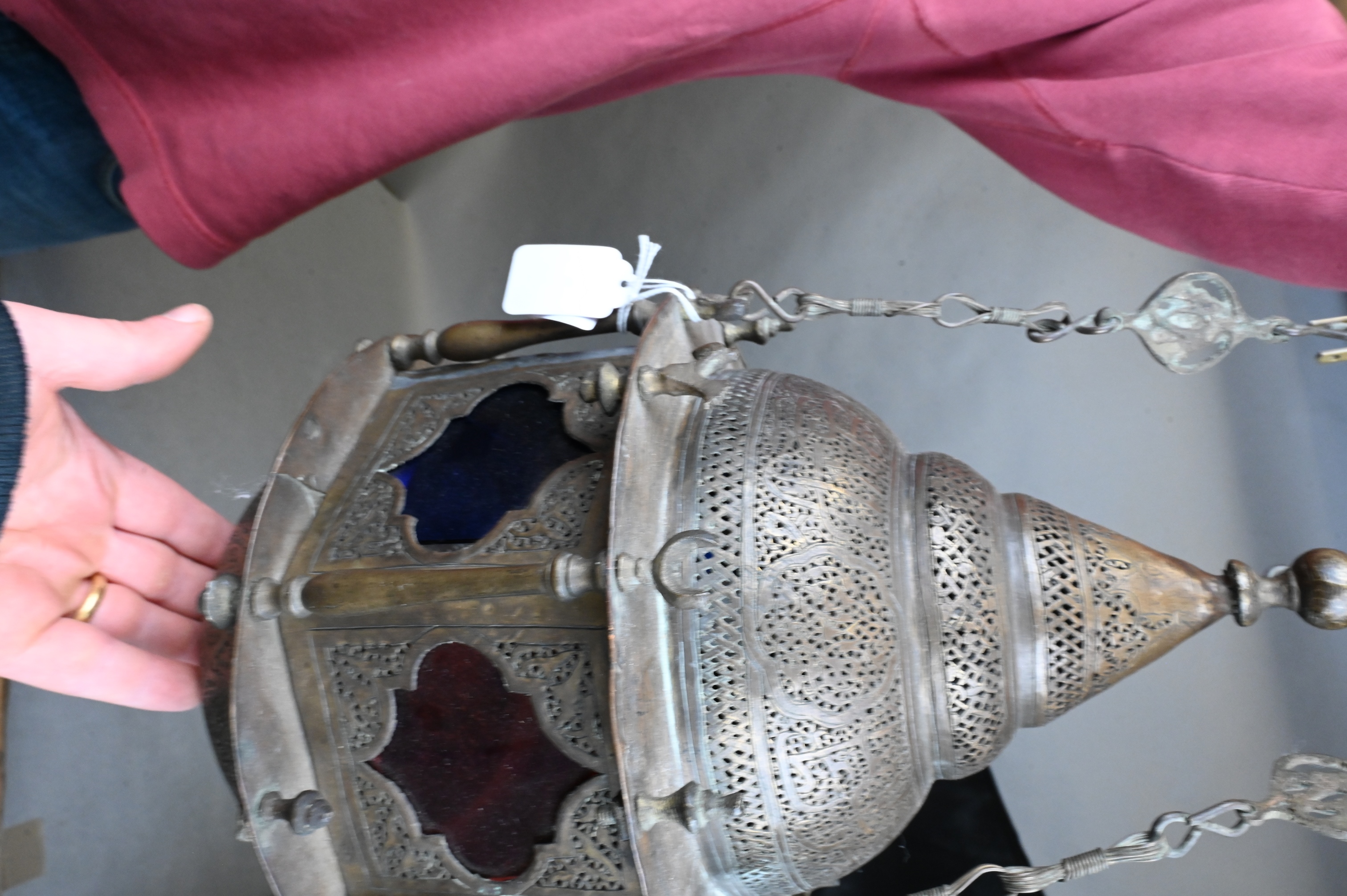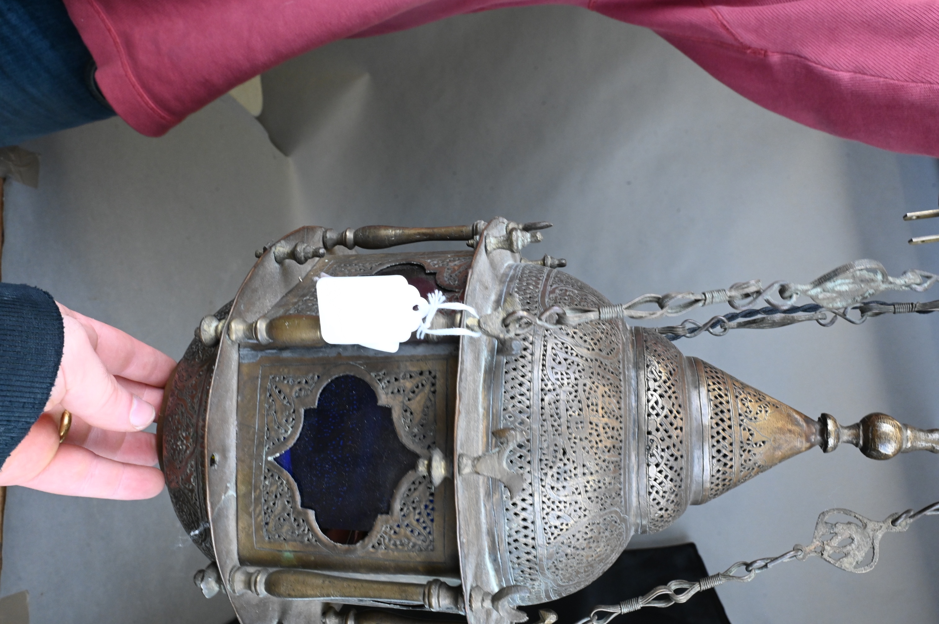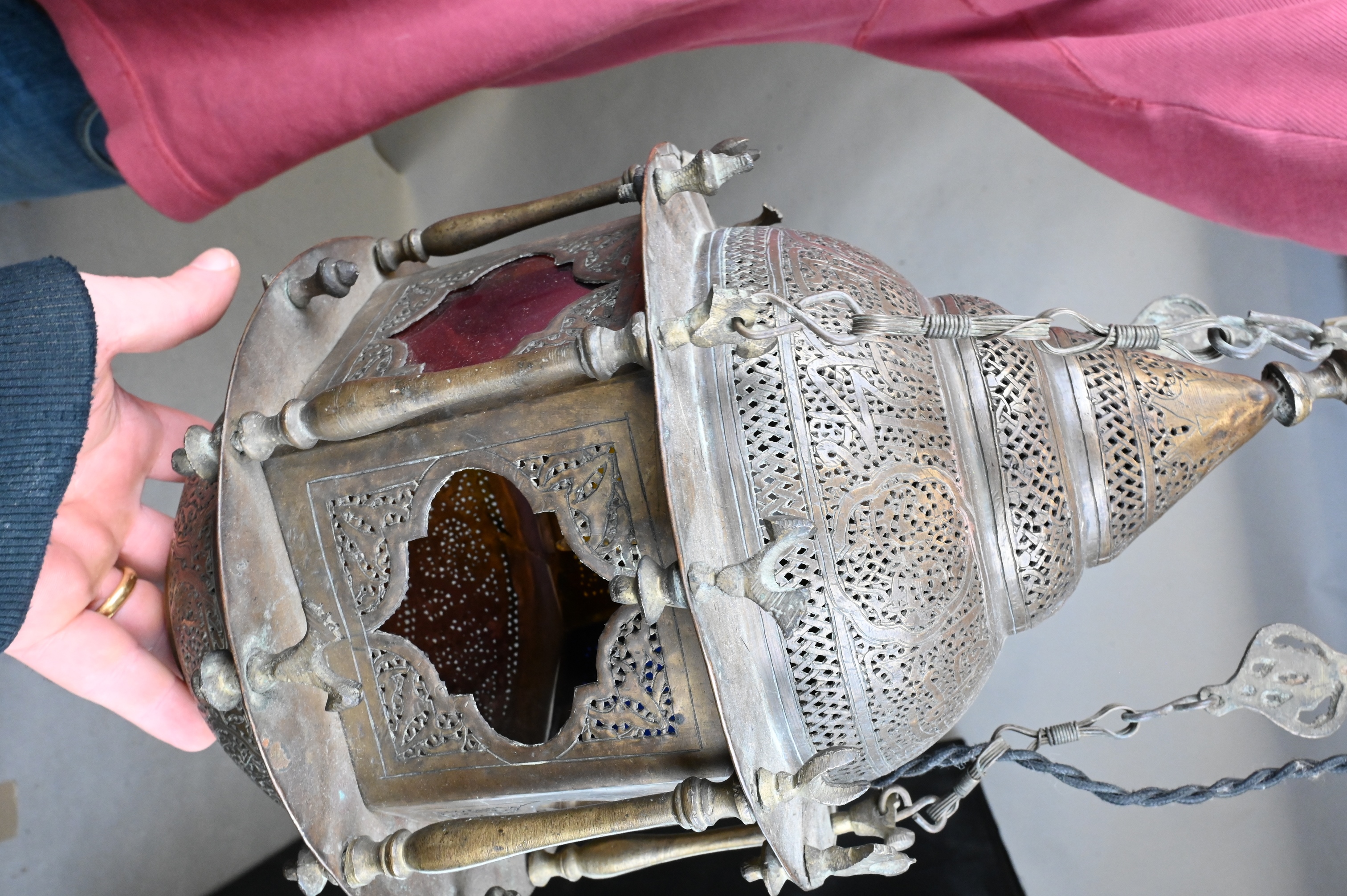 pierced brass having stained glass and Islamic motif throughout, woven electrical cord