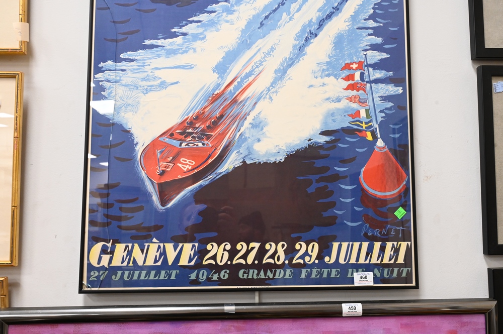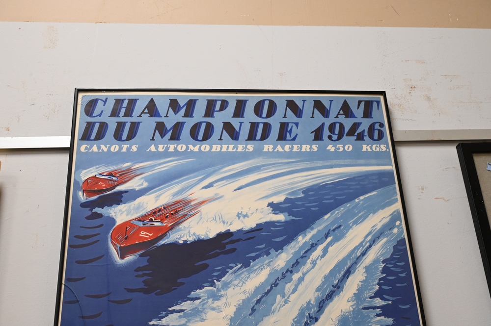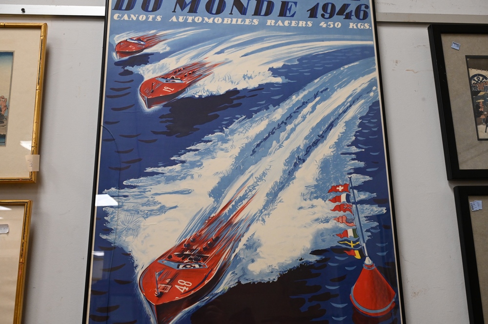 Lot 460: Championnat Du Monde, 1946, poster, depicting boat race, Geneve 26. 27. 28. 29. Juillet after Pernet, 39″ x 25″.