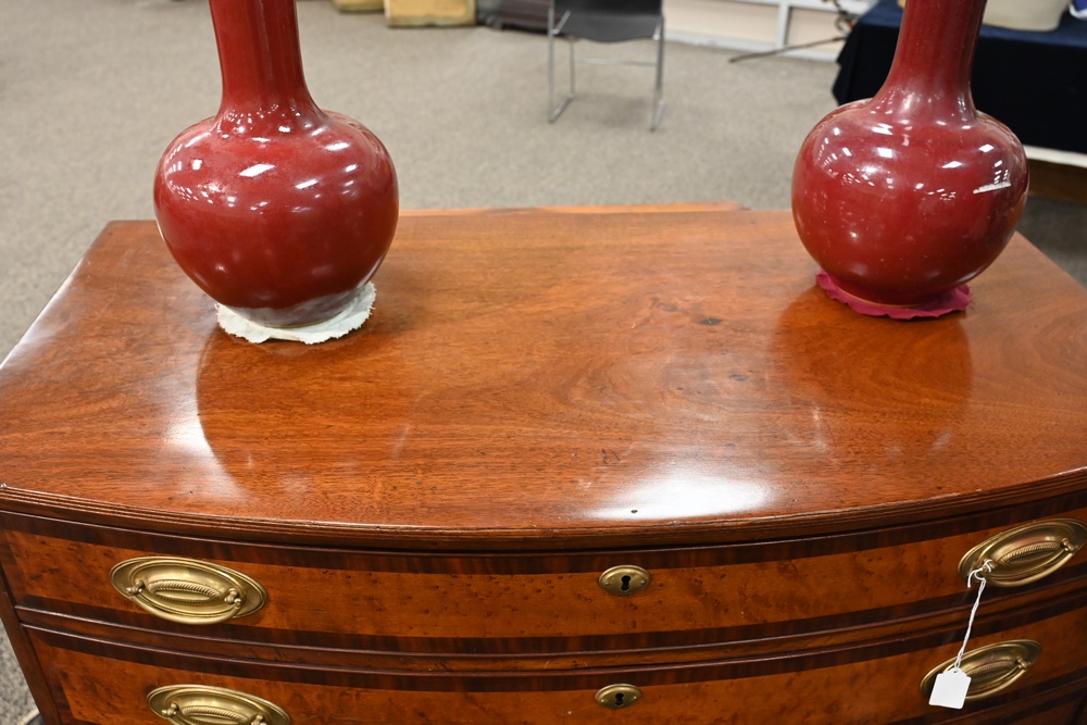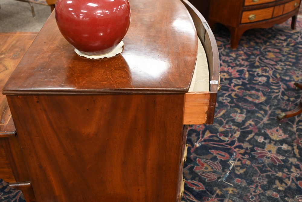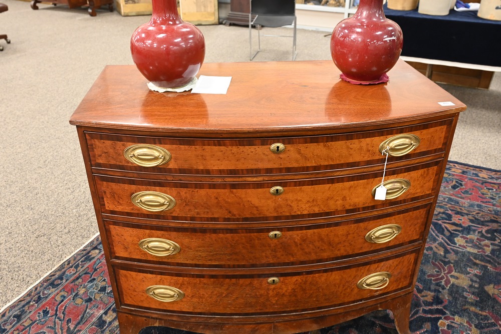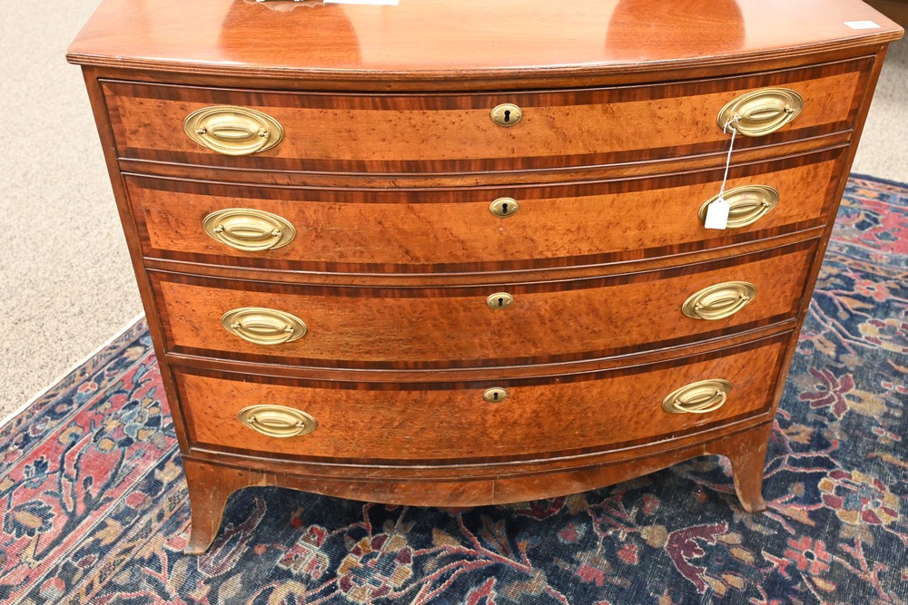 Lot 460: Federal Mahogany Chest having bowed front, four birdseye maple drawers with mahogany surrounds set of flared French feet circa 1790 height 36 inches, case width 40 inches, top 21 3/4 x 41 inches