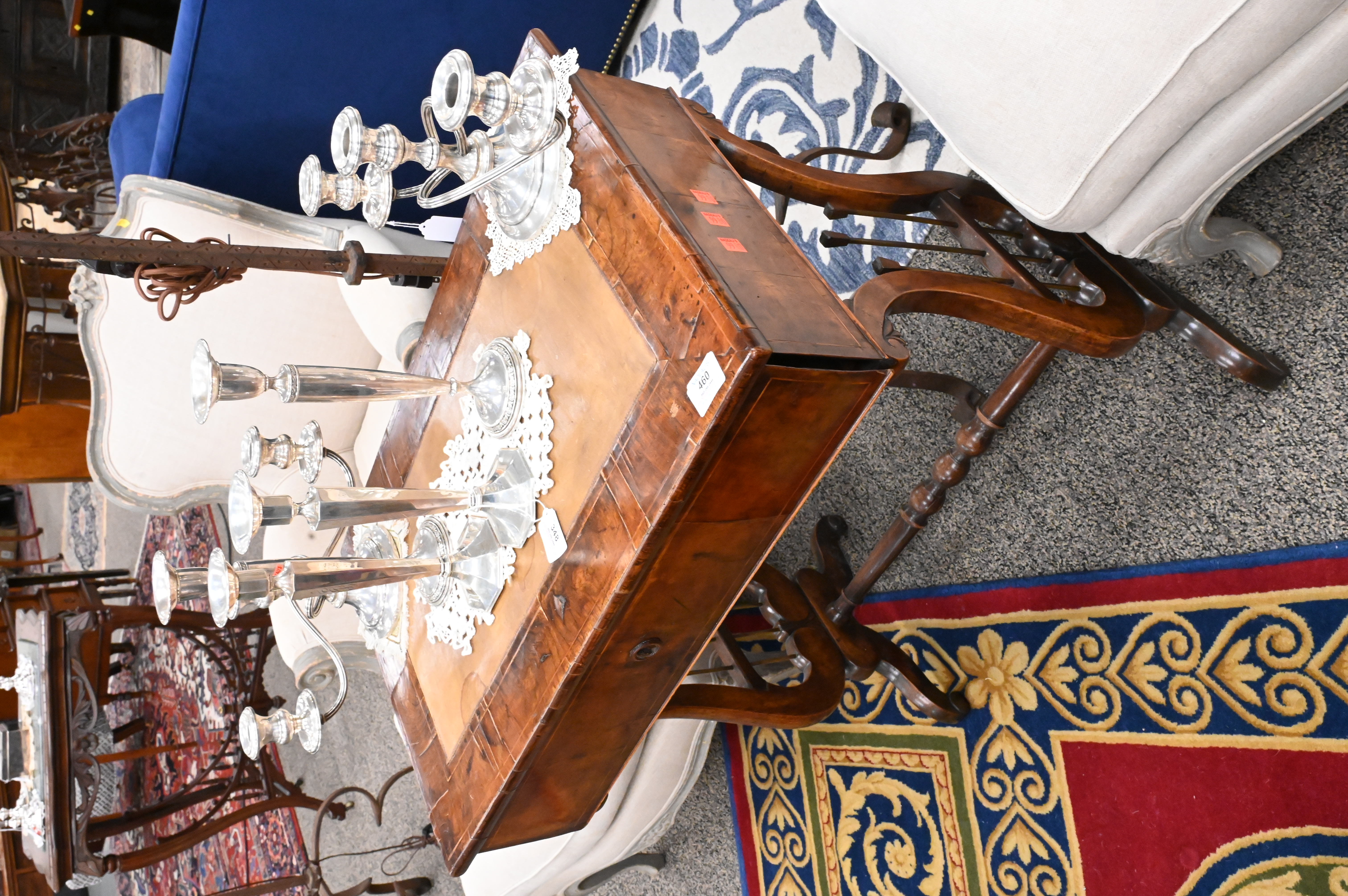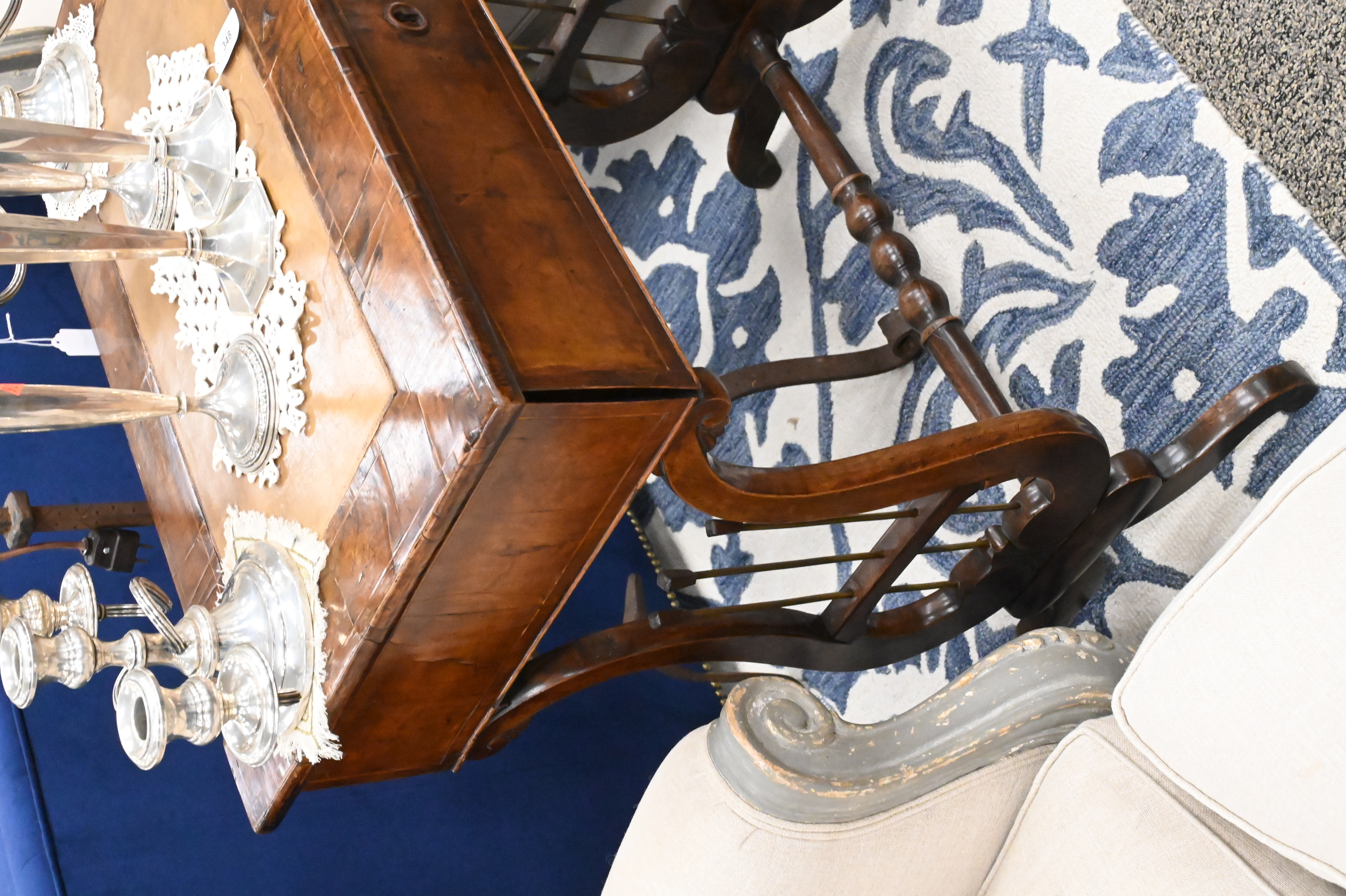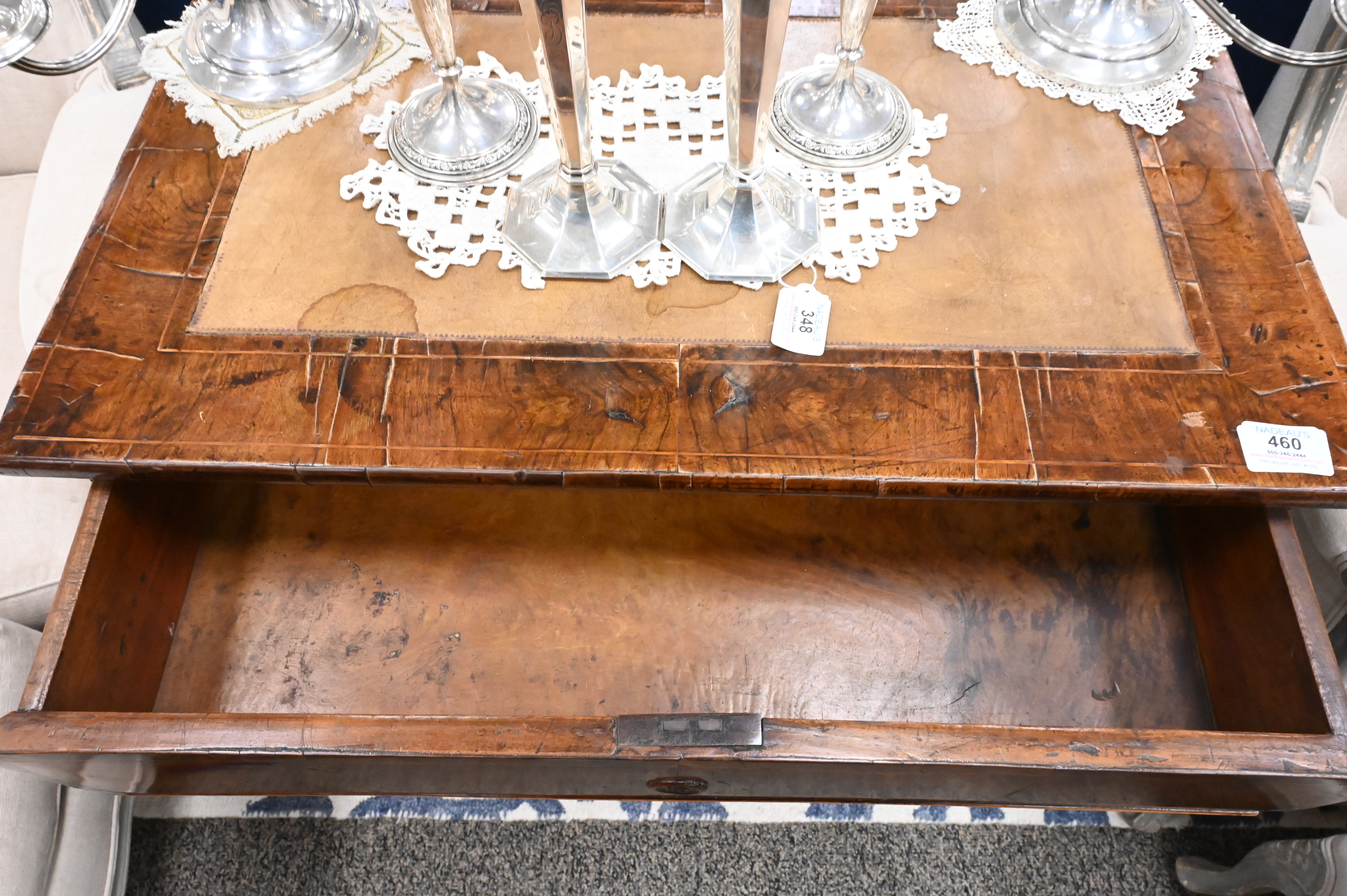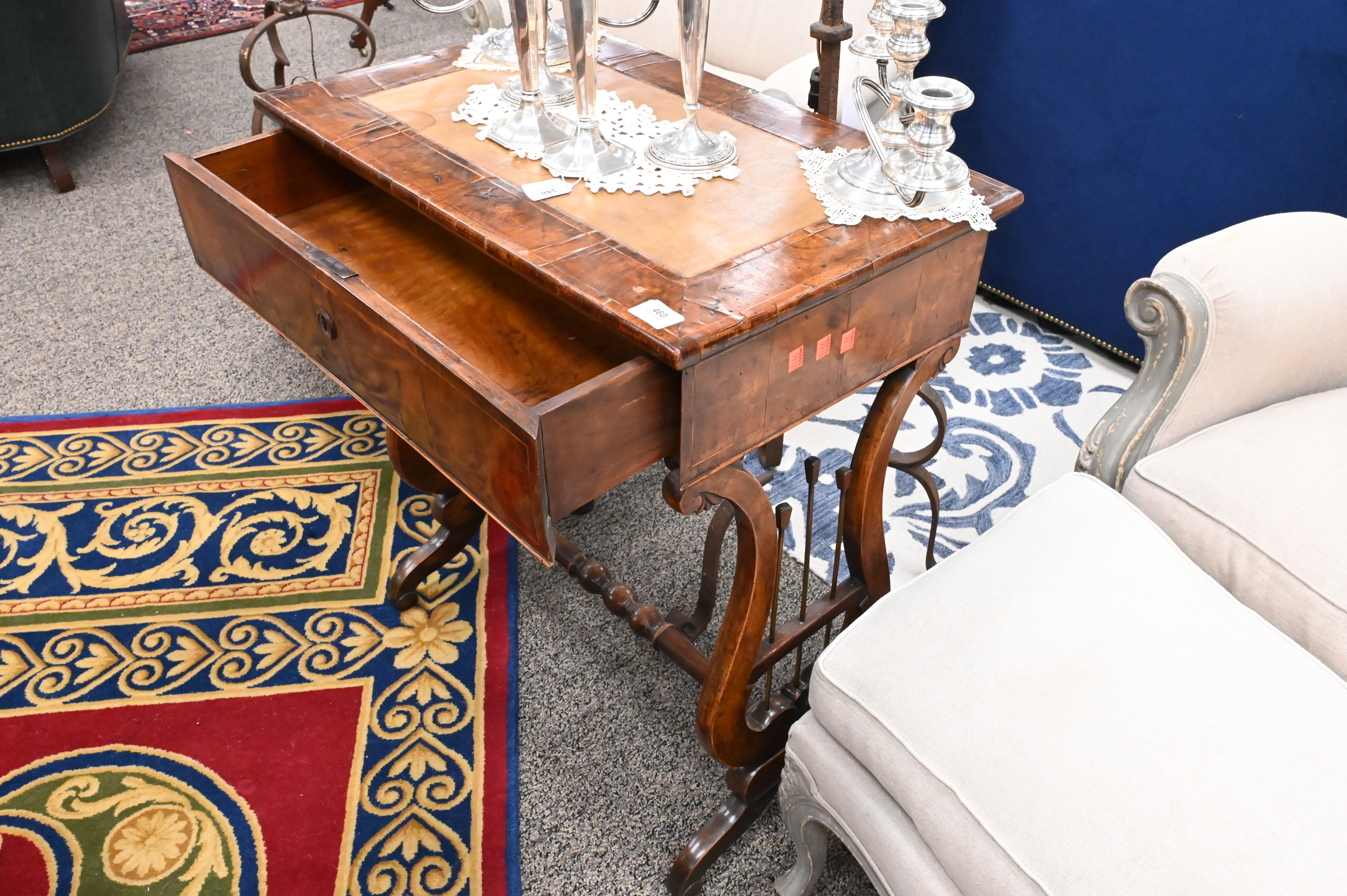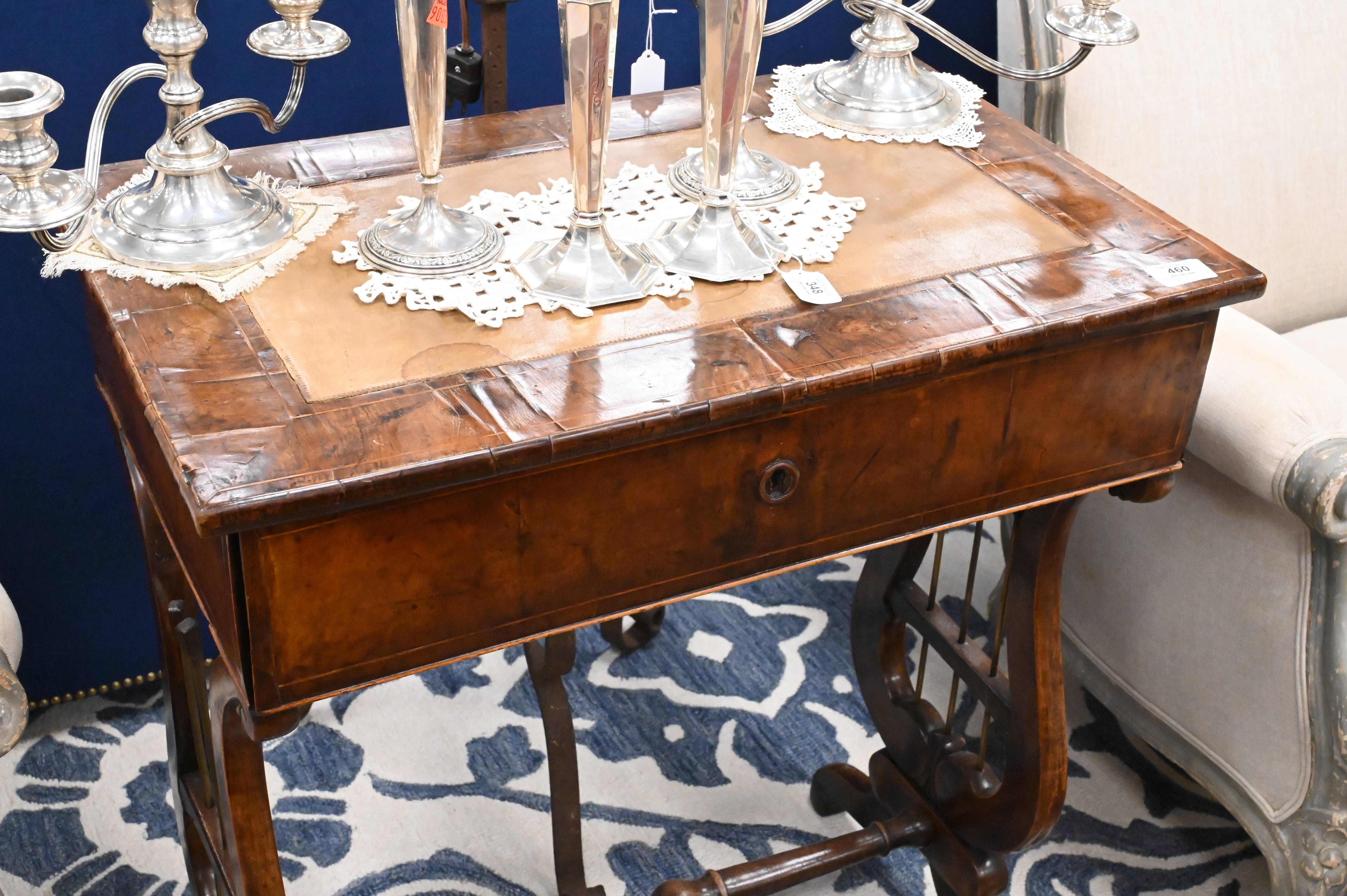 George III Walnut Work Table, having inset leather top, circa 1840, height 30 inches, top 16 3/4″ x 26 3/4″.