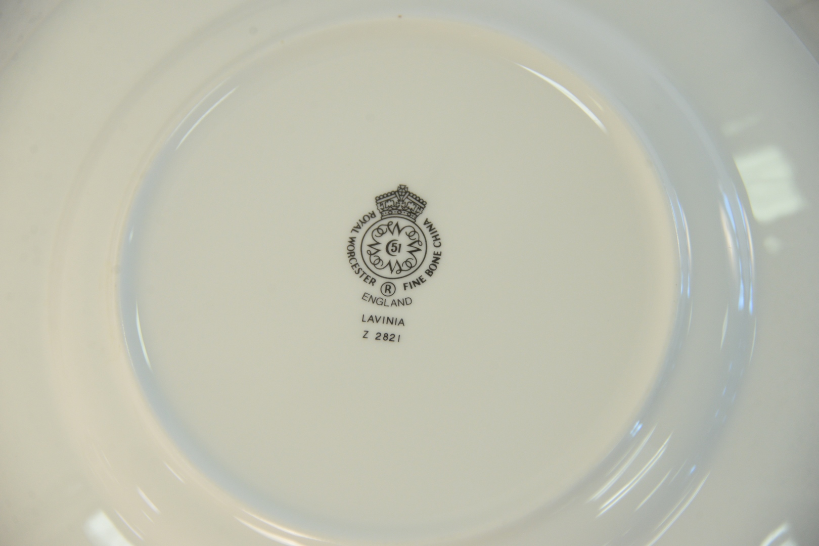 Royal Worcester Lavinia Set of China, one hundred and twenty four pieces to include 16 dinner plates, 16 briar bouillon cups, 16 saucers, 16 cups, 13 saucers, 16 dishes, 16 bread plates, 15 luncheon plates.