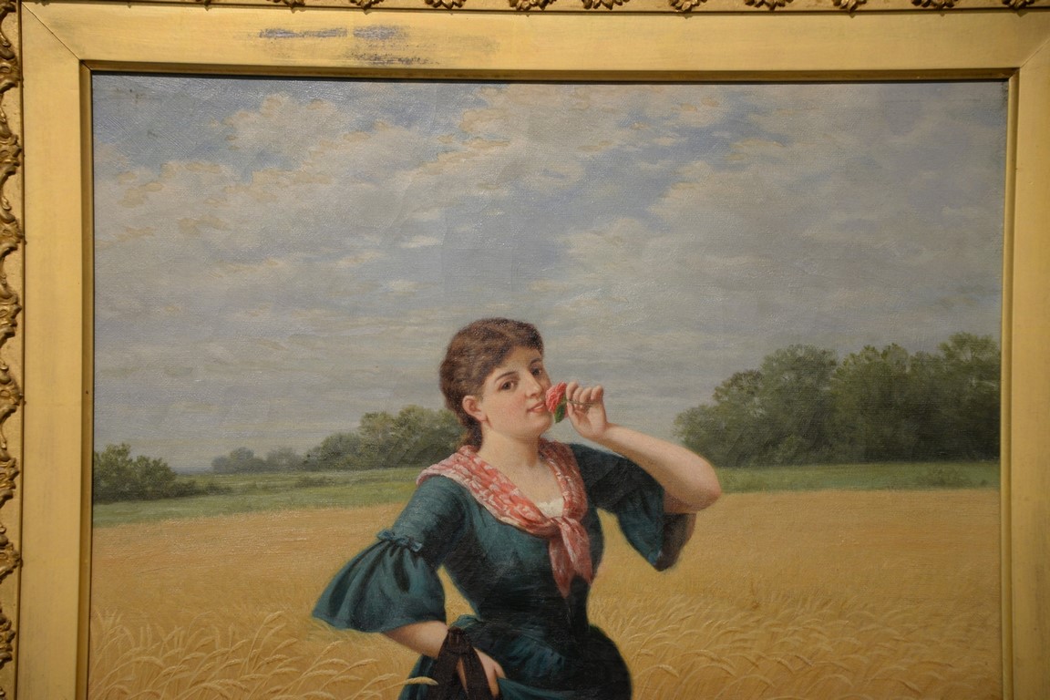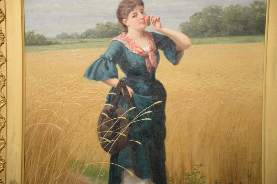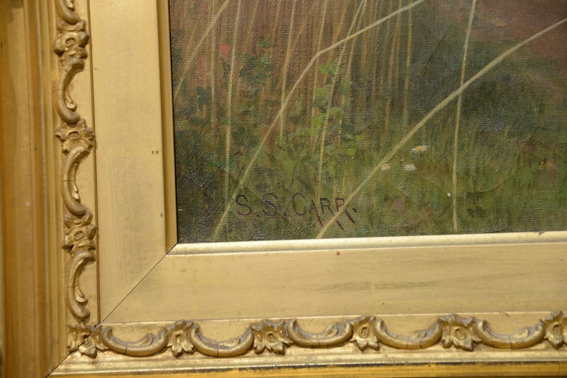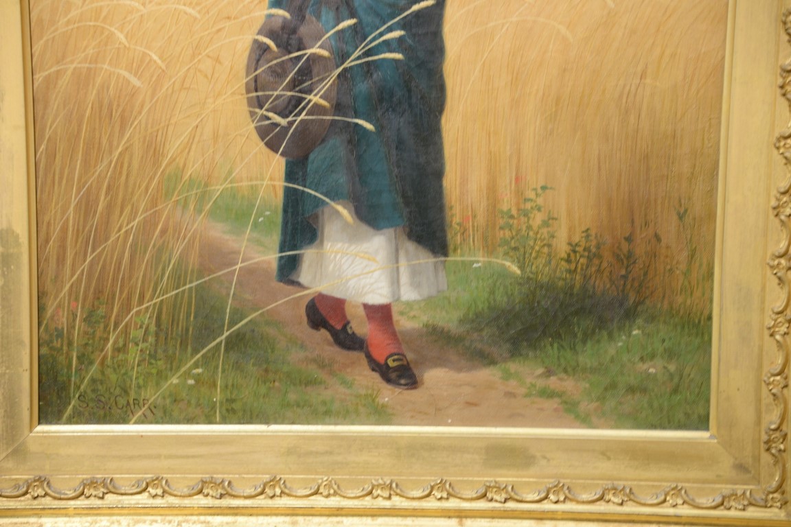 Lot 460: Samuel S. Carr 1837-1908, oil on canvas, Girl Smelling a Rose in a Hay Field, signed lower left: S.S. Carr, 24 x 18