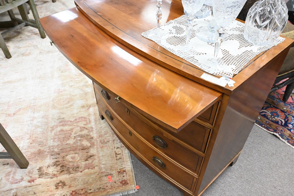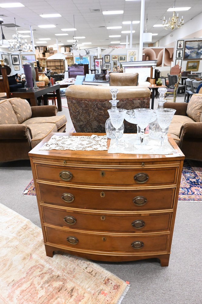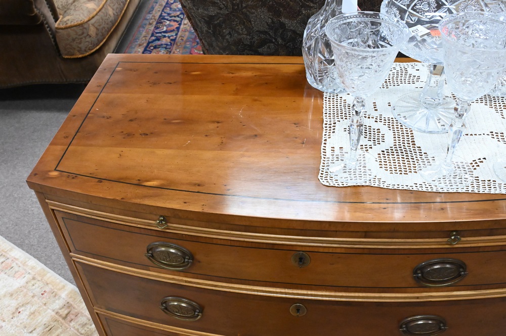 Lot 461: Baker Elm Bachelors Chest, having pullout slide over four bowed drawers, height 32 inches, top 18″ x 34″.