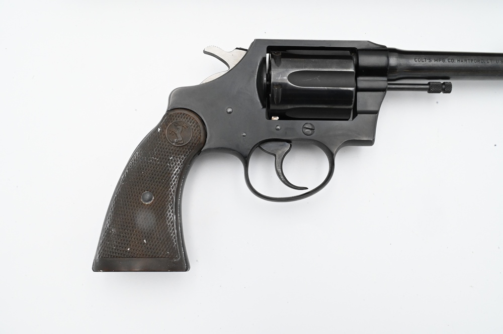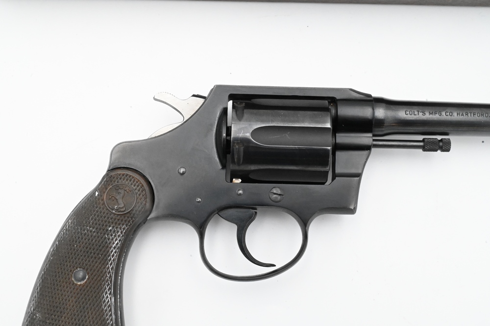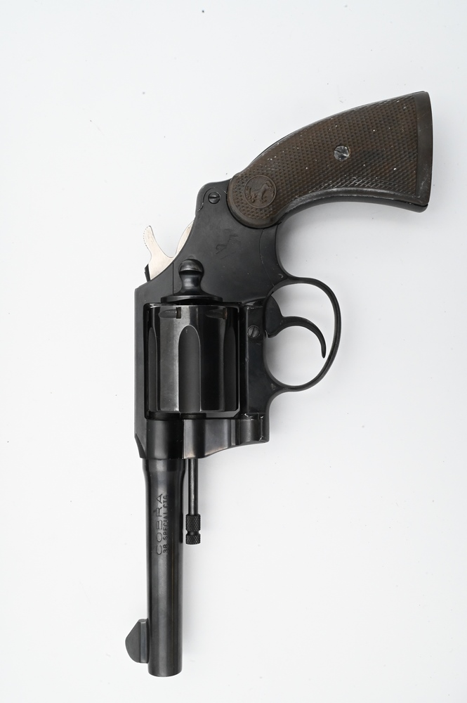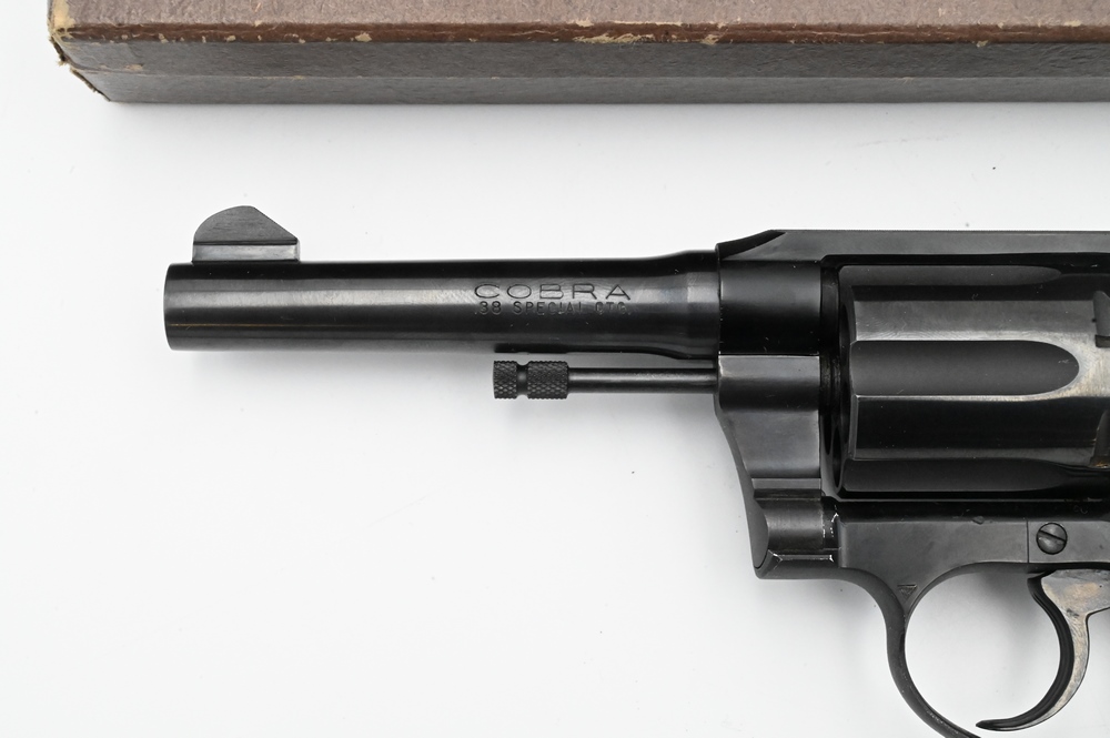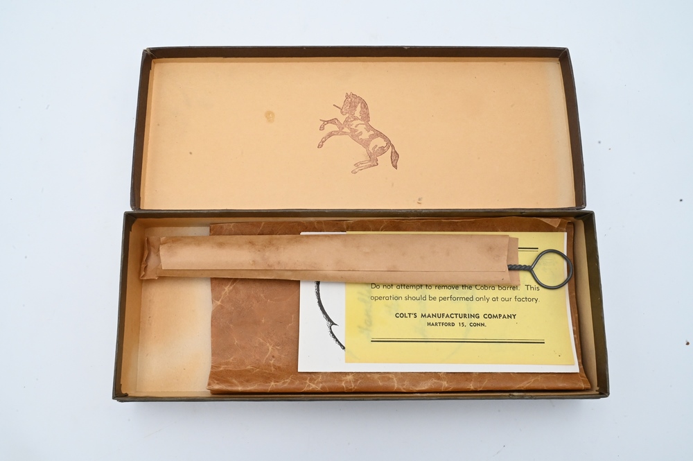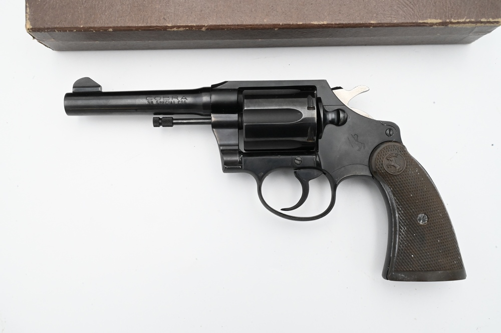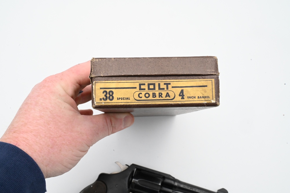 Colt Cobra .38 Special Revolver, having 4 inch barrel, original box included, having serial number written on bottom, along with paperwork. Provenance: Fifty Year Personal Collection of Clocks and American Antiques from Thomas Bailey, Manchester, Connecticut.