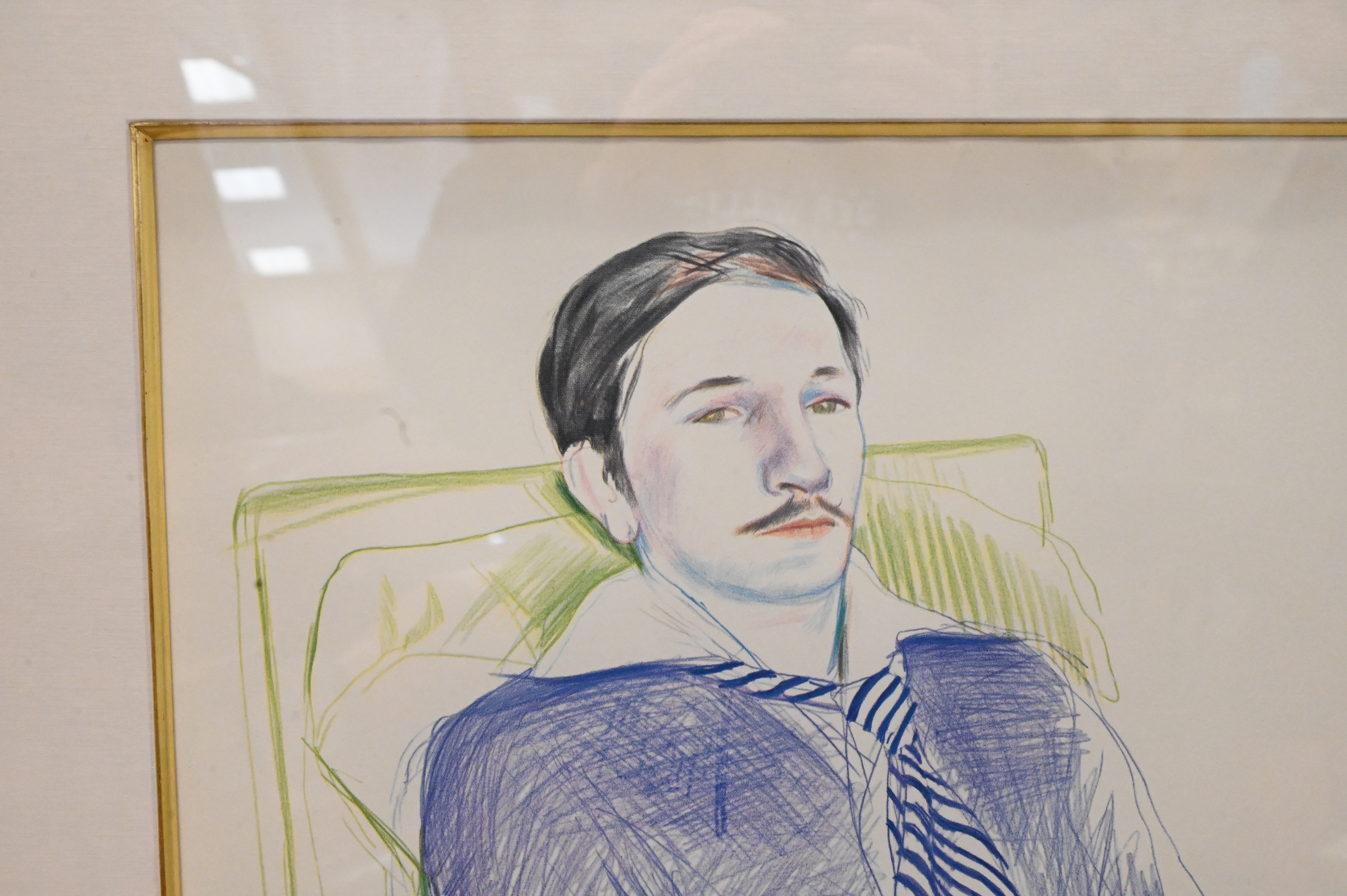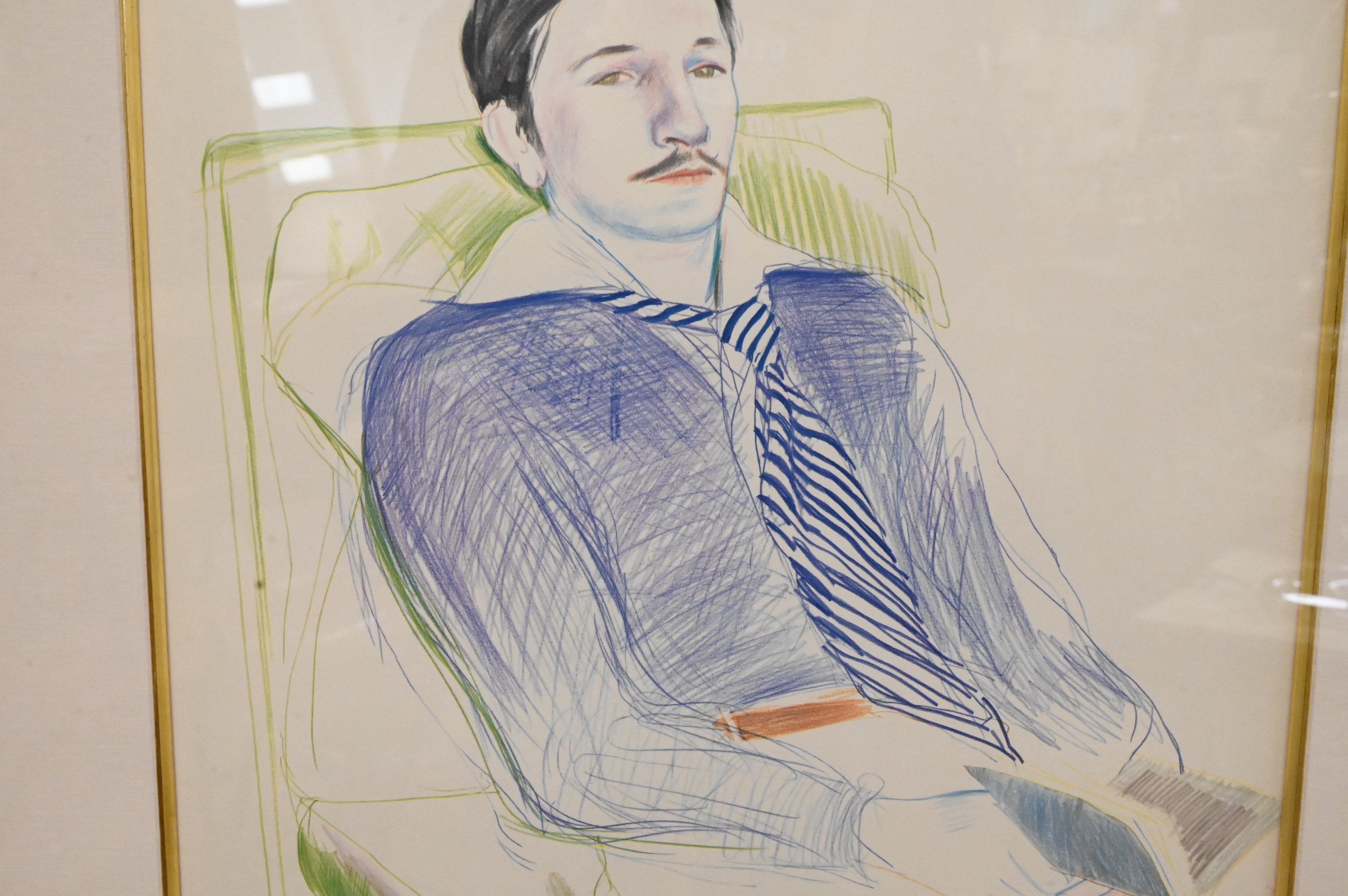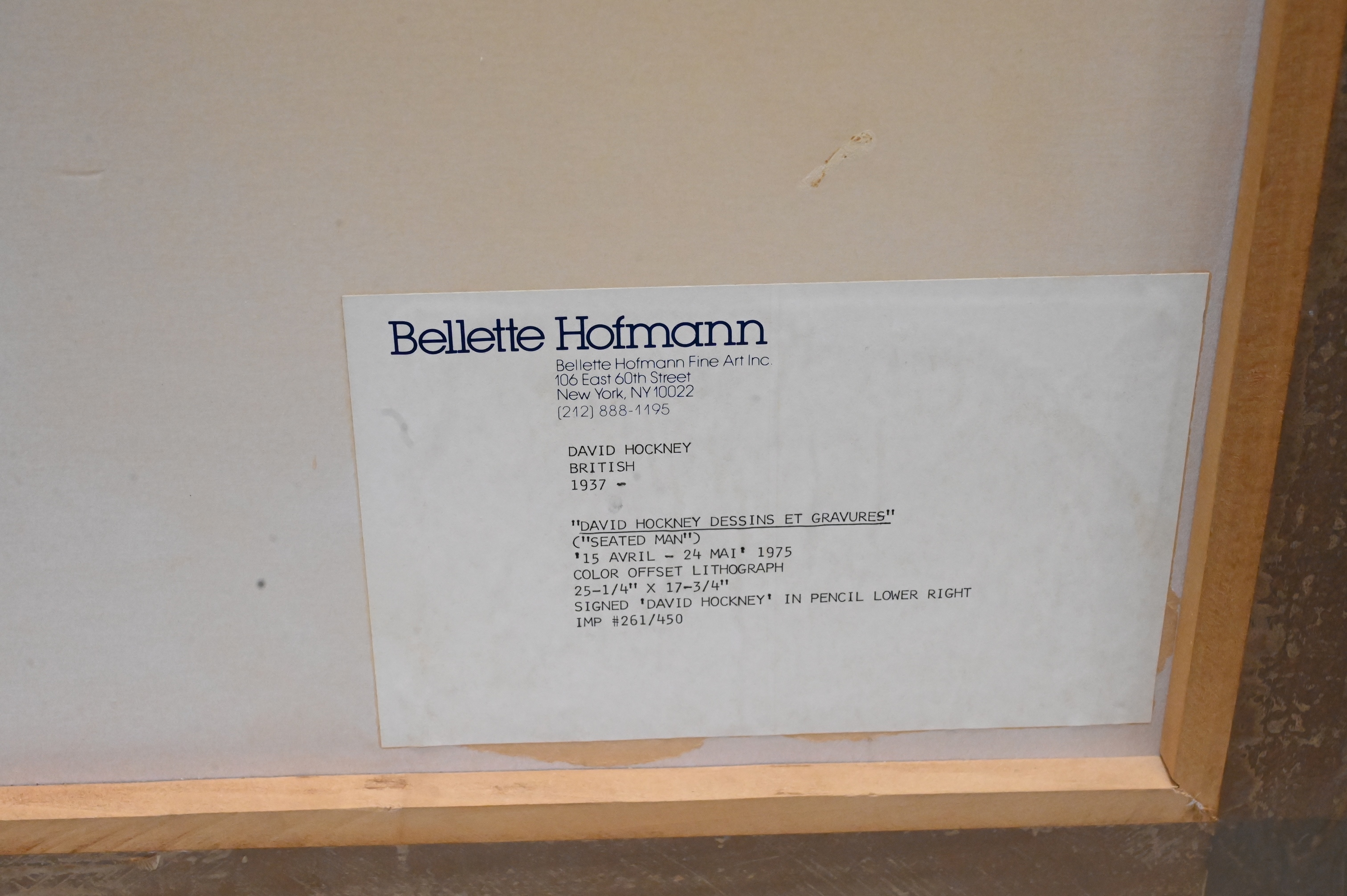 David Hockney (b. 1937), color offset lithograph, “David Hockney Dessins et Gravures”/”Seated man”, signed David Hockney in pencil lower right #261/450, sight size 23″ x 17″, Bellette Hofmann Fine Art, NY label on back.
