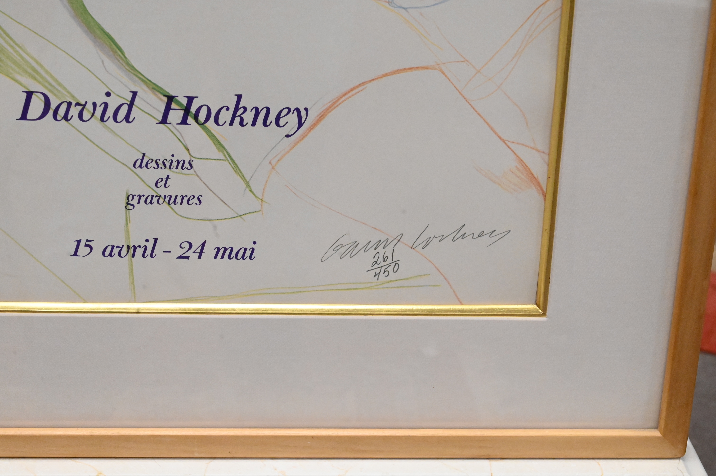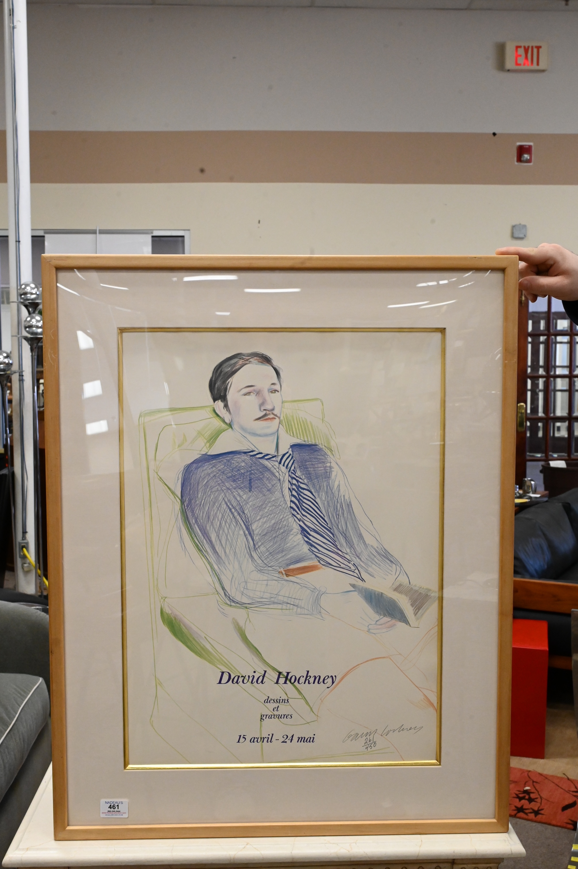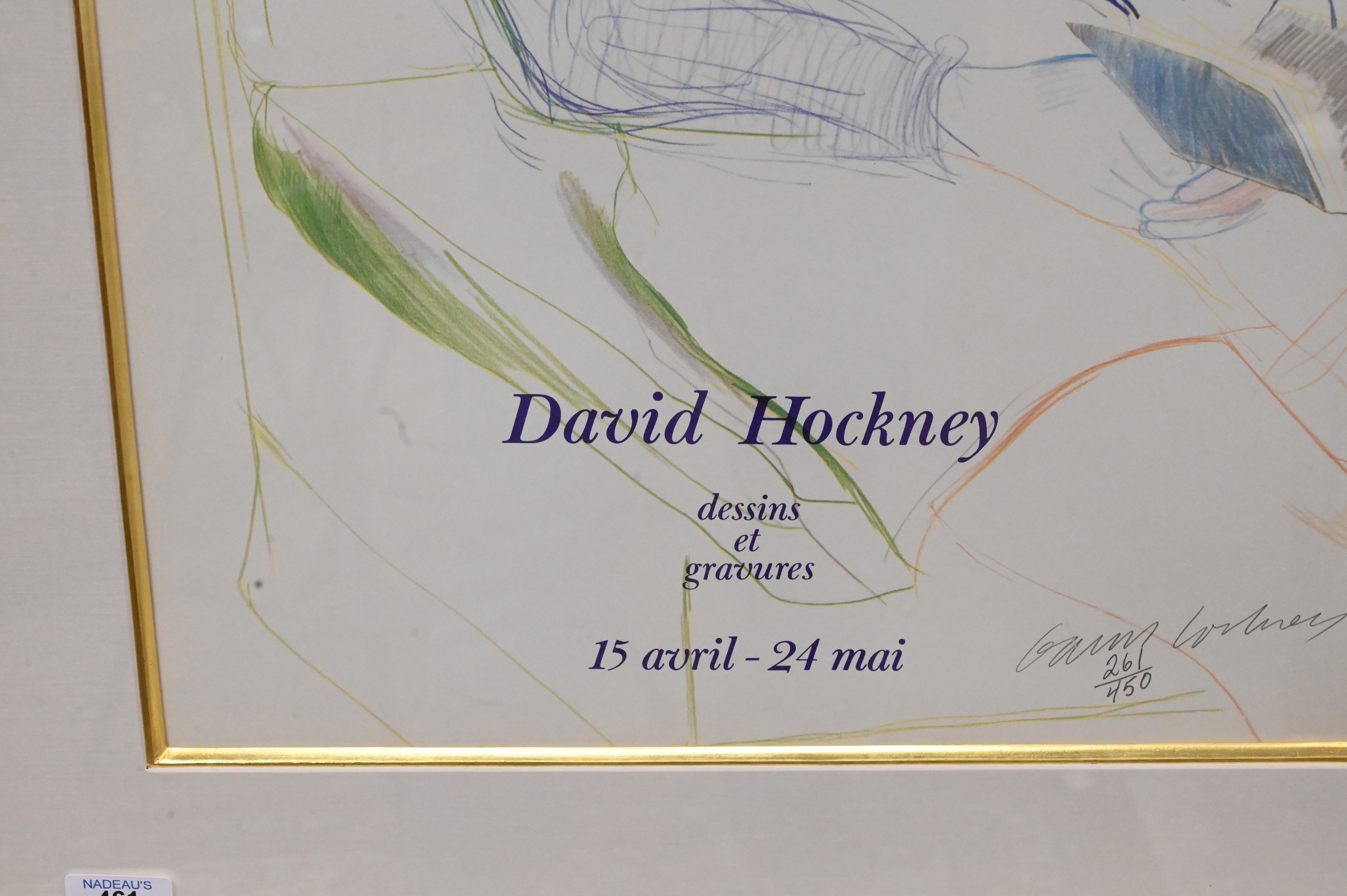 David Hockney (b. 1937), color offset lithograph, “David Hockney Dessins et Gravures”/”Seated man”, signed David Hockney in pencil lower right #261/450, sight size 23″ x 17″, Bellette Hofmann Fine Art, NY label on back.