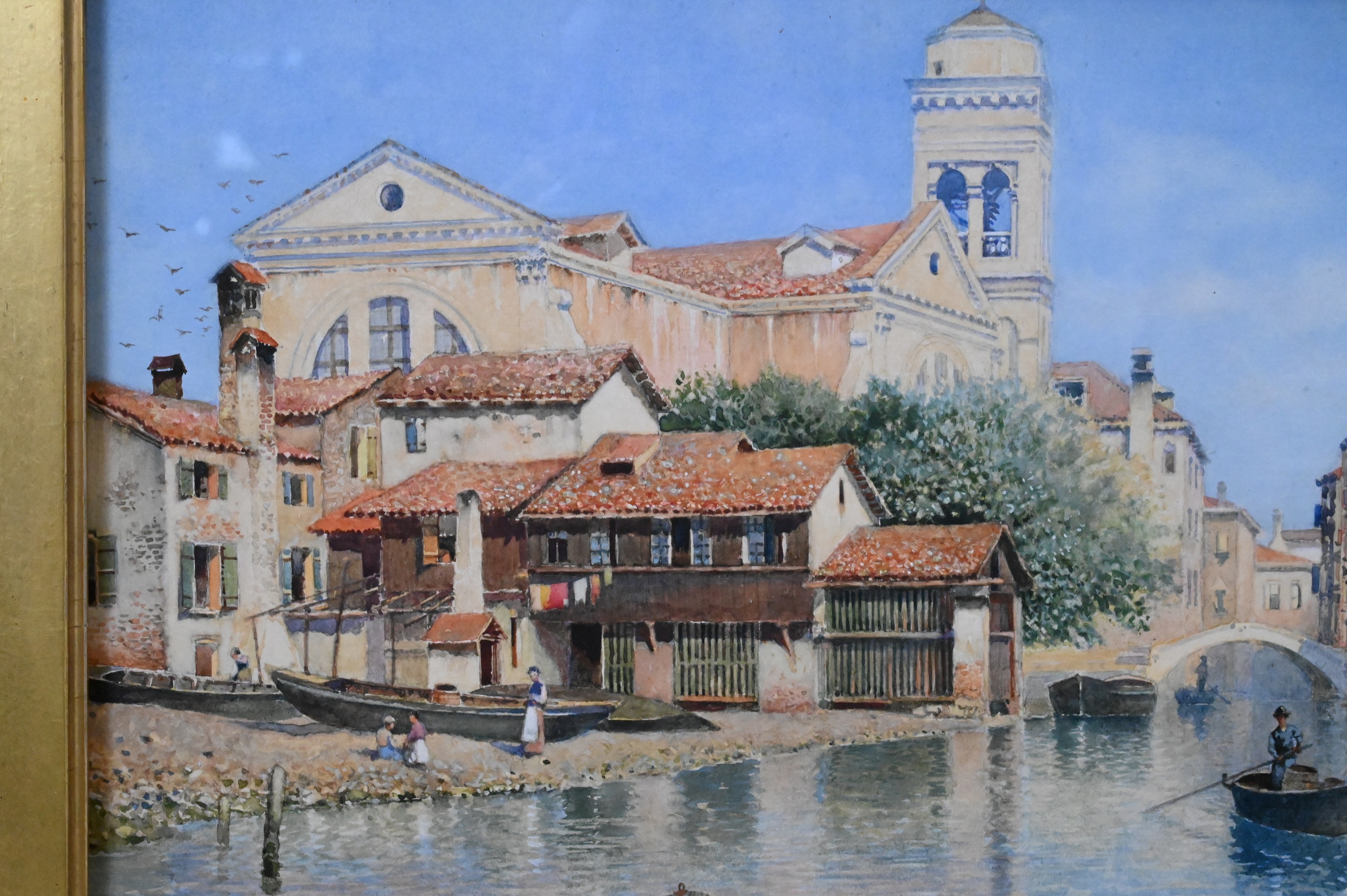 View showing a quiet canal animated by a gondolier at work in the foreground. To the left, a cluster of stucco and brick dwellings with red-tiled roofs rise directly from the water’s edge, their reflections shimmering in the calm surface. Beyond, a domed Renaissance-style church and bell tower dominate the skyline, while soft atmospheric light plays across the architecture and sky