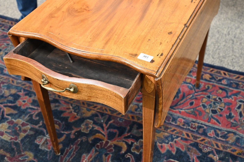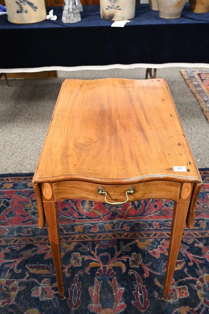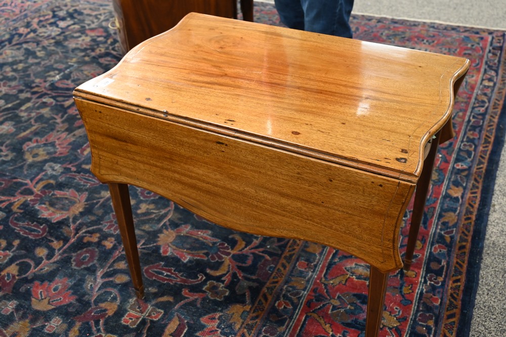 Lot 461: Mahogany Pembroke Drop Leaf Table having serpentine top with serpentine drawer set on square tapered legs with oval panel inlays restored Baltimore circa 1790 height 28 inches, top open 31 x 38 1/2 inches, top closed 19 1/2 x 31 inches