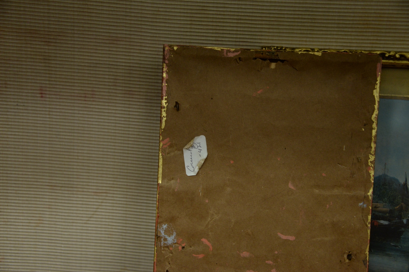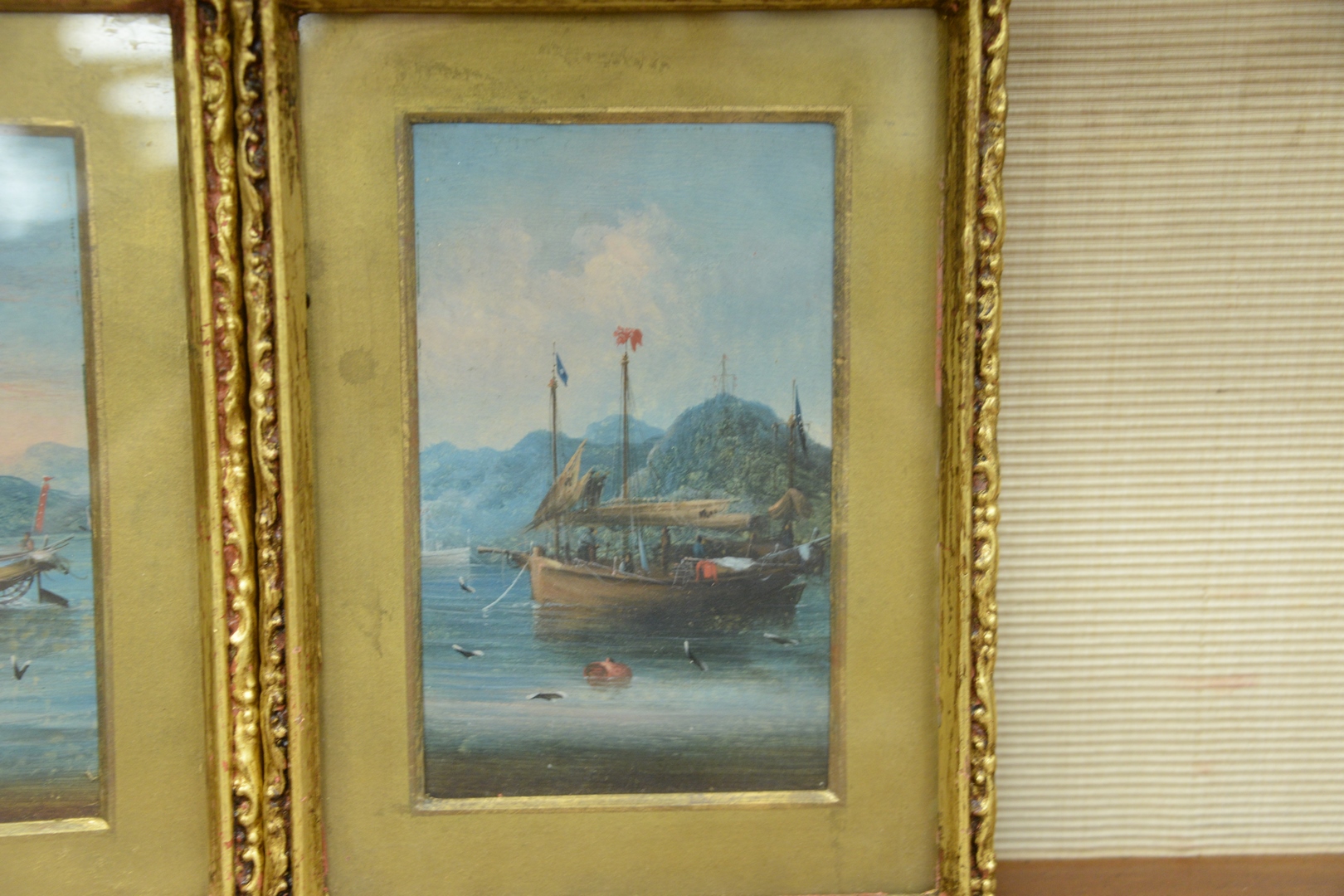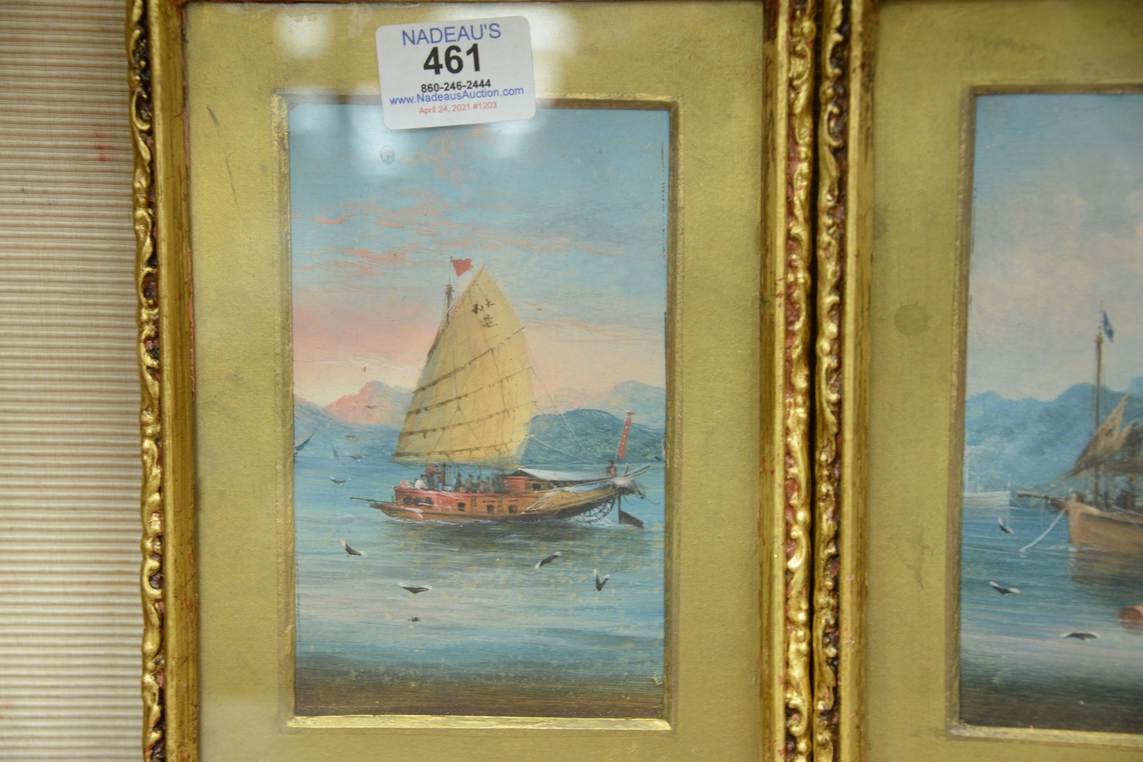 Lot 461: Pair of Chinese School Paintings, oils on panel, each depicting landscape with Chinese junk or sailboat with figures, one signed on sail, the other unsigned, 19th Century, sight size: 6 x 4. Provenance: The Estate of Ed Brenner, Short Hills, New Je