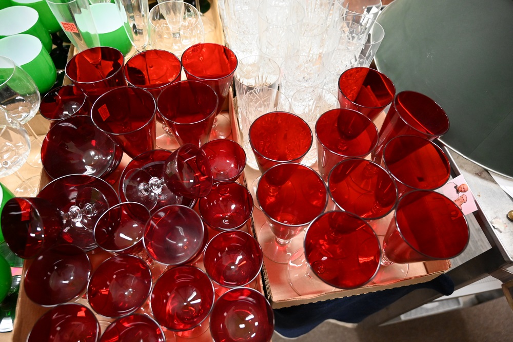 Lot 461: Seven Tray Lots of Glass Stems and Glasses, to include 12 matching champagnes, water glasses marked Rogaska, red wines, four martini glasses, a tray of unmarked sherry glasses having hexagonal bases, along with two trays of ruby red stems, height of water glasses 5 1/2 inches.